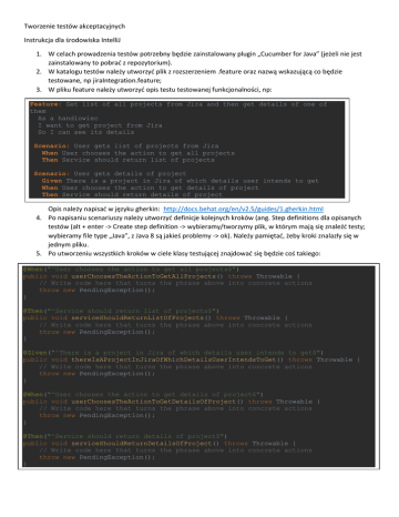 1. W celach prowadzenia testów potrzebny będzie zainstalowany plugin „Cucumber for Java” (jeżeli nie jest
