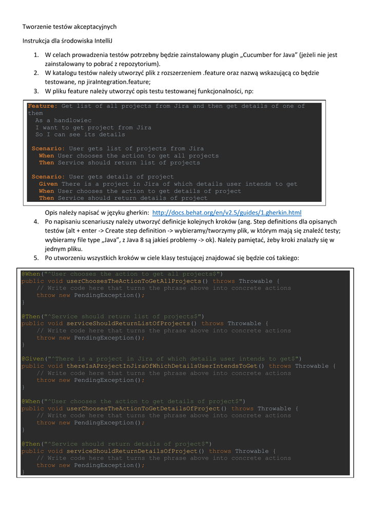 testów (alt + enter -> Create step definition -> wybieramy/tworzymy plik, w którym mają się znaleźć testy;