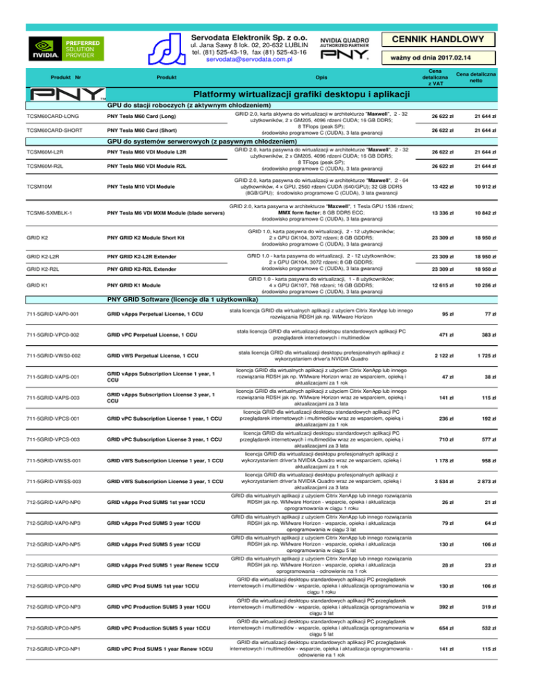 Servodata Elektronik Sp. z o.o. CENNIK HANDLOWY ul. Jana Sawy 8 lok. 02, 20-632 LUBLIN tel. (81) 525-43-19, fax (81) 525-43-16 [email protected] Produkt Nr ważny od dnia 2017.02.14 Opis Produkt Cena detaliczna z VAT Cena detaliczna netto Platformy wirtualizacji grafiki desktopu i aplikacji GPU do stacji roboczych (z aktywnym chłodzeniem) TCSM60CARD-LONG PNY Tesla M60 Card (Long) TCSM60CARD-SHORT PNY Tesla M60 Card (Short) GRID 2.0, karta aktywna do wirtualizacji w architekturze "Maxwell", 2 - 32 użytkowników, 2 x GM205, 4096 rdzeni CUDA; 16 GB DDR5; 8 TFlops (peak SP); środowisko programowe C (CUDA), 3 lata gwarancji 26 622 zł 21 644 zł 26 622 zł 21 644 zł 26 622 zł 21 644 zł 26 622 zł 21 644 zł GRID 2.0, karta pasywna do wirtualizacji w architekturze "Maxwell", 2 - 64 użytkowników, 4 x GPU, 2560 rdzeni CUDA (640/GPU); 32 GB DDR5 (8GB/GPU); środowisko programowe C (CUDA), 3 lata gwarancji 13 422 zł 10 912 zł GRID 2.0, karta pasywna w architekturze "Maxwell", 1 Tesla GPU 1536 rdzeni; MMX form factor; 8 GB DDR5 ECC; środowisko programowe C (CUDA), 3 lata gwarancji 13 336 zł 10 842 zł GRID 1.0, karta pasywna do wirtualizacji, 2 - 12 użytkowników; 2 x GPU GK104, 3072 rdzeni; 8 GB GDDR5; środowisko programowe C (CUDA), 3 lata gwarancji 23 309 zł 18 950 zł 23 309 zł 18 950 zł 23 309 zł 18 950 zł 12 615 zł 10 256 zł stała licencja GRID dla wirtualnych aplikacji z użyciem Citrix XenApp lub innego rozwiązania RDSH jak np. WMware Horizon 95 zł 77 zł 471 zł 383 zł 2 122 zł 1 725 zł GPU do systemów serwerowych (z pasywnym chłodzeniem) TCSM60M-L2R PNY Tesla M60 VDI Module L2R TCSM60M-R2L PNY Tesla M60 VDI Module R2L TCSM10M PNY Tesla M10 VDI Module TCSM6-SXMBLK-1 PNY Tesla M6 VDI MXM Module (blade servers) GRID K2 PNY GRID K2 Module Short Kit GRID K2-L2R PNY GRID K2-L2R Extender GRID K2-R2L PNY GRID K2-R2L Extender GRID K1 PNY GRID K1 Module GRID 2.0, karta pasywna do wirtualizacji w architekturze "Maxwell", 2 - 32 użytkowników, 2 x GM205, 4096 rdzeni CUDA; 16 GB DDR5; 8 TFlops (peak SP); środowisko programowe C (CUDA), 3 lata gwarancji GRID 1.0 - karta pasywna do wirtualizacji, 2 - 12 użytkowników; 2 x GPU GK104, 3072 rdzeni; 8 GB GDDR5; środowisko programowe C (CUDA), 3 lata gwarancji GRID 1.0 - karta pasywna do wirtualizacji, 1 - 8 użytkowników; 4 x GPU GK107, 768 rdzeni; 16 GB GDDR5; środowisko programowe C (CUDA), 3 lata gwarancji PNY GRID Software (licencje dla 1 użytkownika) 711-5GRID-VAP0-001 GRID vApps Perpetual License, 1 CCU 711-5GRID-VPC0-002 GRID vPC Perpetual License, 1 CCU stała licencja GRID dla wirtualizacji desktopu standardowych aplikacji PC przeglądarek internetowych i multimediów 711-5GRID-VWS0-002 GRID vWS Perpetual License, 1 CCU stała licencja GRID dla wirtualizacji desktopu profesjonalnych aplikacji z wykorzystaniem driver'a NVIDIA Quadro 711-5GRID-VAPS-001 GRID vApps Subscription License 1 year, 1 CCU licencja GRID dla wirtualnych aplikacji z użyciem Citrix XenApp lub innego rozwiązania RDSH jak np. WMware Horizon wraz ze wsparciem, opieką i aktualizacjami za 1 rok 47 zł 38 zł 711-5GRID-VAPS-003 GRID vApps Subscription License 3 year, 1 CCU licencja GRID dla wirtualnych aplikacji z użyciem Citrix XenApp lub innego rozwiązania RDSH jak np. WMware Horizon wraz ze wsparciem, opieką i aktualizacjami za 3 lata 141 zł 115 zł 711-5GRID-VPCS-001 GRID vPC Subscription License 1 year, 1 CCU licencja GRID dla wirtualizacji desktopu standardowych aplikacji PC przeglądarek internetowych i multimediów wraz ze wsparciem, opieką i aktualizacjami za 1 rok 236 zł 192 zł 711-5GRID-VPCS-003 GRID vPC Subscription License 3 year, 1 CCU licencja GRID dla wirtualizacji desktopu standardowych aplikacji PC przeglądarek internetowych i multimediów wraz ze wsparciem, opieką i aktualizacjami za 3 lata 710 zł 577 zł 711-5GRID-VWSS-001 GRID vWS Subscription License 1 year, 1 CCU licencja GRID dla wirtualizacji desktopu profesjonalnych aplikacji z wykorzystaniem driver'a NVIDIA Quadro wraz ze wsparciem, opieką i aktualizacjami za 1 rok 1 178 zł 958 zł 711-5GRID-VWSS-003 GRID vWS Subscription License 3 year, 1 CCU licencja GRID dla wirtualizacji desktopu profesjonalnych aplikacji z wykorzystaniem driver'a NVIDIA Quadro wraz ze wsparciem, opieką i aktualizacjami za 3 lata 3 534 zł 2 873 zł 712-5GRID-VAP0-NP0 GRID vApps Prod SUMS 1st year 1CCU GRID dla wirtualnych aplikacji z użyciem Citrix XenApp lub innego rozwiązania RDSH jak np. WMware Horizon - wsparcie, opieka i aktualizacja oprogramowania w ciągu 1 roku 26 zł 21 zł 712-5GRID-VAP0-NP3 GRID vApps Prod SUMS 3 year 1CCU GRID dla wirtualnych aplikacji z użyciem Citrix XenApp lub innego rozwiązania RDSH jak np. WMware Horizon - wsparcie, opieka i aktualizacja oprogramowania w ciągu 3 lat 79 zł 64 zł 712-5GRID-VAP0-NP5 GRID vApps Prod SUMS 5 year 1CCU GRID dla wirtualnych aplikacji z użyciem Citrix XenApp lub innego rozwiązania RDSH jak np. WMware Horizon - wsparcie, opieka i aktualizacja oprogramowania w ciągu 5 lat 130 zł 106 zł 712-5GRID-VAP0-NP1 GRID vApps Prod SUMS 1 year Renew 1CCU GRID dla wirtualnych aplikacji z użyciem Citrix XenApp lub innego rozwiązania RDSH jak np. WMware Horizon - wsparcie, opieka i aktualizacja oprogramowania - odnowienie na 1 rok 28 zł 23 zł 712-5GRID-VPC0-NP0 GRID vPC Prod SUMS 1st year 1CCU GRID dla wirtualizacji desktopu standardowych aplikacji PC przeglądarek internetowych i multimediów - wsparcie, opieka i aktualizacja oprogramowania w ciągu 1 roku 130 zł 106 zł 712-5GRID-VPC0-NP3 GRID vPC Production SUMS 3 year 1CCU GRID dla wirtualizacji desktopu standardowych aplikacji PC przeglądarek internetowych i multimediów - wsparcie, opieka i aktualizacja oprogramowania w ciągu 3 lat 392 zł 319 zł 712-5GRID-VPC0-NP5 GRID vPC Production SUMS 5 year 1CCU GRID dla wirtualizacji desktopu standardowych aplikacji PC przeglądarek internetowych i multimediów - wsparcie, opieka i aktualizacja oprogramowania w ciągu 5 lat 654 