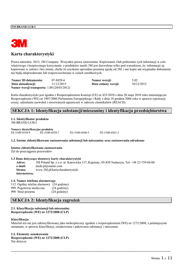 3M BRAND LUB-I Karta charakterystyki Prawa autorskie, 2015, 3M Company Wszystkie prawa zastrzeżone. Kopiowanie i/lub pobieranie tych informacji w celu właściwego i bezpiecznego korzystania z produktów marki 3M jest dozwolone tylko pod warunkiem, że: informacje są kopiowane w całości i bez zmian, chyba że uzyskano uprzednio pisemną zgodę od 3M, i ani kopie ani oryginalne dokumenty nie będą odsprzedawane lub rozpowszechniane w celach zarobkowych. 07-8859-6 Numer ID dokumentu: 11/12/2015 Data aktualizacji: Numer wersji transportu: 1.00 (20/03/2012) Numer wersji: Data zmiany wersji: 5.02 10/12/2015 Karta charakterystyki jest zgodna z Rozporządzeniem Komisji (UE) nr 453/2010 z dnia 20 maja 2010 roku zmieniającym Rozporządzenie (WE) nr 1907/2006 Parlamentu Europejskiego i Rady z dnia 18 grudnia 2006 roku w sprawie rejestracji, oceny, udzielania zazwoleń i stosowanych ograniczeń w zakresie chemikaliów (REACH). SEKCJA 1: Identyfikacja substancji/mieszaniny i identyfikacja przedsiębiorstwa 1.1. Identyfikator produktu 3M BRAND LUB-I Numery identyfikacyjne produktu FE-5100-4558-9 FE-5100-4559-7 FE-5100-4560-5 FE-5100-4561-3 1.2. Istotne zidentyfikowane zastosowania substancji lub mieszaniny oraz zastosowania odradzane Istotne zidentyfikowane zastosowania Żel do przeciągania przewodów 1.3 Dane dotyczące dostawcy karty charakterystyki 3M Poland Sp. z o.o. al. Katowicka 117, Kajetany, 05-830 Nadarzyn; Tel: +48 22-739-60-00 Adres: [email protected] e-mail: www.3M.pl/kartycharakterystyki Strona internetowa: 1.4. Numer telefonu alarmowego 112 Ogólny telefon alarmowy (24 godziny) 999 Pogotowie medyczne (24 godziny) 998 Straż pożarna (24 godziny) SEKCJA 2: Identyfikacja zagrożeń 2.1. Klasyfikacja substancji lub mieszaniny Rozporządzenie (WE) nr 1272/2008 (CLP) Klasyfikacja: Materiał ten nie jest zaklasyfikowany jako niebezpieczny zgodnie z rozporządzeniem (WE) nr 1272/2008, z późniejszymi zmianami, w sprawie klasyfikacji, oznakowania i pakowania substancji i mieszanin. 2.2. Elementy oznakowania Rozporządzenie (WE) nr 1272/2008 (CLP) Nie dotyczy __________________________________________________________________________________________ Strona: 1 z 11 3M BRAND LUB-I 2.3. Inne zagrożenia Nieznane SEKCJA 3: Skład/informacja o składnikach Nazwa substancji Woda Nr CAS 7732-18-5 Glikol polietylenowy 25322-68-3 Glikole polipropylenowe 25322-69-4 Kwas poliakrylowy 9003-01-4 Nr WE Stężenie % EINECS 231- 95 - 99 791-2 Brak 1- 5 NLP 500-039- 1 - 5 8 Brak 0,5 1 Klasyfikacja Substancja niesklasyfikowana jako niebezpieczna Substancja niesklasyfikowana jako niebezpieczna Substancja niesklasyfikowana jako niebezpieczna Substancja niesklasyfikowana jako niebezpieczna W sekcji 16 znajduje się pełny tekst zwrotów H użytych w powyższej tabeli. Informacje dotyczące najwyższych dopuszczalnych stężeń i substancji PBT i vPvB znajdują się w sekcji 8 i 12 karty charakterystyki. SEKCJA 4: Środki pierwszej pomocy 4.1. Opis środków pierwszej pomocy Drogi oddechowe Jeżeli objawy narażenia wystąpią, wyprowadzić poszkodowanego na świeże powietrze. Jeżeli objawy podrażnienia nie ustępują, wezwać lekarza. Kontakt ze skórą Umyć wodą z mydłem. Jeżeli objawy narażenia wystąpią, skontaktować się z lekarzem. Kontakt z oczami Wypłukać dużą ilością wody. Usunąć szkła kontaktowe. Nadal płukać. Jeżeli objawy nie ustępują, skontaktować się z lekarzem. W przypadku połknięcia: Wypłukać usta. Jeżeli objawy podrażnienia nie ustępują, wezwać lekarza. 4.2. Najważniejsze ostre i opóźnione objawy oraz skutki narażenia Patrz Sekcja 11.1 Informacje dotyczące skutków toksykologicznych 4.3. Wskazania dotyczące wszelkiej natychmiastowej pomocy lekarskiej i szczególnego postępowania z poszkodowanym Nie dotyczy SEKCJA 5: Postępowanie w przypadku pożaru 5.1. Środki gaśnicze Niepalne. Użyć środka gaśniczego odpowiedniego do pożaru. 5.2. Szczególne zagrożenia związane z substancją lub mieszaniną Żadne dla tego produktu. __________________________________________________________________________________________ Strona: 2 z 11 3M BRAND LUB-I 5.3. Informacje dla straży pożarnej Nie są przewidziane żadne specjalne działania ochronne dla strażaków. SEKCJA 6: Postępowanie w przypadku niezamierzonego uwolnienia do środowiska 6.1. Indywidualne środki ostrożności, wyposażenie ochronne i procedury w sytuacjach awaryjnych Przewietrzyć pomieszczenie. Przestrzegać zgodnie z innymi sekcjami. 6.2. Środki ostrożności w zakresie ochrony środowiska Unikać uwolnienia do środowiska. 6.3. Metody i materiały zapobiegające rozprzestrzenianiu się skażenia i służące do usuwania skażenia Zabezpieczyć wyciek. Miejsce wycieku obwałować. Wyciek pokryć bentonitem, wermikulitem lub innym nieorganicznym materiałem chłonnym. Mieszać z materiałem chłonnym aż wyciek będzie suchy. Zebrać rozlany/rozsypany materiał. Umieścić w zamkniętym kontenerze. Pozostałość spłukać wodą. Szczelnie zamknąć pojemnik. Usunąć zebrany materiał. 6.4. Odniesienia do innych sekcji Więcej informacji znajduje się w sekcji 8 i sekcji 13 SEKCJA 7: Postępowanie z substancjami i mieszaninami oraz ich magazynowanie 7.1. Środki ostrożności dotyczące bezpiecznego postępowania Produkt przeznaczony tylko do profesjonalnego(przemysłowego) użytku, zgodnie z instrukcją. Unikać wdychania pyłu/dymu/gazu/mgły/par/rozpylonej cieczy. Nie jeść, nie pić ani nie palić podczas używania produktu. Dokładnie umyć po użyciu. 7.2. Warunki bezpiecznego magazynowania, łącznie z informacjami dotyczącymi wszelkich wzajemnych niezgodności Brak szczególnych wymagań dotyczących magazynowania. 7.3. Szczególne zastosowanie(-a) końcowe Zapoznać się z informacjami, w sekcjach 7.1 i 7.2, dotyczącymi bezpiecznego postępowania i warunków magazynowania produktu. Zapoznać się z informacjami w sekcji 8 dotyczącymi kontroli narażenia i środków ochrony