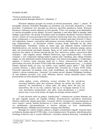 HUBERT KUBIT "Twórcze dochowanie wierności, czyli jak Kenneth Branagh ufilmowił >>Hamleta<<" Wierność adaptacji przyjęło się oceniać na dwóch poziomach: „litery” i „ducha”. W przypadku Hamleta Kennetha Branagha jej określenie jest niezwykle kłopotliwe, z kilku powodów. O problemie tym decyduje po pierwsze specyfika gatunkowa dzieła. Wierność literacką w dramacie można zaburzyć na dwa sposoby. Primo: nie stosując się do didaskaliów (w naszym przypadku są one ubogie). Secundo: ingerując w sam tekst, bądź to ujmując, bądź dodając wypowiedzi. Ale przede wszystkim rodzi się problem określenia wierności duchowi utworu. Hamlet od czasu powstania był wystawiany niezliczoną ilość razy, nawiązywano do niego wielokrotnie, a i od samych początków kina nie wychodzi spod lupy twórców X Muzy. Jest najbardziej znanym i najczęściej odświeżanym utworem Szekspira. Ale to jest również jego mankamentem – na przestrzeni wieków recepcja dzieła zmieniała się jak obraz w kalejdoskopie. Posiadamy wiedzę na temat tego, jak odbierali dramat współcześni Stratfordczykowi, ale niestety nie możemy stwierdzić, jakie były założenia samego autora, jakie cele przyświecały powstaniu dramatu. Spory na ten temat trwają do dziś dnia. Część znawców jest zdania, że Hamlet powstał tak jak Titus Andronicus, jedno z pierwszych dzieł Szekspira – jako tragedia zemsty. Wahania królewicza, jego niezdecydowanie i wszystkie związane z tym wydarzenia traktują badacze jedynie jako retardację, jako zabieg formalny mający na celu opóźnienie punktu kulminacyjnego, tym samym przeciągający i zwiększający napięcie. A krwawy (choć znacznie mniej niż w Titusie Andronicusie) finał zdaje się potwierdzać ich teorię. Do końca XVIII wieku fakt retardacji „tłumaczono tym (…), że gdyby bohater dokonał dzieła od razu, nie byłoby czym zapełnić pięciu aktów.”1 Taki sposób czytania Hamleta, z jakim mamy do czynienia dziś, wywodzi się z końca XVIII wieku. Przeszedł wprawdzie od tamtego czasu wiele modyfikacji, ale fundamenty wywodzą się właśnie z okresu romantyzmu. „Autorem” ich można nazwać Johanna Wolfganga Goethego. W usta bohatera powieści Lata nauki Wilhelma Meistra włożył niemiecki pisarz swoje przemyślenia na temat dramatu Szekspira: „Istota piękna, czysta, szlachetna, wysoce moralna, bez siły zmysłowej tworzącej bohatera, ginie pod ciężarem, którego nie można ani unieść, ani odrzucić; nie niemożliwej w samej sobie, ale takiej, która dla niej jest niemożliwą. Jak on się wije, szamoce, lęka się, to występuje naprzód, to się cofa, doświadcza przypomnień, sam sobie wciąż przypomina, a w końcu prawie traci z oczu swój zamiar, ale nigdy nie doznaje uczucia radości!”2 Z tymi słowami rodzi się pojęcie „hamletyzmu” i romantyczne czytanie dramatu, już nie jako tragedię zemsty, ale tragedię refleksji. Dotychczasowe największe ekranizacje Hamleta traktowały dramat pierwotnie. Lawrence Olivier zrezygnował z psychologizmu na rzecz wrażeń i emocji. Hamlet Kozincewa to z kolei nie człowiek z dylematem moralnym, czy problemami egzystencjalnymi, to trzeźwo patrzący na życie intelektualista, powiedzielibyśmy: dokładne przeciwieństwo znanego nam Hamleta. Branagh nie wybiera między jednym a drugim rozumieniem tragedii. Zręcznie łączy on bohatera dramatu sprzed XVIII wieku, z tym romantycznym. Do granicy nakreślonej przez Goethego królewicz był w oczach odbiorców i krytyków postacią heroiczną. I poniekąd tak 1 2 S. Helsztyński, „Hamlet” Wiliama Szekspira, PZWS, Warszawa 1966, s. 75–76. Ibidem, s. 86. 1 też wygląda tytułowy bohater na ekranie – kamera zdaje się widzieć tylko jego, jeździ za nim, starając się nie spuszczać go z obiektywu. Jak już wspomniałem, problem z określeniem wierności adaptacji Hamleta tkwi głównie w kwestii wielości sposobów recepcji dzieła, z jakim spotkało się ono na przestrzeni wieków. Oczywiście – Hamlet jako dramat zakłada dużą dowolność interpretacji przez adaptatora. Nie pozostawia mu jednak całkowicie wolnej ręki, a zobowiązuje. Jeśli reżyser nie traktuje dramatu wyłącznie jako inspiracji, jak robi to na przykład przedstawiciel „nowej fali” Claude Chabrol w „twórczej parodii”3 pod tytułem Ofelia. Jeśli reżyser tworzy adaptację jako odświeżenie dzieła literackiego lub jako wypowiedź potwierdzającą stanowisko autora oryginału, musi przynajmniej po części zachować ducha utworu. Duch, czyli jak pisze Alicja Helman „klimat, wartość, rytm i styl.”4 Zaznaczyć tu trzeba, że „utwór «wyjściowy» i jego audiowizualną konkretyzację należy traktować jako dwie odrębne wypowiedzi na ten sam temat.”5 W naszym przypadku, Branagh nie tylko powtarza słowa Szekspira, ale również dorzuca swoje „trzy grosze”. Mimo że już to nie jest zadaniem łatwym, on zdaje się jeszcze utrudniać sobie zadanie przenosząc akcję w wiek XIX. Ale wychodzi z tej próby obronną ręką. Udaje mu się przenieść dramat na ekran, nie zdradzając Szekspira pod żadnym względem: ani litery, ani ducha. Przy tym jego wersja Hamleta różni się diametralnie od dotychczasowych adaptacji. Ten Hamlet to film „z krwi i kości”. Branagh odcina się od największych ekranizacji tej tragedii – wersji Lawrence`a Oliviera, która ma w sobie tyleż z kina, co z teatru, oraz od dzieła Grigorija Kozincewa, które nie będąc teatralnym, nie jest również tak świadomie filmowym, jak omawiany tu utwór. Dziwnym wydaje się fakt, że dopiero przeszło wiek po narodzinach kina doczekaliśmy się tak „filmowej” adaptacji najsłynniejszego dzieła Szekspira. Wszak jeszcze w epoce kina niemego pojawiały się głosy broniące „filmowości” adaptacji. Wymienię tu chociażby Borysa Eichenbauma, który uważał, że „należy bronić specyfiki sztuki filmowej (tzw. „fotogeniczności” i efe