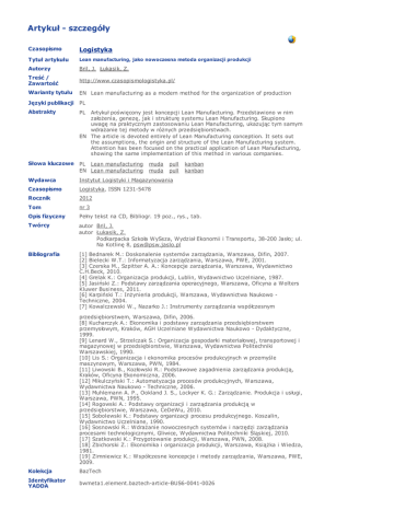 Artykuł - szczegóły Czasopismo Logistyka Tytuł artykułu Lean manufacturing, jako nowoczesna metoda organizacji produkcji Autorzy Bril, J. Łukasik, Z. Treść / Zawartość http://www.czasopismologistyka.pl/ Warianty tytułu EN Lean manufacturing as a modern method for the organization of production Języki publikacji PL Abstrakty PL Słowa kluczowe PL Lean manufacturing EN Lean manufacturing Wydawca Instytut Logistyki i Magazynowania Czasopismo Logistyka, ISSN 1231-5478 Rocznik 2012 Tom nr 3 Opis fizyczny Pełny tekst na CD, Bibliogr. 19 poz., rys., tab. Twórcy autor Bril, J. autor Łukasik, Z. Podkarpacka Szkoła WySsza, Wydział Ekonomii i Transportu, 38-200 Jasło; ul. Na Kotlinę 8, [email protected] Bibliografia [1] Bednarek M.: Doskonalenie systemów zarządzania, Warszawa, Difin, 2007. [2] Bielecki W.T.: Informatyzacja zarządzania, Warszawa, PWE, 2001. [3] Czerska M., Szpitter A. A.: Koncepcje zarządzania, Warszawa, Wydawnictwo C.H.Beck, 2010. [4] Grelak K.: Organizacja produkcji, Lublin, Wydawnictwo Uczelniane, 1987. [5] Jasiński Z.: Podstawy zarządzania operacyjnego, Warszawa, Oficyna a Wolters Kluwer Business, 2011. [6] Karpiński T.: Inżynieria produkcji, Warszawa, Wydawnictwa Naukowo Techniczne, 2004. [7] Kowalczewski W., Nazarko J.: Instrumenty zarządzania współczesnym Artykuł poświęcony jest koncepcji Lean Manufacturing. Przedstawiono w nim założenia, genezę, jak i strukturę systemu Lean Manufacturing. Skupiono uwagę na praktycznym zastosowaniu Lean Manufacturing, ukazując tym samym wdrażanie tej metody w różnych przedsiębiorstwach. EN The article is devoted entirely of Lean Manufacturing conception. It sets out the assumptions, the origin and structure of the Lean Manufacturing system. Attention has been focused on the practical application of Lean Manufacturing, showing the same implementation of this method in various companies. muda muda pull pull kanban kanban przedsiębiorstwem, Warszawa, Difin, 2006. [8] Kucharczyk A.: Ekonomika i podstawy zarządzania przedsiębiorstwem przemysłowym, Kraków, AGH Uczelniane Wydawnictwa Naukowo - Dydaktyczne, 1999. [9] Lenard W., Strzelczak S.: Organizacja gospodarki materiałowej, transportowej i magazynowej w przedsiębiorstwie, Warszawa, Wydawnictwa Politechniki Warszawskiej, 1990. [10] Lis S.: Organizacja i ekonomika procesów produkcyjnych w przemyśle maszynowym, Warszawa, PWN, 1984. [11] Liwowski B., Kozłowski R.: Podstawowe zagadnienia zarządzania produkcją, Kraków, Oficyna Ekonomiczna, 2006. [12] Mikulczyński T.: Automatyzacja procesów produkcyjnych, Warszawa, Wydawnictwa Naukowo - Techniczne, 2006. [13] Muhlemann A. P., Ookland J. S., Lockyer K. G.: Zarządzanie. Produkcja i usługi, Warszawa, PWN, 1995. [14] Rogowski A.: Podstawy organizacji i zarządzania produkcją w przedsiębiorstwie, Warszawa, CeDeWu, 2010. [15] Sobolewski K.: Podstawy organizacji procesu produkcyjnego. Koszalin, Wydawnictwo Uczelniane, 1990. [16] Sosnowski R.: Wdrażanie nowoczesnych systemów i narzędzi zarządzania procesami technologicznymi, Gliwice, Wydawnictwa Politechniki Śląskiej, 2010. [17] Szatkowski K.: Przygotowanie produkcji, Warszawa, PWN, 2008. [18] Zbichorski Z.: Ekonomika i organizacja produkcji, Warszawa, Książka i Wiedza, 1981. [19] Zimniewicz K.: Współczesne koncepcje i metody zarządzania, Warszawa, PWE, 2009. Kolekcja BazTech Identyfikator YADDA bwmeta1.element.baztech-article-BUS6-0041-0026 Identyfikatory BazTech ID BUS6-0041-0026 © Wszelkie prawa zastrzeżone przez Konsorcjum BazTech | Baza utrzymywana i dystrybuowana przez ICM UW | System oparty na platformie YADDA default, ver. 1.12.5-SNAPSHOT, rev. 36521 | © ICM UW 2005-2013