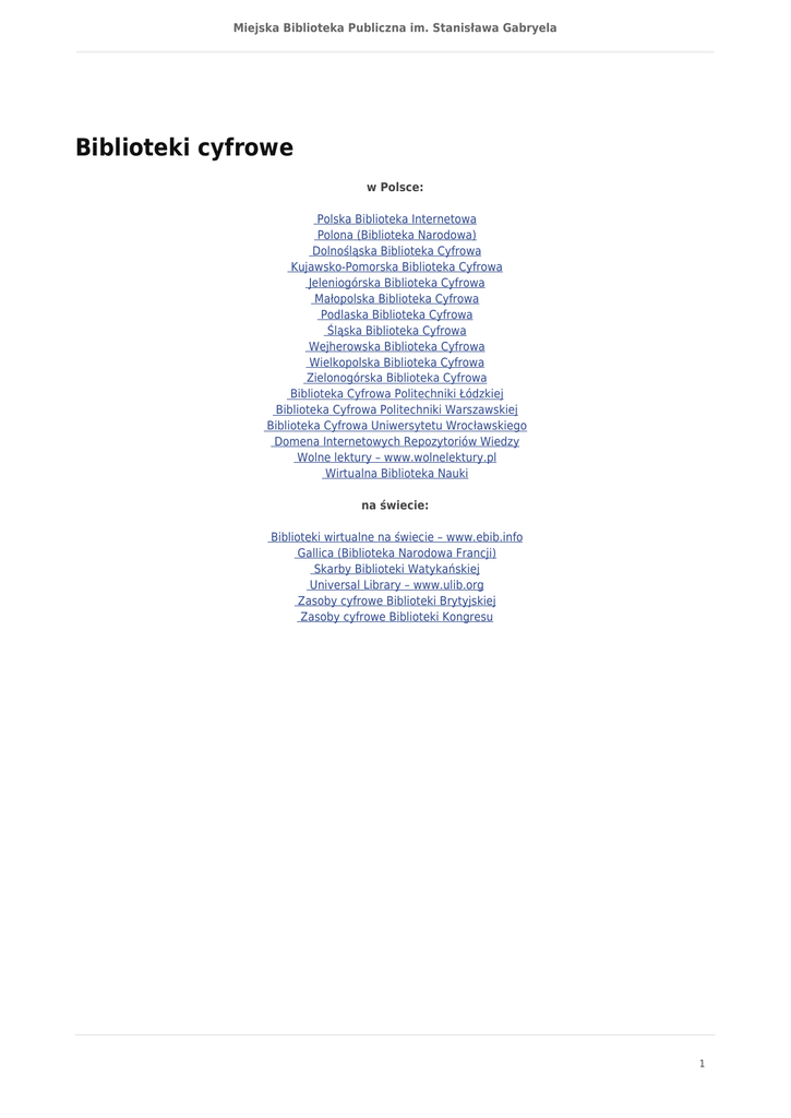 Miejska Biblioteka Publiczna im. Stanisława Gabryela Biblioteki cyfrowe w Polsce: Polska Biblioteka Internetowa Polona (Biblioteka Narodowa) Dolnośląska Biblioteka Cyfrowa Kujawsko-Pomorska Biblioteka Cyfrowa Jeleniogórska Biblioteka Cyfrowa Małopolska Biblioteka Cyfrowa Podlaska Biblioteka Cyfrowa Śląska Biblioteka Cyfrowa Wejherowska Biblioteka Cyfrowa Wielkopolska Biblioteka Cyfrowa Zielonogórska Biblioteka Cyfrowa Biblioteka Cyfrowa Politechniki Łódzkiej Biblioteka Cyfrowa Politechniki Warszawskiej Biblioteka Cyfrowa Uniwersytetu Wrocławskiego Domena Internetowych Repozytoriów Wiedzy Wolne lektury – www.wolnelektury.pl Wirtualna Biblioteka Nauki na świecie: Biblioteki wirtualne na świecie – www.ebib.info Gallica (Biblioteka Narodowa Francji) Skarby Biblioteki Watykańskiej Universal Library – www.ulib.org Zasoby cyfrowe Biblioteki Brytyjskiej Zasoby cyfrowe Biblioteki Kongresu 1