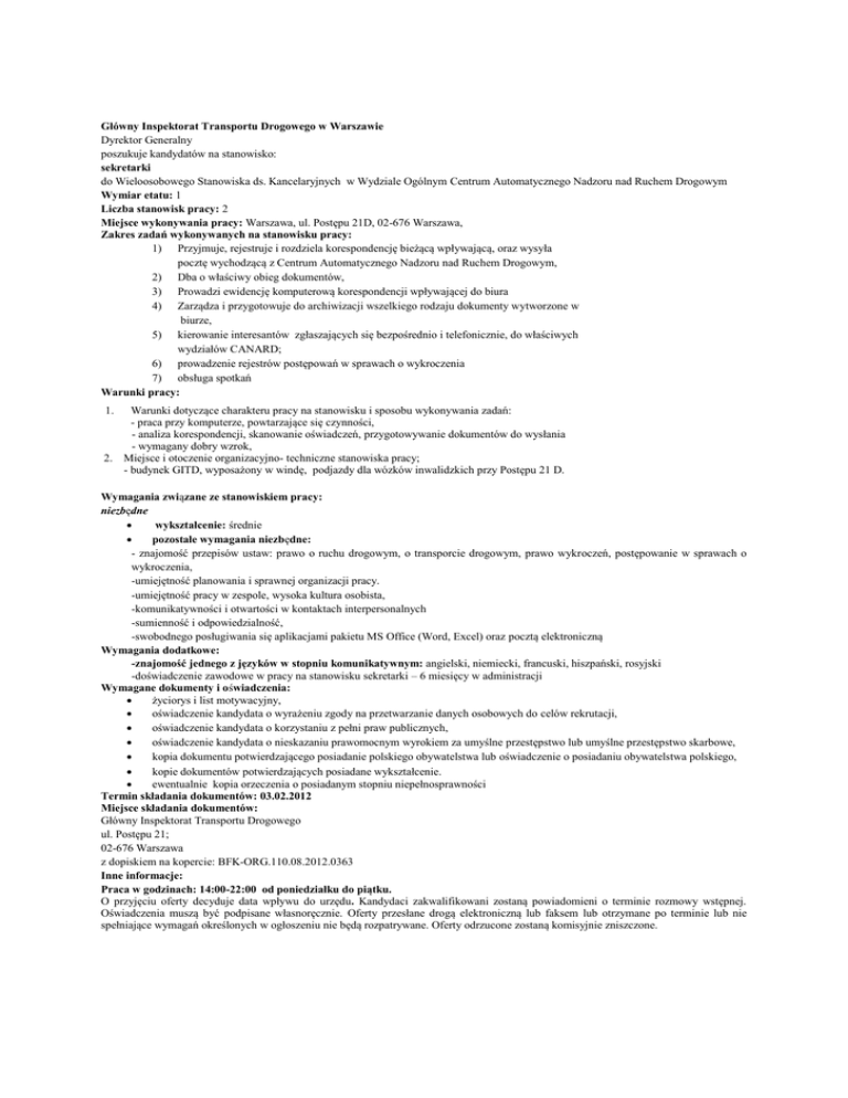 Główny Inspektorat Transportu Drogowego w Warszawie Dyrektor Generalny poszukuje kandydatów na stanowisko: sekretarki do Wieloosobowego Stanowiska ds. Kancelaryjnych w Wydziale Ogólnym Centrum Automatycznego Nadzoru nad Ruchem Drogowym Wymiar etatu: 1 Liczba stanowisk pracy: 2 Miejsce wykonywania pracy: Warszawa, ul. Postępu 21D, 02-676 Warszawa, Zakres zadań wykonywanych na stanowisku pracy: 1) Przyjmuje, rejestruje i rozdziela korespondencję bieżącą wpływającą, oraz wysyła pocztę wychodzącą z Centrum Automatycznego Nadzoru nad Ruchem Drogowym, 2) Dba o właściwy obieg dokumentów, 3) Prowadzi ewidencję komputerową korespondencji wpływającej do biura 4) Zarządza i przygotowuje do archiwizacji wszelkiego rodzaju dokumenty wytworzone w biurze, 5) kierowanie interesantów zgłaszających się bezpośrednio i telefonicznie, do właściwych wydziałów CANARD; 6) prowadzenie rejestrów postępowań w sprawach o wykroczenia 7) obsługa spotkań Warunki pracy: Warunki dotyczące charakteru pracy na stanowisku i sposobu wykonywania zadań: - praca przy komputerze, powtarzające się czynności, - analiza korespondencji, skanowanie oświadczeń, przygotowywanie dokumentów do wysłania - wymagany dobry wzrok, 2. Miejsce i otoczenie organizacyjno- techniczne stanowiska pracy; - budynek GITD, wyposażony w windę, podjazdy dla wózków inwalidzkich przy Postępu 21 D. 1. Wymagania związane ze stanowiskiem pracy: niezbędne wykształcenie: średnie pozostałe wymagania niezbędne: - znajomość przepisów ustaw: prawo o ruchu drogowym, o transporcie drogowym, prawo wykroczeń, postępowanie w sprawach o wykroczenia, -umiejętność planowania i sprawnej organizacji pracy. -umiejętność pracy w zespole, wysoka kultura osobista, -komunikatywności i otwartości w kontaktach interpersonalnych -sumienność i odpowiedzialność, -swobodnego posługiwania się aplikacjami pakietu MS Office (Word, Excel) oraz pocztą elektroniczną Wymagania dodatkowe: -znajomość jednego z języków w stopniu komunikatywnym: angielski, niemiecki, francuski, hiszpański, rosyjski -doświadczenie zawodowe w pracy na stanowisku sekretarki – 6 miesięcy w administracji Wymagane dokumenty i oświadczenia: życiorys i list motywacyjny, oświadczenie kandydata o wyrażeniu zgody na przetwarzanie danych osobowych do celów rekrutacji, oświadczenie kandydata o korzystaniu z pełni praw publicznych, oświadczenie kandydata o nieskazaniu prawomocnym wyrokiem za umyślne przestępstwo lub umyślne przestępstwo skarbowe, kopia dokumentu potwierdzającego posiadanie polskiego obywatelstwa lub oświadczenie o posiadaniu obywatelstwa polskiego, kopie dokumentów potwierdzających posiadane wykształcenie. ewentualnie kopia orzeczenia o posiadanym stopniu niepełnosprawności Termin składania dokumentów: 03.02.2012 Miejsce składania dokumentów: Główny Inspektorat Transportu Drogowego ul. Postępu 21; 02-676 Warszawa z dopiskiem na kopercie: BFK-ORG.110.08.2012.0363 Inne informacje: Praca w godzinach: 14:00-22:00 od poniedziałku do piątku. O przyjęciu oferty decyduje data wpływu do urzędu. Kandydaci zakwalifikowani zostaną powiadomieni o terminie rozmowy wstępnej. Oświadczenia muszą być podpisane własnoręcznie. Oferty przesłane drogą elektroniczną lub faksem lub otrzymane po terminie lub nie spełniające wymagań określonych w ogłoszeniu nie będą rozpatrywane. Oferty odrzucone zostaną komisyjnie zniszczone.