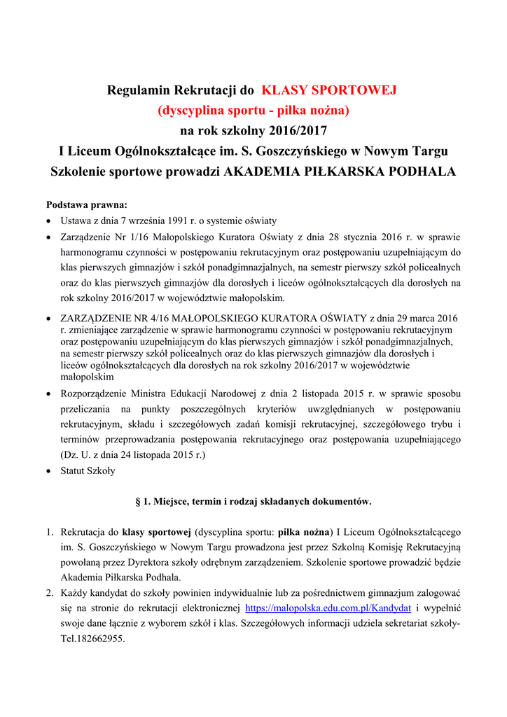 Regulamin Rekrutacji do KLASY SPORTOWEJ (dyscyplina sportu - piłka nożna) na rok szkolny 2016/2017 I Liceum Ogólnokształcące im. S. Goszczyńskiego w Nowym Targu Szkolenie sportowe prowadzi AKADEMIA PIŁKARSKA PODHALA Podstawa prawna: Ustawa z dnia 7 września 1991 r. o systemie oświaty Zarządzenie Nr 1/16 Małopolskiego Kuratora Oświaty z dnia 28 stycznia 2016 r. w sprawie harmonogramu czynności w postępowaniu rekrutacyjnym oraz postępowaniu uzupełniającym do klas pierwszych gimnazjów i szkół ponadgimnazjalnych, na semestr pierwszy szkół policealnych oraz do klas pierwszych gimnazjów dla dorosłych i liceów ogólnokształcących dla dorosłych na rok szkolny 2016/2017 w województwie małopolskim. ZARZĄDZENIE NR 4/16 MAŁOPOLSKIEGO KURATORA OŚWIATY z dnia 29 marca 2016 r. zmieniające zarządzenie w sprawie harmonogramu czynności w postępowaniu rekrutacyjnym oraz postępowaniu uzupełniającym do klas pierwszych gimnazjów i szkół ponadgimnazjalnych, na semestr pierwszy szkół policealnych oraz do klas pierwszych gimnazjów dla dorosłych i liceów ogólnokształcących dla dorosłych na rok szkolny 2016/2017 w województwie małopolskim Rozporządzenie Ministra Edukacji Narodowej z dnia 2 listopada 2015 r. w sprawie sposobu przeliczania na punkty poszczególnych kryteriów uwzględnianych w postępowaniu rekrutacyjnym, składu i szczegółowych zadań komisji rekrutacyjnej, szczegółowego trybu i terminów przeprowadzania postępowania rekrutacyjnego oraz postępowania uzupełniającego (Dz. U. z dnia 24 listopada 2015 r.) Statut Szkoły § 1. Miejsce, termin i rodzaj składanych dokumentów. 1. Rekrutacja do klasy sportowej (dyscyplina sportu: piłka nożna) I Liceum Ogólnokształcącego im. S. Goszczyńskiego w Nowym Targu prowadzona jest przez Szkolną Komisję Rekrutacyjną powołaną przez Dyrektora szkoły odrębnym zarządzeniem. Szkolenie sportowe prowadzić będzie Akademia Piłkarska Podhala. 2. Każdy kandydat do szkoły powinien indywidualnie lub za pośrednictwem gimnazjum zalogować się na stronie do rekrutacji elektronicznej https://malopolska.edu.com.pl/Kandydat i wypełnić swoje dane łącznie z wyborem szkół i klas. Szczegółowych informacji udziela sekretariat szkołyTel.182662955. 3. W terminie od 11 kwietnia 2016r. od godz. 9.00 do 10 czerwca 2016 r. do godz. 15.00 – kandydaci składają do szkoły pierwszego wyboru „podanie o przyjęcie”- wydrukowane ze strony elektronicznej rekrutacji https://malopolska.edu.com.pl/Kandydat 4. W terminie od 24 do 28 czerwca 2016r. d godz. 15.00 kandydat dostarcza do szkoły pierwszego wyboru 1 kserokopię świadectwa ukończenia gimnazjum oraz 1 kserokopię zaświadczenia o wynikach egzaminu gimnazjalnego. 5. W obrębie szkoły kandydaci mają możliwość wyboru dowolnej liczby oddziałów zgodnie z listą preferencji. § 2. Kryteria przyjęcia do klasy sportowej 1. O przyjęciu do klasy sportowej decyduje łączna liczba punktów uzyskanych w wyniku: a) egzaminu gimnazjalnego ( max. 100 pkt. ), b) przeliczenia ocen na świadectwie ukończenia gimnazjum z języka polskiego, języka obcego, geografii i biologii ( max. 80 pkt.). Zasady przeliczania ocen na punkty: celujący – 20 pkt, bardzo dobry – 16 pkt, dobry - 12 pkt., dostateczny - 8 pkt., dopuszczający - 2 pkt. c) testu sprawnościowego (max 100 pkt.) przeprowadzonego przez trenera lub instruktora prowadzącego zajęcia sportowe, d) za szczególne osiągnięcia ucznia wymienione na świadectwie ukończenia gimnazjum kandydat może uzyskać co najwyżej 20 pkt. przy czym: za ukończenie gimnazjum z wyróżnieniem – 5 pkt. za udział w konkursach organizowanych przez Małopolskiego Kuratora Oświaty w tym: 1.a. finalista konkursu przedmiotowego o zasięgu ponadwojewódzkim – 10 punktów, 1.b. laureat konkursu tematycznego lub interdyscyplinarnego o zasięgu wojewódzkim – 7 punktów, 1.c. finalista konkursu tematycznego lub interdyscyplinarnego o zasięgu pondwojewódzkim – 5 punktów, 1.d. finalista dwóch i więcej konkursów przedmiotowych o zasięgu wojewódzkim – 10 punktów 1.e. laureat dwóch i więcej konkursów tematycznych i interdyscyplinarych o zasięgu wojewódzkim – 7 punktów 1.f. finalista dwóch i więcej konkursów tematycznych i interdyscyplinarych o zasięgu wojewódzkim – 5 punktów 1.g. finalista konkursu przedmiotowego o zasięgu wojewódzkim – 7 punktów 1.h. laureat konkursu tematycznego lub interdyscyplinarnego o zasięgu wojewódzkim – 5 punktów 1.i. finalista konkursu tematycznego lub interdyscyplinarnego o zasięgu wojewódzkim – 3 punktów 1.j. finalista konkursu z przedmiotu artystycznego objętego ramowym planem nauczania dla szkoły artystycznej o zasięgu ogólnopolskim i wyższym – 10 punktów, 1.k. laureat konkursu z przedmiotów artystycznych nieobjętych ramowym planem nauczania dla szkoły artystycznej o zasięgu ogólnopolskim i wyższym – 4 punkty 1.l. finalista konkursu z przedmiotów artystycznych nieobjętego ramowym planem nauczania dla szkoły artystycznej o zasięgu ogólnopolskim i wyższym – 3 punkty 1.m. uzyskanie wysokiego miejsca w zawodach sportowych na szczeblu międzynarodowym -4 punkty 1.n. uzyskanie wysokiego miejsca w zawodach sportowych na szczeblu krajowym3 punkty 1.o. uzyskanie wysokiego miejsca w zawodach sportowych na szczeblu wojewódzkim -2 punkty 1.p. uzyskanie wysokiego miejsca w zawodach sportowych na szczeblu powiatowym -1 punkt Konkursy przedmiotowe organizowane przez Małopolskiego Kuratora Oświaty w roku szkolnym 2015/2016 1. 2. 3. 4. 5. 6. 7. 8. 9. 10. 11. Konkurs języka polskiego Konkurs matematyczny Konkurs z fizyki Konkurs z historii Konkurs biologiczny Konkurs geograficzny Konkurs chemiczny Konkurs języka angielskiego Konkurs języka niemieckiego Konkurs języka francuskiego Konkurs wiedzy o społeczeństwie – ponadwojewódzki Konkury tematyczne organizowane przez Małopolskiego Kuratora Oświaty w roku szkolnym 2015/2016 1. L
