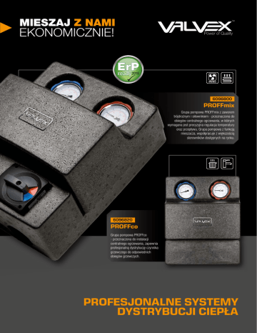 MIESZAJ Z NAMI EKONOMICZNIE! ErP ready 2015 6096800 PROFFmix Grupa pompowa PROFFmix z zaworem trójdrożnym i siłownikiem - przeznaczona do obiegów centralnego ogrzewania, w których wymagana jest precyzyjna regulacja temperatury oraz przepływu. Grupa pompowa z funkcją mieszacza, współpracuje z większością sterowników dostępnych na rynku. 6096820 PROFFco Grupa pompowa PROFFco - przeznaczona do instalacji centralnego ogrzewania, zapewnia profesjonalną dystrybucję czynnika grzewczego do odpowiednich obiegów grzewczych. PROFESJONALNE SYSTEMY DYSTRYBUCJI CIEPŁA • PROFESJONALNE SYSTEMY DYSTRYBUCJI CIEPŁA • GRUPY POMPOWE PROFFmix i PROFFco to: najwyższa jakość użytych materiałów produkty w pełni przygotowane do pracy - skręcone i przetestowane! pompa elektroniczna firmy Wilo zawory odcinające zintegrowane z termometrami wysokiej jakości modułowa termoizolacja o niskiej przewodności cieplnej POMPA Grupy pompowo - mieszające PROFF 46,5 kWh Nieregulowana, przewymiarowana pompa w starych instalacjach grzewczych 500-800 kWh kWh/ rok ErP ready PROFFmix i PROFFco wyposażono w nowoczesną pompę, spełniajacą dyrektywy UE dot. efektywności energetycznej pomp bezdławicowych. 2015 SAVE & SAFETY EASY CUT Zawór trójdrożny z wbudowanym bypassem - chroni pompę przed przeciążeniem i pracą pod skrajnym ciśnieniem w razie pełnego zamknięcia zaworu. Zawór odcinający - ułatwia montaż, demontaż pompy obiegowej, bez konieczności spuszczania wody z instalacji centralnego ogrzewania. 100 200 300 400 500 600 700 800 6096800 GRUPA POMPOWA PROFFmix wyposażona w: pompę obiegową elektroniczną klasy „A” o zmiennej prędkości zawory kulowe odcinające z termometrem (w zaworze powrotnym umieszczono zawór zwrotny) zawór mieszający 3-drożny z siłownikiem obudowę termoizolacyjną SAFETY CONTROL Zawory kulowe ze zintegrowanymi termometrami - pokazują temperaturę zasilania i powrotu w sposób mechaniczny. Dwa zawory G3/4” odcinają przepływ, umożliwiając wymianę pompy bez spuszczenia czynnika grzewczego. Zastosowany na powrocie zawór zwrotny zabezpiecza przed „przebiciem ciepła” na odbiorniki (grzejniki, ogrzewanie podłogowe). Termometry wykonane z aluminium i stali, skala 0-160ºC. 6096820 GRUPA POMPOWA PROFFco wyposażona w: pompę obiegową elektroniczną klasy „A” o zmiennej prędkości zawory kulowe odcinające z termometrem (w zaworze powrotnym umieszczono zawór zwrotny) zawór kulowy odcinający na rurze zasilającej obudowę termoizolacyjną 200 360 270 DANE TECHNICZNE 95°C Ciśnienie maksymalne 6 bar 0-160°C 0,6 Czynniki grzewcze woda, wodne roztwory glikolu (max. 50% glikolu) 0,5 stal ocynkowana Wsporniki mocujące stal ocynkowana Izolacja 2 MIESZAJ Z NAMI EKONOMICZNIE! mosiądz, EN 12165 CW617N Króciec Uszczelnienia PROFFmix grupa pompowa bez pompy obiegowej KV = 7.0 m³/h EPDM nadtlenkowy PTFE EPDM nadtlenkowy Zakres temperatury w instalacjach HVAC 0-95ºC Max. ciśnienie statyczne PN 6 Max. wysokość podnoszenia 6.2 m Rozstaw króćców 130 mm 0,3 PROFFco Maksymalny przepływ 3,3 m³/h 0,2 Stopnie prędkości 0,4 MATERIAŁY Uszczelki zamykające POMPA OBIEGOWA ELEKTRONICZNA Wykresy natężenia przepływu: Ciśnienie [bar] 0,7 Skala termometrów Uszczelki płaskie MAXI CONTROL Nowy standard dla energooszczędnych rozwiązań do zintegrowanych systemów grzewczych. Pompa posiada płynną regulację prędkości obrotowej, charakteryzującą się nowym współczynnikiem efektywności energetycznej. Moduł elektroniczny sterowania posiada czerwone pokrętło, ułatwiające prosty wybór funkcji. CHARAKTERYSTYKA HYDRAULICZNA Temperatura maksymalna Korpus, śrubunki, złączki SMART MIX Siłownik mieszacza - przystosowany do pracy ręcznej i automatycznej. Wysoki moment obrotowy daje gwarancję otwarcia i zamknięcia zaworu, nawet po dłuższym okresie nieużytkowania instalacji. KV = 7.3 m³/h 0,1 0,0 grupa pompowa bez pompy obiegowej 0 500 1000 1500 2000 2500 3000 3500 4000 Przepływ [l/h] PPE, przewodność λ(ΔT): 0,041 (W/mK) CIEPŁO POD KONTROLĄ! Średnice podłączenia Funkcje płynna regulacja prędkości 1 1/2” proporcjonalnej różnicy ciśnień, stałej różnicy ciśnień, odpowietrzania 3 • PROFESJONALNE SYSTEMY DYSTRYBUCJI CIEPŁA • 6096760 ROZDZIELACZ KOTŁOWY COMBI - praktyczne i proste rozwiązanie montażowe dla grup pompowych. Pojedynczy „korpus” złożony z dwóch oddzielnych komór wewnętrznych skonstruowanych tak, by oddzielać od siebie oba obiegi - zasilający i powrotny. Zalety zastosowania rozdzielacza kotłowego COMBI: brak oddziaływania na siebie poszczególnych grup odbiorników ciepła możliwość przyłączenia wielu rodzajów instalacji (np. układu z zaworem mieszającym, grupy pompowej bez zaworu mieszającego, kolejnych rozdzielaczy, instalacji z nagrzewnicami i innych) prostsze wykonanie instalacji i zmniejszenie jej gabarytów 6096770 37 Zaślepka do rozdzielacza kotłowego - do montażu wymagane 2 szt. 105 37 50 55 47 58 67,3 77,5 71,5 138,8 77,5 354 280 125 115 G1"1/2 M G1"1/2 M 6098280 STEROWNIK V-THERM przeznaczony do obsługi zaworu mieszającego trój- lub czterodrożnego z możliwością podłączenia dodatkowej pompy. funkcja sterowania pogodowego, program tygodniowy możliwość współpracy z regulatorem pokojowym możliwość obsługi zdalnej poprzez zastosowanie modułu internetowego: podgląd temperatury każdego czujnika, wprowadzanie zmian temperatur zadanych zarówno dla pomp jak i zaworów mieszających 9999456 Valvex S.A., ul. Nad Skawą 2, 34-240 Jordanów, Polska tel. +48 18 269 32 20, 269 32 49, fax +48 18 269 32 11, infolinia: 0800 192 922 www.valvex.com; e-mail: [email protected]