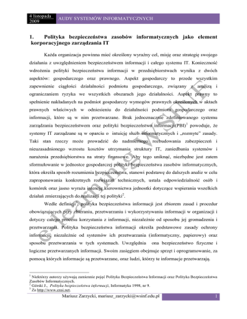 4 listopada 2009 AUDY SYSTEMÓW INFORMATYCZNYCH 1. Polityka bezpieczeństwa zasobów informatycznych jako element korporacyjnego zarządzania IT Każda organizacja powinna mieć określony wyraźny cel, misję oraz strategię swojego działania z uwzględnieniem bezpieczeństwem informacji i całego systemu IT. Konieczność wdrożenia polityki bezpieczeństwa informacji w przedsiębiorstwach wynika z dwóch aspektów: gospodarczego oraz prawnego. Aspekt gospodarczy to przede wszystkim zapewnienie ciągłości działalności podmiotu gospodarczego, związany z analizą i ograniczaniem ryzyka we wszystkich obszarach jego działalności. Aspekt prawny to spełnienie nakładanych na podmiot gospodarczy wymogów prawnych określonych w aktach prawnych właściwych w odniesieniu do działalności podmiotu gospodarczego oraz informacji, które są w nim przetwarzane. Brak jednoznacznie zdefiniowanego systemu zarządzania bezpieczeństwem oraz polityki bezpieczeństwa informacji(PBI)1 powoduje, że systemy IT zarządzane są w oparciu o intuicję służb informatycznych i „rozmyte” zasady. Taki stan rzeczy może prowadzić do nadmiernego rozbudowania zabezpieczeń i nieuzasadnionego wzrostu kosztów utrzymania struktury IT, zaniedbania systemów i narażenia przedsiębiorstwa na straty finansowe. Aby tego uniknąć, niezbędne jest zatem sformułowanie w jednostce gospodarczej polityki bezpieczeństwa zasobów informatycznych, która określa sposób rozumienia bezpieczeństwa, stanowi podstawę do dalszych analiz w celu zaproponowania konkretnych rozwiązań technicznych, ustala odpowiedzialność osób i komórek oraz jasno wyraża intencję kierownictwa jednostki dotyczące wspierania wszelkich działań zmierzających do realizacji tej polityki2. Wedle definicji3, polityka bezpieczeństwa informacji jest zbiorem zasad i procedur obowiązujących przy zbieraniu, przetwarzaniu i wykorzystywaniu informacji w organizacji i dotyczy całego procesu korzystania z informacji, niezależnie od sposobu jej gromadzenia i przetwarzania. Polityka bezpieczeństwa informacji określa podstawowe zasady ochrony informacji, niezależnie od systemów ich przetwarzania (informatyczny, papierowy) oraz sposobu przetwarzania w tych systemach. Uwzględnia ona bezpieczeństwo fizyczne i logiczne przetwarzanych informacji. Swoim zasięgiem obejmuje sprzęt i oprogramowanie, za pomocą których informacje są przetwarzane, oraz ludzi, którzy te informacje przetwarzają. 1 Niektórzy autorzy używają zamiennie pojęć Polityka Bezpieczeństwa Informacji oraz Polityka Bezpieczeństwa Zasobów Informatycznych. 2 Górski J., Polityka bezpieczeństwa informacji, Informatyka 1998, nr 9. 3 Za http://www.ensi.net. Mariusz Zarzycki, [email protected] 1 4 listopada 2009 AUDY SYSTEMÓW INFORMATYCZNYCH W literaturze istnieje wiele przykładowych formatów polityki bezpieczeństwa informacji4. Mogą one stanowić bazę startową do tworzenia specyficznej dla każdej jednostki polityki bezpieczeństwa informacji. Oczywistym jest, iż polityka musi być zaadaptowana do określonych struktur organizacyjnych i informacyjnych danej jednostki gospodarczej, aby w pełni odpowiadać istniejącym planom i zasadom dotyczącym gospodarczych aspektów funkcjonowania przedsiębiorstwa. Tworzenie polityki musi być realizowane przy udziale zarówno personelu technicznego, jak i decydentów. Personel techniczny jest w stanie ocenić skutki różnych wariantów tworzonej polityki oraz możliwości jej implementacji. Decydenci są w stanie i jednocześnie odpowiadają za wprowadzenie polityki w życie. S. J. Gaston przedstawia osiem zasad, niezbędnych do uwzględnienia przy opracowywaniu polityki bezpieczeństwa informacji5. Zasada pierwsza mówi, że w jednostce powinna być opracowana i rozpowszechniona ogólna strategia bezpieczeństwa opisująca i wiążąca ze sobą wszystkie plany, standardy i procedury bezpieczeństwa informacji. W świetle drugiej zasady kierownictwo powinno angażować do projektowania i kontrolowania polityki bezpieczeństwa zasobów możliwie najwięcej komórek organizacyjnych, ponieważ ich pełny i aktywny udział w tym procesie jest kwestią zasadniczą dla pomyślnego wdrożenia polityki w jednostce. Zasada trzecia oznacza, że polityka bezpieczeństwa informacji rozpoczyna się od ustanowienia zasad, na których będzie się ona opierać. Czwarta zasada wymaga, aby dokładnie określić wzajemne związki między polityką bezpieczeństwa informacji a innymi planami opracowanymi w jednostce. Według zasady piątej w polityce bezpieczeństwa powinny być przedstawione zakres polityki i jej znaczenie, standardy będące podstawą tworzenia polityki oraz wymagane i zatwierdzone przypadki odstępstw od polityki bezpieczeństwa i standardów. Zasada szósta mówi, że polityka bezpieczeństwa informacji winna jasno określać potrzebę klasyfikacji informacji i systemów po to, aby była możliwa natychmiastowa reakcja na pojawiające się ryzyko zagrożeń. Zasada ta stanowi punkt wyjścia do projektowania środków ochrony zasobów informatycznych. Zasada siódma odnosi się do czynnika ludzkiego i stwierdza się w niej, że należy jasno zdefiniować rolę i odpowiedzialność poszczególnych komórek i pracowników w aspekcie bezpieczeństwa zasobów informacji. Ostatnia, ósma zasada, uwzględnia środowisko mikrokomputerowe i mówi o tym, że konieczne jest opracowanie oddzielnej polityki dla tego 4 Przykład można znaleźć w Gaston S.J., Information Security, The Canadian Institute of Chartered Accountants, Canada 1999, Górski J., op.cit., European Network Security Institute, http://www.ensi.net 5 Idzikowska G., op.cit., s-162-163 za Gaston S.J., op.cit., s. 177. Mariusz Zarzycki, [email protected] 2 4 listopada 2009 AUDY SYSTEMÓW INFORMATYCZNYCH środowiska, stanowiącej załącznik do polityki bezpieczeństwa zasobów. Winna ona przydzielać obowiązki i odpowiedzialność tym wszystkim osobom, któr