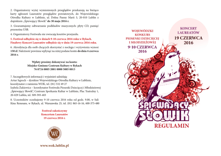 2. Organizatorzy wyżej wymienionych przeglądów przekazują na bieżąco karty zgłoszeń Laureatów przeglądów powiatowych, do Wojewódzkiego Ośrodka Kultury w Lublinie, ul. Dolna Panny Marii 3, 20-010 Lublin z dopiskiem ,,Śpiewający Słowik” do 30 maja 2016 r. 3. Gwarantujemy odtwarzanie podkładów muzycznych: płyty CD, pamięć przenośna USB. 4. Organizatorzy Festiwalu nie zwracają kosztów przejazdu. 5. Festiwal odbędzie się w dniach 9-10 czerwca 2016 roku w Rykach. Finałowy Koncert Laureatów odbędzie się w dniu 19 czerwca 2016 roku. 6. Akredytacja dla osób chcących skorzystać z noclegu i wyżywienia wynosi 150 zł. Należność powinna wpłynąć na niżej podane konto do dnia 4 czerwca 2016 r. Wpłaty prosimy dokonywać na konto: Miejsko-Gminne Centrum Kultury w Rykach 76 8724 0005 2001 0000 5005 0013 7. Szczegółowych informacji i wyjaśnień udzielają: Artur Sępoch – dyrektor Wojewódzkiego Ośrodka Kultury w Lublinie, koordynator z ramienia WOK, tel. (81) 532 49 27 Izabela Żukiewicz – koordynator Festiwalu Piosenki Dziecięcej i Młodzieżowej ,,Śpiewający Słowik”, Centrum Spotkania Kultur w Lublinie, Plac Teatralny 1, 20-029 Lublin, tel. 509-593-403 8. Uczestników oczekujemy 9-10 czerwca 2016 roku od godz. 9.00, w Sali Kina Renesans, w Rykach, ul. Warszawska 25, tel. (81) 865-16-16, 600-375-480 Festiwal zakończymy Koncertem Laureatów 19 czerwca 2016 r. REGULAMIN I. CEL IMPREZY • • • • • Prezentacja dorobku artystycznego solistów. Popularyzacja śpiewania piosenek i ukierunkowanie właściwego doboru repertuaru. Wymiana pomysłów i doświadczeń wykonawców, instruktorów i nauczycieli. Promowanie dziecięcej i młodzieżowej twórczości artystycznej. Promocja piosenki polskiej (polskie teksty, polscy kompozytorzy). II. OCENA a) Uczestnicy Festiwalu startują w kategoriach: • I kategoria – 6-10 lat • II kategoria – 11-13 lat • III kategoria – 14-16 lat • IV kategoria – 17-20 lat b) Każdy wykonawca przygotowuje 2 utwory. Prezentuje jeden wybrany przez siebie, a drugi na wyraźną prośbę jurorów. W KONKURSIE WOJEWÓDZKIM OBOWIĄZUJE WYKONANIE DWÓCH UTWORÓW Do etapu Wojewódzkiego może być nominowanych maksymalnie 5 osób c) Jury w swojej ocenie kierować się będzie następującymi kryteriami: • dobór repertuaru dostosowany do wieku uczestników, • wykonanie, • walory wychowawcze, • ogólny wyraz artystyczny; d) Jury będzie zwracać uwagę na teksty i kompozycje własne; e) Znalezienie się w gronie laureatów eliminacji powiatowych nie jest równoznaczne z otrzymaniem nominacji do Festiwalu Wojewódzkiego. Nominowani zostaną zawiadomieni po zakończeniu wszystkich przesłuchań (w powiatach). III. WARUNKI UCZESTNICTWA Warunkiem uczestnictwa w Wojewódzkim Festiwalu Piosenki Dziecięcej i Młodzieżowej: 1. Nominacja z przeglądów powiatowych i międzypowiatowych. POWIAT ŁUKÓW – 16-17 KWIETNIA Łukowski Ośrodek Kultury – godz. 10.00, ul. Wyszyńskiego 20, 21-400 Łuków, Kontakt: Elżbieta Jaroszyńska, tel. (25) 798-32-72 POWIAT GRODZKI LUBLIN – 30 MAJA Centrum Spotkania Kultur – godz. 10.00, Plac Teatralny 1, 20-029 Lublin, Kontakt: Izabela Żukiewicz, tel. 509-593-403 POWIAT PUŁAWSKI – 21 KWIETNIA Gminny Ośrodek Kultury – godz. 10.00, ul. Rynek 35, 24-160 Wąwolnica, Kontakt: Irena Katarzyna Kolibska, tel. 501-360-325 POWIAT LUBARTÓW – 22 MAJA Gminny Ośrodek Kultury w Kamionce – godz. 10.00, ul. Grobelna 14, 21-132 Kamionka, Kontakt: Damian Mika, tel. (81) 852-71-54, 511-205-116 POWIAT TOMASZÓW – 14 MAJA Tomaszowski Dom Kultury – godz. 10.00, ul. Lwowska 72, 22-600 Tomaszów, Kontakt: Róża Kucharczyk, tel. (84) 664-44-51 POWIAT ŁĘCZNA – 26 KWIETNIA Centrum Kultury – godz. 10.00, ul. Obrońców Pokoju 1, 21-010 Łęczna, Kontakt: Marek Wojciechowski, tel. (81) 752-15-47 POWIAT WŁODAWA – 19 MAJA Młodzieżowy Dom Kultury we Włodawie – godz. 9.00, ul. Partyzantów 17, 22-200 Włodawa, Kontakt: Mikołaj Butryn, tel. (82) 572-65-31 POWIAT JANÓW LUBELSKI – 24 KWIETNI A Janowski Ośrodek Kultury – godz. 10.00, ul. Prosta 31, 23-300 Janów Lubelski, Kontakt: Aleksander Krzos, tel. (15) 872-46-77 POWIAT KRASNYSTAW – 12 MAJA Młodzieżowy Dom Kultury – godz. 10.00, ul. Piłsudskiego 5A, 22-300 Krasnystaw, Kontakt: Anna Klus, tel. (82) 576-20-97, 669-110-670 POWIAT HRUBIESZÓW – 21 KWIETNIA Hrubieszowski Dom Kultury – godz. 11.00, ul. 3-Maja 7, 22-500 Hrubieszów, Kontakt: Krzysztof Gumiela, tel. 504-174-612 POWIAT ZAMOŚĆ – 17 MAJA Krasnobrodzki Dom Kultury – godz. 10.00, ul. 3-Maja 26, 22-440 Krasnobród, Kontakt: Mariola Czapla, tel. (84) 660-71-17 POWIAT RYKI – 27 KWIETNIA Miejsko-Gminne Centrum Kultury – godz. 10.00, ul. Warszawska 11, 08-500 Ryki, Kontakt: Bogumiła Porowska, tel. (81) 865-16-16 POWIAT BIALSKI GRODZKI – 21 KWIETNIA Sala Widowiskowo-Konferencyjna – godz. 16.00, ul. Brzeska 41, 21-500 Biała Podlaska, Kontakt: Krzysztof Olesiejuk – Bialskie Centrum Kultury, tel. (83) 342-62-96 POWIAT BIALSKI ZIEMSKI – 22 KWIETNIA Gminny Ośrodek Kultury – godz. 13.00, ul. Rynek 14, 21-500 Sławatycze, Kontakt: Bolesław Szulej, tel. (83) 378-34-73, 607-529-451 POWIAT OPOLE LUBELSKIE – 18 MAJA Miejsko-Gminny Ośrodek Kultury w Opolu Lubelskim – godz. 10.00, ul. Ogrodowa 9, 24-300 Opole Lubelskie, Kontakt: Małgorzata Borowiak, tel. (81) 827-25-67 POWIAT RADZYŃ PODLASKI – 13 KWIETNIA Radzyński Ośrodek Kultury i Rekreacji – godz. 10.00, ul. Jana Pawła 4, 21-300 Radzyń Podlaski, Kontakt: Wojciech Gil, tel. (83) 352-73-14 POWIAT KRAŚNIK – 18 MAJA Centrum Kultury w Annopolu – godz. 10.00, ul. Radomska, 23-235 Annopol, Kontakt: Joanna Markiewicz, tel. (15) 861-31-83 POWIAT ZIEMSKI LUBLIN – 12-13 MAJA Miejsko-Gminny Centrum Kultury w Jabłonnie z siedzibą w Piotrkowie – godz. 10.00, ul. 23-114 Jabłonna, Kontakt: Edmund Kuryluk, tel. (81) 561-30-21 POWIAT PARCZEW – 26 KWIETNIA Centrum Kultury w Parczewie – 