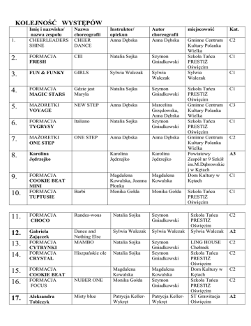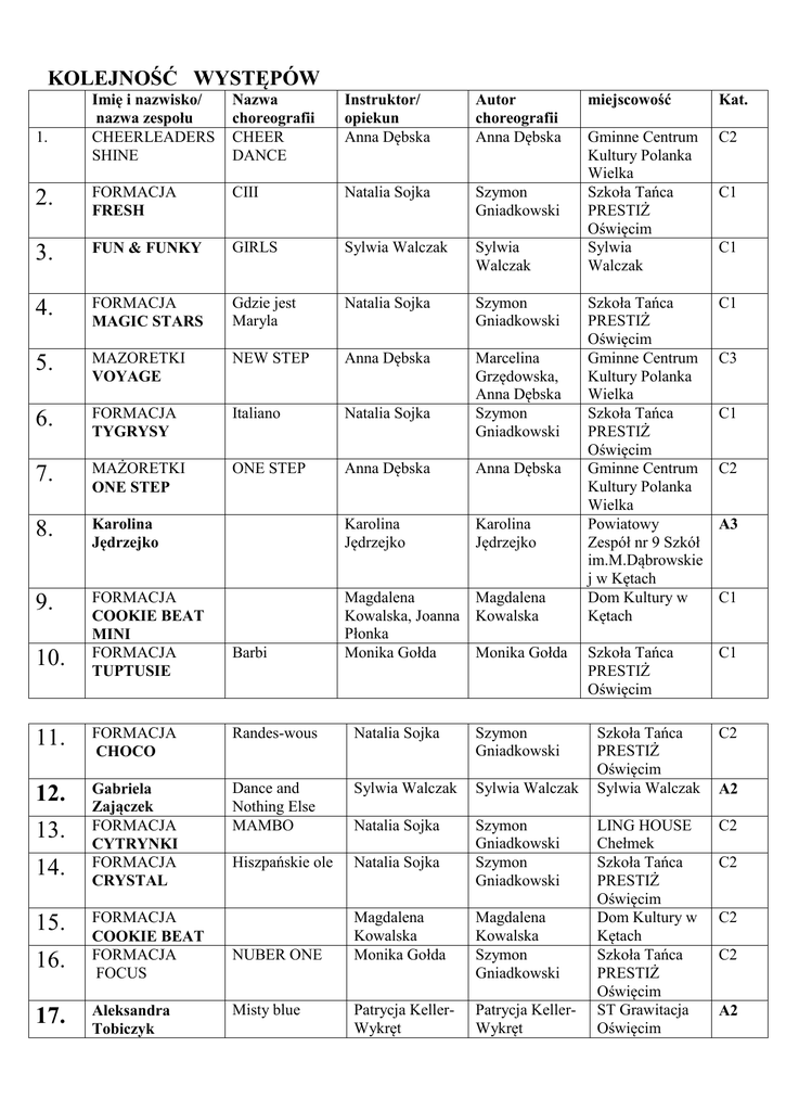 KOLEJNOŚĆ WYSTĘPÓW Imię i nazwisko/ nazwa zespołu CHEERLEADERS SHINE Nazwa choreografii CHEER DANCE Instruktor/ opiekun Anna Dębska Autor choreografii Anna Dębska 2. FORMACJA FRESH CIII Natalia Sojka Szymon Gniadkowski 3. FUN & FUNKY GIRLS Sylwia Walczak Sylwia Walczak 4. FORMACJA MAGIC STARS Gdzie jest Maryla Natalia Sojka Szymon Gniadkowski 5. MAZORETKI VOYAGE NEW STEP Anna Dębska 6. FORMACJA TYGRYSY Italiano Natalia Sojka Marcelina Grzędowska, Anna Dębska Szymon Gniadkowski 7. MAŻORETKI ONE STEP ONE STEP Anna Dębska Anna Dębska 8. Karolina Jędrzejko Karolina Jędrzejko Karolina Jędrzejko 9. FORMACJA COOKIE BEAT MINI FORMACJA TUPTUSIE Magdalena Magdalena Kowalska, Joanna Kowalska Płonka Monika Gołda Monika Gołda 1. 10. Barbi 11. FORMACJA CHOCO Randes-wous Natalia Sojka Szymon Gniadkowski 12. Gabriela Zajączek FORMACJA CYTRYNKI FORMACJA CRYSTAL Dance and Nothing Else MAMBO Sylwia Walczak Sylwia Walczak Natalia Sojka Hiszpańskie ole Natalia Sojka Szymon Gniadkowski Szymon Gniadkowski NUBER ONE Magdalena Kowalska Monika Gołda Magdalena Kowalska Szymon Gniadkowski Patrycja KellerWykręt Patrycja KellerWykręt 13. 14. 15. 16. 17. FORMACJA COOKIE BEAT FORMACJA FOCUS Aleksandra Tobiczyk Misty blue miejscowość Kat. Gminne Centrum Kultury Polanka Wielka Szkoła Tańca PRESTIŻ Oświęcim Sylwia Walczak C2 Szkoła Tańca PRESTIŻ Oświęcim Gminne Centrum Kultury Polanka Wielka Szkoła Tańca PRESTIŻ Oświęcim Gminne Centrum Kultury Polanka Wielka Powiatowy Zespół nr 9 Szkół im.M.Dąbrowskie j w Kętach Dom Kultury w Kętach C1 Szkoła Tańca PRESTIŻ Oświęcim C1 C1 C1 C3 C1 C2 A3 C1 Szkoła Tańca PRESTIŻ Oświęcim Sylwia Walczak C2 LING HOUSE Chełmek Szkoła Tańca PRESTIŻ Oświęcim Dom Kultury w Kętach Szkoła Tańca PRESTIŻ Oświęcim ST Grawitacja Oświęcim C2 A2 C2 C2 C2 A2 18. FORMACJA CHILLI Boney M Monika Gołda Szymon Gniadkowski 19. POWER FUNKY Sylwia Walczak Sylwia Walczak 20. FORMACJA SMILE Eat, Sleep, Funky,Reapit Un dos tres Monika Gołda Szymon Gniadkowski 21. Julia Puch Halleluja Patrycja KellerWykręt 22. FORMACJA LADIES DABUDEJ Patrycja KellerWykręt/ Artur Puch Monika Gołda 23. FORMACJA HAPPY In the Jungle Natalia Sojka Szymon Gniadkowski 24. FORMACJA POWER PINK DANCE Natalia Sojka Szymon Gniadkowski 25. FORMACJA MAMMA MIA Grease Monika Gołda Klaudia Barcik 26. FORMACJA EGZIST Military girls Monika Gołda Szymon Gniadkowski 27. FORMACJA PRIMA AMENO Natalia Sojka Szymon Gniadkowski 28. MOVE YOUR BODY FORMACJA EFEKT Magdalena Kowalska Monika Gołda Magdalena Kowalska Szymon Gniadkowski Ewelina Przystał Irena Wiktor Ewelina Przystał Irena Wiktor 29. 30. Ewelina Przystał Irena Wiktor The Best Voices in the World Uwikłani Szymon Gniadkowski Szkoła Tańca PRESTIŻ Oświęcim Sylwia Walczak Szkoła Tańca PRESTIŻ Oświęcim ST Grawitacja Oświęcim C2 Szkoła Tańca PRESTIŻ Oświęcim Szkoła Tańca PRESTIŻ Oświęcim LING HOUSE Chełmek C2 Szkoła Tańca PRESTIŻ Oświęcim Regionalny Ośrodek Kultury Doliny Karpia Zator Szkoła Tańca PRESTIŻ Oświęcim Dom Kultury w Kętach Szkoła Tańca PRESTIŻ Oświęcim Graboszyce C2 C2 A2 C2 C2 C3 C3 C3 C3 C3 B3