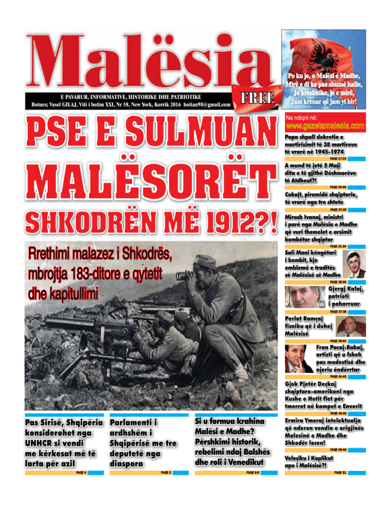 E PAVARUR, INFORMATIVE, HISTORIKE DHE PATRIOTIKE Botues; Vasel GILAJ, Viti i botim XXI, Nr 58, New York, Korrik 2016 [email protected] Papa shpall dekretin e martirizimit të 38 martireve të vrarë në 1945-1974 FAQE 17-19 A mund të jetë 5 Maji dita e të gjithë Dëshmorëve të Atdheut?! FAQE 20-26 Cokajt, piramidë shqiptarie, të vrarë nga tre shtete FAQE 27-30 Mirash Ivanaj, ministri i parë nga Malësia e Madhe që vuri themelet e arsimit kombëtar shqiptar Rrethimi malazez i Shkodrës, mbrojtja 183-ditore e qytetit dhe kapitullimi FAQE 31-34 Sali Mani këngëtari i kombit, kjo emblemë e traditës së Malësisë së Madhe FAQE 35-36 Gjergj Kalaj, patrioti i paharruar FAQE 37-38 Perlat Ramçaj fisniku që i duhej Malësisë FAQE 39-40 Fran Pacaj-Babaj, artisti që u fsheh pas modestisë dhe njeriu ëndërrtar FAQE 41-45 Gjok Pjetër Deçkaj shqiptaro-amerikani nga Kushe e Hotit flet për tmerret në kampet e Enverit FAQE 46-48 Pas Sirisë, Shqipëria konsiderohet nga UNHCR si vendi me kërkesat më të larta për azil FAQE 4 Parlamenti i ardhshëm i Shqipërisë me tre deputetë nga diaspora FAQE 5 Si u formua krahina Malësi e Madhe? Përshkimi historik, rebelimi ndaj Balshës dhe roli i Venedikut FAQE 6-8 Ermira Ymeraj intelektualja që nderon vendin e origjinës Malesinë e Madhe dhe Shkodër locen! FAQE 46-48 Veleçiku i Koplikut apo i Malësisë?! FAQE 51 KORRIK 2016 2 E PAVARUR, INFORMATIVE, HISTORIKE DHE PATRIOTIKE Ju fton të kontriboni, për promovimin dhe mbrojtjen e vlerave të patjetërsueshme që trashëguam si amanet nga të parët! Për gjithçka që juve interesoheni në fushën e krijimit dhe promovimit, me korrektësi dhe çmime konkurruese. KORRIK 2016 “Cakor” Restaurant Bar Një mundësi, një zgjedhje, një zgjidhje - Kuzhine speciale e të gjitha llojeve - Te Cakor këndojnë këngëtarët më të mirë të të gjitha trojeve Shqipetare në Ballkan. SHËRBEJMË EDHE ME POROSI TELEFONO: 718-733-1033 718-733-2300 ADRESA: 632 E 186th St, Bronx, NY 10458 WEB: www.cakorrestaurantny.com Korrektësi dhe çmime të leverdisshme Gëzimet tuaja marrin dimension të ri tek ne 3 KORRIK 2016 4 Pas Sirisë, Shqipëria me kërkesat më të larta për azil E PAVARUR, INFORMATIVE, HISTORIKE DHE PATRIOTIKE R epublika arabe e Sirisë ishte gjatë vitit të kaluar 2015, vendi i origjinës me numrin më të lartë për azilkërkuesit, e ndjekur nga Shqipëria, Serbia dhe Kosova, Afganistani, Iraku. Një fakt i tillë konfirmohet në raportin vjetor të UNHCR-së (Organizata Ndërkombëtare e Refugjatëve) “Tendenca Globale”, i cili ndjek zhvendosjet e detyruara në mbarë botën, bazuar në të dhënat e qeverive, partnerëve, përfshirë Qendrën Monitoruese të Zhvendosjeve të Brendshme. Publikuar pikërisht në Ditën Botërore të Refugjatëve, ai tregon sesi duke filluar nga fundi i vitit 2015, janë zhvendosur plot 65.3 milion njerëz, krahasuar me 59.5 milion vetëm dymbëdhjetë muaj më parë. “Kjo është hera e parë që pragu prej 60 milionësh është kapërcyer”,- shpjegon UNHCR për situacionin e emigrimit më vitin 2015. Duke shtuar se Gjermania ishte pritësi më i madh i kërkesave të reja për azil, me 441,900 të regjistruar gjatë vitit 2015. Kjo është më shumë se dyfishi i numrit të regjistruar një vit më parë (173.100) dhe rritja e tetë radhazi për Gjermani. Numri më i madh i aplikimeve është pranuar për individë me origjinë nga Republika Arabe të Sirisë- 158,700 aplikacione të reja, ose rreth katër herë më shumë se gjatë vitit 2014 (39,300). UNHCR referon se më tej edhe faktin se Gjermania pa një rritje dramatike të numrit të aplikacioneve të reja për azil nga shqiptarët me rreth 53,800 kërkesa të tilla, ose gjashtë herë më shumë se një vit më parë. Kurse për në Shtetet e Bashkuara të Amerikës aplikimet për azil në vitin 2015 thuhet se u rritën me nivelin prej 42%. “Këta individë vijnë kryesisht nga Meksika, El Salvador, Guatemala dhe Honduras kryesisht prej dhunës dhe persekutimit të krijuara nga krimi i organizuar i lidhur me bandat e drogës”, citon UNHCR-ja. Duke përfunduar se Suedia renditet e treta në vitin 2015 me 156,400 aplikime të reja për azil, më shumë se dyfishi i vitit të mëparshëm (75,100). Ndërsa ka pasur një rritje të konsiderueshme në pretendimet siriane për azil. KORRIK 2016 5 Parlamenti i ardhshëm i Shqipërisë me tre deputetë nga diaspora V izitat e koheve te fundit,te dy liderve kryesore te politikes se Shqiperise L.Basha dhe E.Rama ne SH.B.A dhe takimet e tyre me Diosporen,e ne vecanti ajo e Kryeministerit Rama ndonese ende te pa bera publike per opinionin,por vetem per rrethet e ngushta te tyre.Kane zbuluar nje sekret dhe qe eshte parashikimi se Parlamenti i ardhshem i shqiperise do te kete se paku 3 Deputet nga diaspora ne SH.B.A,dhe jo vetem pasi perfaqesues te Emigracionit ne Politiken e ardhshme te shqiperise,do te kete edhe nga vendet Europiane e ndoshta edhe nga Kanadaja. Dhe konkretishte sic jane Italia,Greqia,Anglia,apo Gjermania,gjithsesi ky eshte vetem fillimi dhe parashikimi i ketij procesi, sa te formohet dhe te miratohet vendimi per pjesmarrjen ne votim te te gjithe shtetaseve te Shqiperise kudo ku ata ndollen ne te gjithe boten,proces i cili edhe pse ne pamje te pare te duket i veshtire teknologjia e sotme dhe nje organizim sa me i mire do ta munesonte realishte ,dhe qe pa dyshim nje pjesmarrje e tille tashme eshte bere edhe domozdoshmeri e kohes. Gjithashtu behet me dije se eshte duke u punuar edhe per percaktimin e numerit te deputeteve per seicilin shtet. Sa i takon Diaspores se shqiperise ne sh.b.a ajo do te perfaqesohet se paku me 3 deputet,ne Parlamentin e erdhshem te Shqiperise, zgjelljet e te cilit do te mbahen ne mesin e vitit 2017. Sa i takon numerit te pergjithshem nga te gjitha vendet te marra se bashku burimi ne fjal sqaron per gazeten Malesia se do te jene gjithsejt 11 persona ,ose 11 vende ne Parlament qe do tu lihe