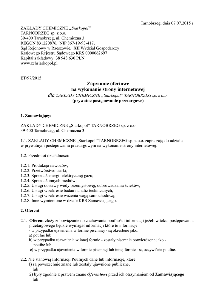 Tarnobrzeg, dnia 07.07.2015 r ZAKŁADY CHEMICZNE „Siarkopol” TARNOBRZEG sp. z o.o. 39-400 Tarnobrzeg, ul. Chemiczna 3 REGON 831220876, NIP 867-19-93-417, Sąd Rejonowy w Rzeszowie, XII Wydział Gospodarczy Krajowego Rejestru Sądowego KRS 0000062697 Kapitał zakładowy: 38 943 630 PLN www.zchsiarkopol.pl ET/97/2015 Zapytanie ofertowe na wykonanie strony internetowej dla ZAKŁADY CHEMICZNE „Siarkopol” TARNOBRZEG sp. z o.o. (prywatne postępowanie przetargowe) 1. Zamawiający: ZAKŁADY CHEMICZNE „Siarkopol” TARNOBRZEG sp. z o.o. 39-400 Tarnobrzeg, ul. Chemiczna 3 1.1. ZAKŁADY CHEMICZNE „Siarkopol” TARNOBRZEG sp. z o.o. zapraszają do udziału w prywatnym postępowaniu przetargowym na wykonanie strony internetowej. 1.2. Przedmiot działalności: 1.2.1. Produkcja nawozów; 1.2.2. Przetwórstwo siarki; 1.2.3. Sprzedaż energii elektrycznej gazu; 1.2.4. Sprzedaż innych mediów; 1.2.5. Usługi dostawy wody przemysłowej, odprowadzania ścieków; 1.2.6. Usługi w zakresie badań i analiz technicznych; 1.2.7. Usługi w zakresie ważenia wagą samochodową; 1.2.8. Inne wymienione w dziale KRS Zamawiającego. 2. Oferent 2.1. Oferent złoży zobowiązanie do zachowania poufności informacji jeżeli w toku postępowania przetargowego będzie wymagał informacji które to informacje - w przypadku ujawnienia w formie pisemnej - są określone jako: a) poufne lub b) w przypadku ujawnienia w innej formie - zostały pisemnie potwierdzone jako poufne lub c) w przypadku ujawnienia w formie pisemnej lub innej formie - są oczywiście poufne. 2.2. Nie stanowią Informacji Poufnych dane lub informacje, które: 1) są powszechnie znane lub zostały ujawnione publiczne, lub 2) były zgodnie z prawem znane Oferentowi przed ich otrzymaniem od Zamawiającego lub 3) zostały bez żadnych ograniczeń przekazane przez Zamawiającego jakiejkolwiek osobie trzeciej, lub 4) zostały niezależnie uzyskane przez którąkolwiek ze Stron bez wykorzystania lub opierania się na Poufnych Informacjach, lub 5) mogą zostać uzyskane zgodnie z prawem od osoby trzeciej, lub 6) zostały niezależnie opracowane przez Oferenta 2.3. Przystąpienie Oferenta do postępowania przetargowego jest zrównane ze złożeniem oświadczenia o dochowaniu należytej staranności z uwzględnieniem zawodowego charakteru jego działalności. 2.4. Przystąpienie Oferenta do postępowania przetargowego jest zrównane ze złożeniem oświadczenia o braku przeszkód faktycznych i prawnych do należytej realizacji projektu. 2.5. Koszty przygotowania oferty ponosi Oferent. 3. Założenia projektu wykonania strony internetowej dla ZCh „Siarkopol” 3.1. Realizacja projektu nie może naruszać praw osób trzecich. Za wszelkie naruszenia Oferent / Wykonawca zobowiązuje się do poniesienia wszelkich kosztów wynikających z naruszenia. 3.2. Zamawiający zastrzega sobie prawo podziału projektu na etapy a w szczególności: 3.2.1. etap I 3.2.1.1. opracowanie koncepcji strony Internetowej lub wskazanie projektu (projektów) referencyjnego wykonanego przez Oferenta; 3.2.1.2. opis proponowanych rozwiązań technicznych lub technologii informatycznych w ramach projektu (CMS, Baza danych, Serwer, wersje obcojęzyczne ( nierównoległe ), itd. ( wymagany CMS LifeRay i baza PostgreSQL ) 3.2.2. etap II 3.2.2.1 realizacja projektu a w szczególności określenie zakresu materiałów do publikacji na stronie Internetowej oraz sposobu ich przekazywania Wykonawcy 3.3. Wszelkie spory wynikłe w trakcie realizacji projektu wykonania strony Internetowej będą rozstrzygane przez sądy powszechne według właściwości miejscowej dla Zamawiającego. 4. Oferta powinna zawierać: 4.1. Cenę wykonania strony Internetowej. 4.2. Termin wykonania prac od dnia podpisania umowy. 4.3. Termin ważności oferty. 4.4. Warunki płatności. 4.5. Załączniki: 4.5.1. Dane dotyczące uprawnień do prowadzenia działalności w zakresie oferty; 4.5.2. Odpis aktualny KRS lub wpis do EDG; 4.5.3. Potwierdzenie ubezpieczenia odpowiedzialności cywilnej z tytułu prowadzonej działalności ; 4.5.4. Listę referencyjna oraz kopie posiadanych certyfikatów systemu zarządzania jakością,; 5. Oferty będą oceniane według poniższych kryteriów 5.1. Innowacyjność przedstawionego projektu, kreowanie wizerunku Zamawiającego w sieci Internet; 5.2. Kompletność złożonej oferty; 5.3. Cena i termin realizacji projektu; 5.4. Warunki regulowania należności; 5.5. Referencje na wykonanie projektów o tym samym profilu a w szczególności dla firm o profilu podobnym do Zamawiającego; 5.6. Posiadanie certyfikatu systemu zarządzania jakością. 6. Termin i miejsce składania ofert. Prosimy o przygotowanie ofert w terminie do dnia 31.07.2015 r. Oferty w kopertach z dopiskiem „Strona internetowa”, należy składać w formie papierowej w siedzibie Zamawiającego (Kancelaria, pokój 101 ). Dopuszcza się złożenie oferty w wersji elektronicznej po której należy dosłać wersję papierową. Decyduje data wpływu do kancelarii lub sygnatura czasowa serwera pocztowego ZCh „Siarkopol” 7. Osoby do kontaktów: Osoba upoważniona do prowadzenia uzgodnień oraz wyjaśnień w zakresie niniejszej oferty: Antoni Mączka [email protected] Tel.: 15 856 5840