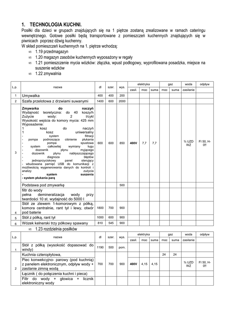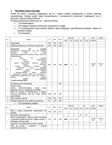1. TECHNOLOGIA KUCHNI. Posiłki dla dzieci w grupach znajdujących się na 1 piętrze zostaną zrealizowane w ramach cateringu wewnętrznego. Gotowe posiłki będą transportowane z pomieszczeń kuchennych znajdujących się w piwnicach poprzez dźwig kuchenny. W skład pomieszczeń kuchennych na 1. piętrze wchodzą: • 1.19 przedmagazyn • 1.20 magazyn zasobów kuchennych wyposażony w regały • 1.21 pomieszczenie mycia wózków: złączka, wpust podłogowy, wyprofilowana posadzka, miejsce na suszenie wózków • 1.22 zmywalnia elektryka L.p. 1 2 nazwa Umywalka Szafa przelotowa z drzwiami suwanymi dl szer. wys. 400 400 200 1400 600 2000 600 600 850 gaz zasil. moc suma 400V 7,7 7,7 moc woda suma odpływ zasilanie Zmywarka do naczyń Wydajność teoretyczna: do 40 koszy/h Zużycie wody: 2 l/cykl Wysokość wejścia do komory mycia: 425 mm Wyposażenie: 1 kosz do naczyń 1 kosz uniwersalny 3 4 5 6 system filtracji pompa podnosząca ciśnienie płukania pompa spustowa system całkowitej wymiany ługu dozownik płynu myjącego dozownik płynu nabłyszczającego diagnoza błędów jednoprzyciskowy panel sterujący - wbudowana pamięć USB do komunikacji z możliwością wygenerowania danych do kontroli i analizy zużycia system suszenia - system płukania parą Podstawa pod zmywarkę filtr do wody pełna demineralizacja wody przy twardości 10 st. wydajność do 5000 l Stół ze zlewem 1-komorowym z półką, komora centralnie, rant tył i lewy, otwór 1800 pod baterie 1000 Stół z półką, rant tył 810 Wózek kelnerski trzy półkowy spawany • L.p. 2 FI 50, H0!! woda odpływ 500 700 900 600 900 545 900 szer. wys. 1.23 rozdzielnia posiłków nazwa dl elektryka zasil. 1 ¾ UZD WZ Stół z półką (wysokość dopasować do 1190 windy) Kuchnia czteropłytowa, Piec konwekcyjno- parowy (pod kuchnią) z panelem elektronicznym, odpływ wody + 700 zasilanie zimną wodą Łącznik ( do połączenia kuchni i pieca) Filtr do wody + głowica + licznik elektroniczny wody 500 700 moc gaz suma moc suma 24 24 zasilanie pom. 900 400V 4,15 4,15 ¾ UZD WZ FI 50, H0!! L.p. 3 4 5 6 nazwa dl Okap przyścienny wywiewno-nawiewny z wiązką wychwytującą, filtrami cyklonowocylindrycznymi typu JCE, o sprawności filtracji tłuszczu do 93%, stałe opory przepływu powietrza 50-65 Pa, nawiewniki wyporowe z obrotowymi dyszami i przepustnicami tłumiącymi akustycznie, filtry tłuszczowe JCE oraz 1300 nawiewniki do mycia w zmywarkach, tłuszcz gromadzony w filtrach bez rynienek ściekowych, brak ścianek działowych w okapie, oświetlenie zintegrowane, króćce do pomiaru ciśnienia, wykonanie stal nierdzewna AISI 304, ogólna sprawność okapu 97%. (WG PROJEKTU WENTYLACJI) Stół bez półki, bez wspornika przedniego, 500 rant tył i lewy, tył przystający na 60 mm Stół ze zlewem jednokomorowym z półką, otwór pod baterię, rant tył i prawy, 100 komora po lewej stronie stół z miejscem na lodówkę, trzy szuflady, 1200 drzwi zawiasowe, rant tył szer. 1200 540 700 900 600 900 600 900 7 Lodówka podblatowa ze stali nierdzewnej 600 600 850 8 szafka z drzwiami suwanymi 1450 400 900 9 Lodówka o poj. 700l. Z drzwiami ze stali nierdzewnej, wnętrze tworzywo sztuczne kolor biały, sterowanie elektroniczne, 6-c półek 750 750 2064 10 Umywalka z maskownicą, otwór pod baterie 400 400 200 Wózek z szafką z drzwiami suwanymi termos zamykany na klamry na pojemnik GN 1/1 h-200 2 sztuki 800 600 850 645 445 315 13 stół z drzwiami suwanymi 1200 700 900 14 Stół ze zlewem i półką perforowaną, KOMORA 500*500*250 700 700 900 15 Szafka wisząca z dnem perforowanym 700 400 600 11 12 elektryka wys. gaz zasil. moc suma 230V 0,1 0,1 230V 0,09 0,09 230V 0,15 0,15 moc suma woda odpływ zasilanie Zespół pomieszczeń zaplecza socjalnego dla pracowników kuchni znajduje się przy pomieszczeniach kuchennych w piwnicy.