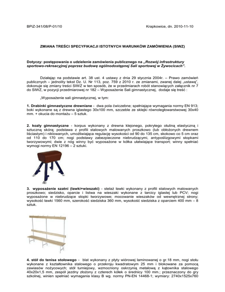 BPiZ-341/08/P-01/10 Krapkowice, dn. 2010-11-10 ZMIANA TREŚCI SPECYFIKACJI ISTOTNYCH WARUNKÓW ZAMÓWIENIA (SIWZ) Dotyczy: postępowania o udzielenie zamówienia publicznego na „Rozwój infrastruktury sportowo-rekreacyjnej poprzez budowę ogólnodostępnej Sali sportowej w śywocicach”. Działając na podstawie art. 38 ust. 4 ustawy z dnia 29 stycznia 2004r. – Prawo zamówień publicznych – jednolity tekst Dz. U. Nr 113, poz. 759 z 2010 r. ze zmianami, zwanej dalej „ustawą”, dokonuje się zmiany treści SIWZ w ten sposób, Ŝe w przedmiarach robót stanowiących załącznik nr 7 do SIWZ, w pozycji przedmiarowej nr 182 – WyposaŜenie Sali gimnastycznej, dodaje się treść : „WyposaŜenie sali gimnastycznej, w tym: 1. Drabinki gimnastyczne drewniane - dwa pola ćwiczebne; spełniające wymagania normy EN 913; boki wykonane są z drewna iglastego 30x100 mm, szczeble ze sklejki równoległowarstwowej 30x40 mm. + okucia do montaŜu – 5 sztuk. 2. kozły gimnastyczne - korpus wykonany z drewna klejonego, pokrytego otuliną elastyczną i sztuczną skórą; podstawa z profili stalowych malowanych proszkowo (lub obłoŜonych drewnem liściastym) i niklowanych, umoŜliwiająca regulację wysokości od 90 do 135 cm, skokowo co 5 cm oraz od 110 do 170 cm; nogi podstawy zabezpieczone niebrudzącymi, antypoślizgowymi stopkami tworzywowymi; dwie z nóg winny być wyposaŜone w kółka ułatwiające transport; winny spełniać wymogi normy EN 12196 – 2 sztuki. 3. wyposaŜenie szatni (ławki+wieszaki) - stelaŜ ławki wykonany z profili stalowych malowanych proszkowo; siedzisko, oparcie i listwa na wieszaki wykonane z tarcicy iglastej lub PCV; nogi wyposaŜone w niebrudzące stopki tworzywowe; mocowanie wieszaków od wewnętrznej strony; wysokość ławki 1560 mm, szerokość siedziska 360 mm, wysokość siedziska z oparciem 400 mm – 8 sztuk. 4. stół do tenisa stołowego - blat wykonany z płyty wiórowej laminowanej o gr.18 mm, nogi stołu wykonane z kształtownika stalowego o przekroju kwadratowym 25 mm i blokowane za pomocą zawiasów noŜycowych; stół turniejowy, wzmocniony oskrzynią metalową z kątownika stalowego 40x20x1,5 mm, zespół jezdny złoŜony z czterech kółek o średnicy 100 mm.; przeznaczony do gry szkolnej, winien spełniać wymagania klasy B wg. normy PN-EN 14468-1; wymiary: 2740x1525x760 mm, w kartonie 1600x130x1850 mm.; kolor stołu szarozielony – 1 sztuka, plus 4 sztuki rakietek i 4 paczki piłeczek po 6 sztuk, plus siatka oraz tablica wyników – 1 sztuka (wg. poniŜszej specyfikacji) Składana podstawa wykonana z twardej tektury, pokrytej folią, a obrotowo zamocowane tabliczki z cyframi z płyty PCV; cyfry na tabliczkach naniesione obustronnie, umoŜliwiając odczyt aktualnego wyniku z dwóch stron (od strony zawodników i widzów); Wymiary gabarytowe (długość x szerokość wysokość ) 490x220x280, po złoŜeniu zajmować winny powierzchnię 490x300 mm. 5. ławeczka gimnastyczna 2m - nogi metalowe; ławka wykonana z drewna iglastego lub liściastego, nogi stalowe posiadają kółeczka ułatwiające jej przemieszczanie; wsporniki stalowe łączące elementy ławki usztywniają jej konstrukcję zapewniając stabilność oraz bezpieczeństwo eksploatacji; wszystkie krawędzie płyty, belki oraz nóg są zaokrąglone; ławka winna posiadać stały zaczep umoŜliwiający zawieszanie na drabinkę, drąŜek lub skrzynię gimnastyczną. Po odwróceniu - belka ławki o szerokości 10 cm moŜe słuŜyć jako równowaŜnia; Ławka winna spełniać wymogi normy EN-913 - 8 sztuk ławeczek 6. skrzynia gimnastyczna 5 częściowa - segmenty skrzyni wykonane ze sklejki liściastej, naroŜniki i czopy z twardego drewna; Wysoką sztywność kaŜdego segmentu zapewniać winno łączenie poszczególnych jego elementów poprzez klejenie i skręcanie, a stabilność całej skrzyni zapewnić winny pasowane czopy; Górny segment skrzyni pokryty jest sztuczną skórą; Skrzynia wyposaŜona jest w wózek dla ułatwienia transportu winna spełniać wymogi normy EN 916; Wymiary skrzyni: wys: 1100 mm, dł: 1340 mm, szer: 750 mm; Wymiary poduszki: gr: 60 mm, dł: 1400 mm, szer: 400 mm 2 sztuki. 7. Materac gimnastyczny - (200x120x10cm) MG10-S/N z materiału waga: 6 kg opis: Materac gimnastyczny o gr. 5 cm, wkład wykonany z pianki o zwiększonej gęstości; Pokrowiec materaca wykonany z materiału typu Poroflex (Skaj), wzmocniony naroŜnikami, winien spełniać wymogi normy EN 12503 – 10 sztuk. 8. Wózek na materace o wymiarach : platforma 1950 x 950 mm, wysokość uchwytu powyŜej poziomu platformy 600 mm; Podłoga wykonana jest z kształtownika stalowego 50 x 30 mm i poprzeczek z kształtownika 20 x 20 mm; Uchwyt z kształtownika 25 x 25 mm łączony jest z platforą rozłącznie 4 śrubami; Wózek winien mieć 4 zespoły jezdne o średnicy 100 mm, w tym dwa skrętne, umoŜliwiające manewrowanie; Wózek pomalowany jest emalią epoksydową proszkową; Wymiary gabarytowe wózka 2100 x 950 x 800 mm; Przystosowany do przewozu max. 6 szt. materacy 2 x 1,2 m o gr. 10 cm w pozycji poziomej – 1 sztuka 9. Plotki LA treningowe - przeznaczony do treningu biegów przez płotki; Podstawa i ramiona płotka z kształtownika stalowego pokrytego powłokami ochronnymi, belka z drewna pomalowana w biało czarne pasy; regulacja wysokości płotka w zakresie: 68 cm; 76,2 cm; 84 cm; 91,4 cm; 100 cm; 106,7 cm; Wyrób winien byc zgodny z przepisami PZLA – 10 sztuk. 10.piłki lekarskie - wykonane ze skóry naturalnej, podklejone tkaniną tzw. dwusklejką, wypełnieniepianka poliuretanowa, warstwa wierzchnia- ścier gumowy, szyte maszynowo oraz ręcznie – 10 sztuk. 11. piłki do siatkówki - Piłka zatwierdzona przez Five; Rozmiar 5, waga 260-280g, obwód 65-67cm – 10 sztuk. 12. Piłki do koszykówki - 10 szt. 13. Hula – hop- wykonane jest z tworzywa sztucznego – 10 sztuk. 14. Szarfy o wymiarach: obwód 120 cm; szerokość 4 cm - 20 szt.( 2 x po 10 sztuk w dwóch róŜnych kolorach