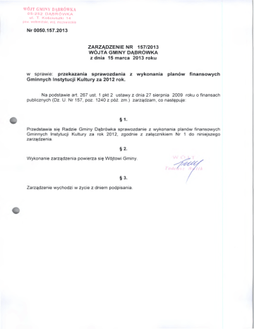 WÓJT GMINY DĄBRÓWKA 05-252 D Ą B R Ó W K A ul. T. Kościuszki 14 pow. w o ło m iń s k i, w o j. m a z o w ie c k ie Nr 0050.157.2013 ZA R ZĄ DZE NIE NR 157/2013 W Ó JTA G M INY DĄBRÓW KA z dnia 15 marca 2013 roku w sprawie: przekazania spraw ozdania Gminnych Instytucji Kultury za 2012 rok. z w ykonania planów finansowych Na podstawie art. 267 ust. 1 pkt 2 ustawy z dnia 27 sierpnia 2009 roku o finansach publicznych (Dz. U. Nr 157, poz. 1240 z póź. zm.) zarządzam, co następuje: § 1- Przedstawia się Radzie Gminy Dąbrówka sprawozdanie z wykonania planów finansowych Gminnych Instytucji Kultury za rok 2012, zgodnie z załącznikiem Nr 1 do niniejszego zarządzenia. § 2. Wykonanie zarządzenia powierza się Wójtowi Gminy. § 3. Zarządzenie wychodzi w życie z dniem podpisania. Załącznik Nr .4*. do Zarządzenia N r A ^ /2 0 1 3 Wójta Gminy Dąbrówka zd n ia SPRAWOZDANIE Z WYKONANIA PLANÓW FINANSOWYCH GMINNYCH INSTYTUCJI KULTURY GMINY DĄBRÓWKA ZA 2012 ROK Dąbrówka, 28.02.2013 r. SPRAWOZDANIE Z WYKONANIA PLANU FINANSOWEGO GMINNEGO CENTRUM KULTURY W DĄBRÓWCE ZA 2012 ROK Dąbrówka, 28.02.2013 r. SPRAWOZDANIE z wykonania planu finansowego Gminnego Centrum Kultury w Dąbrówce za 2012 rok Stosownie do postanowień ustawy o finansach publicznych Dyrektor Gminnego Centrum Kultury w Dąbrówce przedkłada sprawozdanie z wykonania planu finansowego i realizacji planu pracy za 2012 rok. Plan finansowy Gminnego Centrum Kultury w Dąbrówce na 2012 rok został opracowany i zatwierdzony Zarządzeniem Dyrektora Centrum. Na dzień 31.12.2012 r. przedstawiał się następująco: NAZWA PLAN WYKONANIE % WYKONANIA I. Przychody 621.210,44 595988,64 95,9 II. Koszty, w tym: 606.020,00 541.586,53 89,4 1. Koszty bieżące 558.444,48 494.011,01 88,5 2. Wydatki inwestycyjne 47-575,52 47.575,52 100,0 III. Wydzielona rezerwa na pierwsze miesiące działalności 15.190,44 - - RAZEM II + III 621.210,44 541586,53 87,2 Wpływy z prowadzonej działalności kulturalnej tj. wpłaty uczestników biorących udział w zajęciach języka angielskiego, pracowni plastycznej i rękodzieła, karate, aerobiku, wpłaty uczestników kursu nauki gry na gitarze oraz osób korzystających z usług Gminnego Centrum Informacji to kwota 51.749,30 zl. Środki od osób fizycznych - sponsorów przekazujących wpłaty na organizację bezpłatnego placu zabaw dla dzieci podczas Festynu historycznego to kwota 7.850,00 zł. Środki z innych źródeł, czyli refundacja z Powiatowego Urzędu Pracy części wynagrodzenia za zatrudnienie bezrobotnego i prowizja od Urzędu Skarbowego to łączna kwota 2.819,63 zł. Przychody z tytułu 2 dotacji celowych w kwocie 45.491,80 zl to przyznane środki finansowe na dofinansowanie operacji pt.: „Ocalić tożsamość” - wydanie albumu zawierającego archiwalne zdjęcia i dokumenty społeczności Gminy Dąbrówka oraz operacji „Folklor w krainie Bugu II” na podstawie podpisanych umów o przyznanie pomocy z zakresu małych projektów w ramach działania 413 „Wdrażanie lokalnych strategii rozwoju” objętego PROW na lata 2007 - 2013. Refundacja poniesionych środków finansowych w wysokości 25.000,00 zl związanych z realizacją operacji „Śladami historii Dąbróweckiej Ziemi” nastąpiła w miesiącu styczniu b r . Dotacja otrzymana z państwowych funduszy celowych na finansowanie lub dofinansowanie kosztów realizacji inwestycji i zakupów inwestycyjnych jednostek zaliczanych do sektora finansów publicznych dotycząca dofinansowania zadań w ramach programu Rozwój infrastruktury kultury, priorytet Infrastruktura domów kultury to kwota 34.000 zl na realizację zadania „Usłysz i zobacz Gminne Centrum Kultury - zakup nagłośnienia i oświetlenie do sali widowiskowej. Dotacja przedmiotowa z budżetu otrzymana przez pozostałe jednostki sektora finansów publicznych to kwota 1.100 zl przekazana przez Samorząd Województwa Mazowieckiego na pokrycie kosztów zorganizowania koncertu „Intermedia muzyczne” w ramach XII Finału Konkursu Poetyckiego „Cyprian Norwid Poeta Naszej Ziemi. Plan kosztów zatwierdzony został do wysokości 606.020,00 zł w tym: na bieżącą działalność określoną w statucie GCK - 558.444,48 zł. na wydatki inwestycyjne - 47.575,52 zł wydzielona rezerwa na pierwsze miesiące działalności Centrum w 2013 roku (do czasu uchwalenia budżetu i przekazania nowej dotacji) -15.190,44 zl. Realizacja kosztów w 2012 roku ukształtowała się na poziomie 89,4 % założonego planu, tj. w wysokości 541.586,53 zł. Koszty bieżące zrealizowano w wysokości 494.011,01 zł, co stanowi 88,5 % założonego planu, wydatki inwestycyjne zrealizowano w wysokości 47.575,52 zł czyli 100 % planu. Poniższa tabela wraz z częścią opisową prezentuje ich podział i przeznaczenie: Klasyfikacja Nazwa Plan II. KOSZTY 1. Koszty bieżące Wykonanie % wykonania 080/6050 2. Wydatki inwestycyjne Wydatki inwestycyjne 47-575,52 47-575,52 100,00 Razem wydatki inwestycyjne 4 7 5 7 5 ,5 2 4 7 575,52 1 0 0 ,0 0 RAZEM 1 + 2 6 0 6 .0 2 0 ,0 0 5 4 1 5 8 6 ,5 3 89,4 III. Wydzielona rezerwa na pierwsze miesiące działalności 15.190,44 - - OGÓŁEM II + III 621.210,44 541.586,53 87,2 Koszty nagród i wydatki osobowe nie zaliczane do wynagrodzeń to wypłata ekwiwalentu za używanie i pranie własnej odzieży roboczej dla pracowników na stanowisku sprzątaczka i starszy instruktor plastyczny. Koszty osobowe pracowników Centrum wraz ze składkami poniesionymi na rzecz ZUS i Fundusz Pracy stanowiły 47,9 % kosztów bieżących poniesionych na finansowanie Gminnego Centrum Kultury. Koszty wynagrodzeń bezosobowych to kwota 49.712,10 zł , w ramach których finansowane były: - honoraria dla artystów za wykonanie koncertu podczas XII Finału Konkursu Poetyckiego „Cyprian Norwid - Poeta naszej Ziemi”, wynagrodzenie dla chóru występującego podczas Uroczystości upamiętniającej 68 rocznicę zrzutów Żołnierzy Cichociemnych na placówkę odbiorczą „Imbryk” pod