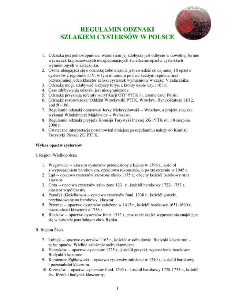 REGULAMIN ODZNAKI SZLAKIEM CYSTERSÓW W POLSCE 1. Odznaka jest jednostopniowa, warunkiem jej zdobycia jest odbycie w dowolnej formie wycieczek krajoznawczych uwzględniających zwiedzenie opactw cysterskich wymienionych w załączniku. 2. Osoba ubiegająca się o odznakę zobowiązana jest zwiedzić co najmniej 10 opactw cystersów z regionów I-IV, w tym minimum po dwa każdym regionie oraz przynajmniej jeden klasztor żeński cystersek wymieniony w części V załącznika. 3. Odznakę mogą zdobywać wszyscy turyści, którzy ukoń- czyli 10 lat. 4. Czas zdobywania odznaki jest nieograniczony. 5. Odznakę przyznają referaty weryfikacji OTP PTTK na terenie całej Polski. 6. Odznakę rozprowadza: Oddział Wrocławski PTTK, Wrocław, Rynek-Ratusz 11/12, kod 50-106. 7. Regulamin odznaki opracował Jerzy Niebrzydowski -- Wrocław, a projekt znaczka wykonał Włodzimierz Majdewicz -- Warszawa. 8. Regulamin odznaki przyjęła Komisja Turystyki Pieszej ZG PTTK dn. 18 sierpnia 2000 r. 9. Ostateczna interpretacja postanowień niniejszego regulaminu należy do Komisji Turystyki Pieszej ZG PTTK. Wykaz opactw cystersów I. Region Wielkopolska 1. Wągrowiec -- klasztor cystersów przeniesiony z Łękna w 1396 r., kościół z wyposażeniem barokowym, częściowa rekonstrukcja po zniszczeniu w 1945 r. 2. Ląd -- opactwo cystersów założone około 1175 r., obecny kościół barokowy oraz klasztor. 3. Obra -- opactwo cystersów zało- żone 1231 r., kościół barokowy 1722- 1757 r. klasztor współczesny. 4. Paradyż (Gościkowo) -- opactwo cystersów fund. 1230 r., kościół gotycki, przebudowany na barokowy, klasztor. 5. Przemęt -- opactwo cystersów założone w 1413 r., kościół barokowy 1651-1690 r., pozostałości klasztoru z 1758 r. 6. Bledzew -- opactwo cystersów fund. 1312 r., pozostałe części wyposażenia znajdujące się w kościele parafialnym obok Rynku. II. Region Śląsk 7. Lubiąż -- opactwo cystersów 1163 r., kościół w odbudowie. Budynki klasztorne -pałac opatów. Wielkie założenie architektoniczne. 8. Henryków -- opactwo cystersów 1225 r., kościół gotycki, wyposażenie barokowe. Budynki klasztorne. 9. Kamieniec Ząbkowicki -- opactwo cystersów założone w 1249 r., kościół barokowy i pozostałości klasztoru. 10. Krzeszów -- opactwo cystersów fund. 1292 r., kościół barokowy 1728-1735 r., kościół św. Józefa i budynek klasztorny. 1 11. Jemielnica -- opactwo cystersów fund. 1280 r., kościół gotycki rozbudowany na barokowy, budynek klasztorny. 12. Rudy -- opactwo cystersów fund. 1252 r., kościół romański przebudowany na barokowy. Klasztor. Pałac opata. Park krajobrazowy. III. Region Małopolska 13. Szczyrzyc -- zespół opactwa cystersów fund. 1245 r., kościół z 1620 r. przebudowany w XIX w. -- barokowy. Klasztor. Spichlerz. 14. Wąchock -- opactwo cystersów fund. 1179 r., obecny kościół z XIII w. z wystrojem barokowym. Klasztor, pałac opacki, brama. 15. Koprzywnica -- opactwo cystersów fund. 1185 r., obecnie kościół z XIII w. przebudowany w XVI-XVIII w. Klasztor. Dwór opacki. 16. Sulejów -- Podklasztorze -- opactwo cystersów fund. 1176 r. kościół z XIII w. wystrój barokowy. Klasztor, obwarowania, zabudowania gospodarcze. 17. Jędrzejów -- opactwo cystersów fund. 1140, przebudowa w XV w., rozbudowany w okresie baroku. Klasztor,dzwonnica, ogród. 18. Mogiła -- Nowa Huta -- opactwo cystersów fund. 1225 r., obecnie kościół z XIII w., przebudowany w XVIII w. na barokowy. Klasztor, pałac opacki. IV. Region Pomorze 19. Bierzwnik -- opactwo cystersów fund. 1282 r., obecnie kościół z XIV w. rozbudowany, klasztor, spichlerz. 20. Bukowo Morskie -- siedziba cystersów z XIII w., kościół podklasztorny z 1. poł. XIV w. 21. Kołbacz -- opactwo cystersów fund. 1173 r., kościół z XIII w., przebudowany w XVIII w. Klasztor, stodoła gotycka z XIII w. 22. Koronowo -- kościół cystersów z XIV w., wystrój barokowy. 23. Pelplin -- opactwo cystersów fund. 1274 r., gotycki kościół wystrój barokowy. Obecnie katedra. Klasztor. 24. Oliwa -- opactwo cystersów fund. 1188 r., kościół gotycki przebudowany. Klasztor, pałac opatów. Obecnie katedra. V. Klasztory żeńskie -- cystersek 1. Ołobok -- opactwo cystersek fund. 1213 r., kościół obecnie parafialny późnogotycki XVI/XVI w., przebudowany, wystrój rokoko. Klasztor. 2. Owińska -- opactwo cystersek fund. 1242 r., kościół barokowy 1720-1728 r. Klasztor, park. 3. Chełmno -- opactwo cystersek fund. 1266 r. (później benedyktynek). 4. Trzebnica -- opactwo cystersek fund. ks. Henryka i Brodatego. Kościół gotycki przebudowany na barokowy. Kaplica św. Jadwigi. Klasztor. 2