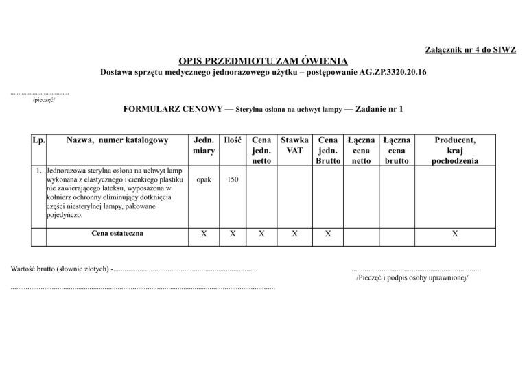 Załącznik nr 4 do SIWZ OPIS PRZEDMIOTU ZAM ÓWIENIA Dostawa sprzętu medycznego jednorazowego użytku – postępowanie AG.ZP.3320.20.16 ..................................... /pieczęć/ FORMULARZ CENOWY –– Sterylna osłona na uchwyt lampy –– Zadanie nr 1 Lp. Nazwa, numer katalogowy 1. Jednorazowa sterylna osłona na uchwyt lamp wykonana z elastycznego i cienkiego plastiku nie zawierającego lateksu, wyposażona w kołnierz ochronny eliminujący dotknięcia części niesterylnej lampy, pakowane pojedyńczo. Cena ostateczna Jedn. miary Ilość opak 150 X X Cena jedn. netto Stawka VAT X X Wartość brutto (słownie złotych) -............................................................................. Cena Łączna Łączna jedn. cena cena Brutto netto brutto X Producent, kraj pochodzenia X ..................................................................... /Pieczęć i podpis osoby uprawnionej/ ............................................................................................................................................. 1 ..................................... /pieczęć/ Formularz cenowy – Strzykawki – Zadanie 2 Lp. Nazwa, numer katalogowy Jedn. miary Ilość Cena Stawka Cena jedn. VAT jedn. netto Brutto Łączna Łączna cena cena netto brutto Producent, Kraj pochodzenia 1. Strzykawka do insuliny 1ml sterylna, jednorazowego użytku, Op. (1op.= 30 szczelna, trzyczęściowa, U-100/1ml przezroczysty cylinder dokładnie 100szt) pokazujący zawartość strzykawki, minimalna pozostałość resztek leku, łatwy i równomierny przesuw tłoka, pierścień zabezpieczający przed wysunięciem tłoka, dokładne, widoczne określenie podawanych dawek, wyraźna trwała skala, złącze Luer, rozmiar igły 0,40-0,450,5G x 13-16mm, pakowane pojedynczo z igłą w zestawie (igła nie może być zamontowana na stałe ze strzykawką). 2. Strzykawki 20ml sterylne, jednorazowego użytku, z gumowym Szt. 1 500 tłokiem, trzyczęściowe, zakończenie typu Luer, nietoksyczne, apirogenne, wykonane z polipropylenu / polietylenu, szczelne, płynny przesuw tłoka, minimalna objętość zalegająca, dobrze czytelna i niezmywalna skala co 1,0ml, zabezpieczenie przed wysunięciem tłoka, pakowane pojedynczo. 3. Strzykawki typu „Żaneta” 50 / 60ml sterylne, jednorazowego użytku, Szt. nietoksyczne, szczelne, apirogenne, zakończenie cylindra cewnikowe, wykonane z polipropylenu, minimalna objętość zalegająca, dobrze czytelna niezmywalna skala, zabezpieczenie przed wysunięciem tłoka, zatyczka do końcówki cylindra. Cena ostateczna X Wartość brutto (słownie złotych) -............................................................................. 2 000 X X X X X ..................................................................... /Pieczęć i podpis osoby uprawnionej/ 2 ..................................... /pieczęć/ Formularz cenowy – Strzykawki do pompy infuzyjnej – Zadanie 3 Lp. Nazwa, numer katalogowy 1. Strzykawki 50 / 60ml sterylne, jednorazowego użytku, trzyczęściowe, zakończenie cylindra typu Luer-Lock – centralnie, wykonane z polipropylenu (cylinder i tłok), przystosowane do pracy z pompą infuzyjną różnego typu, gumowy tłoczek z podwójnym uszczelnieniem, precyzyjne dozowanie małych ilości, minimalna objętość zalegająca, dobrze czytelna niezmywalna skala co 1,0ml, oznaczenie cyfrowe co 10ml, zabezpieczenie przed wysunięciem tłoka, długość kompatybilna z pompami: Braun, Ascor, Aitecs 2016 pakowane pojedynczo. 2. Strzykawki bursztynowe 50 / 60ml sterylne, jednorazowego użytku, trzyczęściowe, zakończenie cylindra typu LuerLock – centralnie, wykonane z polipropylenu (cylinder i tłok), przystosowane do pracy z pompą infuzyjną różnego typu, gumowy tłoczek z podwójnym uszczelnieniem, precyzyjne dozowanie małych ilości, minimalna objętość zalegająca, dobrze czytelna niezmywalna skala co 1,0ml, oznaczenie cyfrowe co 10ml, zabezpieczenie przed wysunięciem tłoka, długość kompatybilna z pompami: Braun, Ascor,Aitecs 2016 pakowane pojedynczo. 3. Cena ostateczna Jedn. miary Ilość Szt. 5 500 Szt. 900 X Cena VAT Cena Łączna Łączna jedn. jedn. cena cena netto brutto netto brutto X Wartość brutto (słownie złotych) -............................................................................. X X X Producent, kraj pochodzenia X ..................................................................... /Pieczęć i podpis osoby uprawnionej/ ............................................................................................................................................. 3 ................................... /pieczęć/ FORMULARZ CENOWY – Igły do biopsji – Zadanie nr 4 Lp. Nazwa, numer katalogowy 1. Igła sterylna, półautomatyczna, jednorazowego użytku, do biopsji tkanek miękkich 16G x 8 - 12cm, pakowane oddzielnie, długość elementu tnącego 20 mm, z podziałką na igle co 1 cm. Cena ostateczna Jedn. miary Ilość Cena Stawka Cena Łączna Łączna jedn. VAT jedn. cena cena netto Brutto netto brutto Szt. X Producent, Kraj pochodzenia 60 X X Wartość brutto (słownie złotych) -...................................................................................... X X X ..... ......................................................... /Pieczęć i podpis osoby uprawnionej/ ............................................................................................................................................. 4 ............................................. Pieczęć FORMULARZ CENOWY – Kaniule dożylne – Zadanie 5 Lp. Nazwa, numer katalogowy 1. Kaniula do żył obwodowych z portem bocznym (zaworem iniekcyjnym) do wstrzyknięć – sterylna, jednorazowego użytku, apirogenna, nietoksyczna, elastyczna, odporna na odkształcenia czy zagięcia – wykonana z poliuretanu, z dodatkowym wygodnym dostępem do portu bocznego łatwo domykającym się koreczkiem portu bocznego, ostro zakończoną igłą, gładka powierzchni