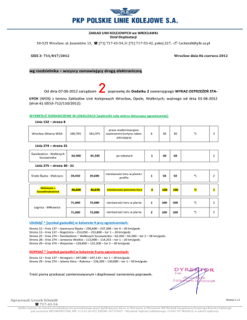 ZAKŁAD LINII KOLEJOWYCH we WROCŁAWIU Dział Eksploatacji 50-525 Wrocław, ul. Joannitów 13,  [71] 717-43-54, [71] 717-53-42, pokój 227,  [email protected] IZES 3- 711/017/2012 Wrocław dnia 06 czerwca 2012 wg rozdzielnika – wszyscy zamawiający drogą elektroniczną Od dnia 07-06-2012 zarządzam 2 poprawkę do Dodatku 2 zawierającego WYKAZ OSTRZEŻEŃ STA- ŁYCH (WOS) z terenu Zakładów Linii Kolejowych Wrocław, Opole, Wałbrzych; ważnego od dnia 01-06-2012 [druk 61 IZES3-712/110/2012]: WYKREŚLIĆ OGRANICZENIE W LOKALIZACJI [wykreślić cały wiersz dotyczący ograniczenia]: Linia 132 – strona 8 Wrocław Główny WGA 180,765 181,075 prace modernizacyjne, zawieszenie kurtyny zabezpieczającej 6 30 30 64,900 65,385 po robotach 1 60 60 *) 2 Linia 274 – strona 25 Świebodzice - Wałbrzych Szczawienko 2 Linia 275 – strona 30 - 31 Środa Śląska - Malczyce 39,450 39,600 nierówności toru w planie i profilu 1 50 50 *) 2 Malczyce – Szczedrzykowice 46,600 46,870 nierówności pionowe toru 2 120 120 *) 2 71,800 72,800 nierówności toru w planie 1 100 100 *) 2 71,800 72,800 nierówności toru w planie 2 100 100 *) 2 Legnica - Miłkowice USUNĄĆ * [symbol gwiazdki] w kolumnie 9 przy ograniczeniach: Strona 12 – linia 137 – Jaworzyna Śląska – 236,600 – 237,200 – tor 6 – 20 km/godz. Strona 13 – linia 137 – Rogoźnica – 253,050 – 253,880 – tor 1 – 20 km/godz. Strona 25 – linia 274 – Świebodzice – Wałbrzych Szczawienko – 62,450 – 64,500 – tor 2 – 30 km/godz. Strona 28 – linia 274 – Janowice Wielkie – 113,900 – 114,255 – tor 1 – 20 km/godz. Strona 29 – linia 274 – Wojanów – 120,850 – 121,200 – tor 2 – 30 km/godz. DOPISAĆ * [symbol gwiazdki] w kolumnie 9 przy ograniczeniach: Strona 12 – linia 137 – Strzegom – 247,080 – 247,110 – tor 1 – 20 km/godz. Strona 29 – linia 274 – Jelenia Góra – Rybnica – 126,200 – 130,000 – tor 1 – 50 km/godz. Treść pisma przekazać zainteresowanym i dopilnować naniesienia poprawek. Opracował: Leszek Schmidt  717-43-54 Strona 1 z 1 Spółka wpisana do rejestru przedsiębiorców prowadzonego przez Sąd Rejonowy dla m. st. Warszawy w Warszawie XIII Wydział Gospodarczy Krajowego Rejestru Sądowego pod numerem KRS 0000037568, NIP: 113-23-16-427, REGON: 017319027 - Wysokość kapitału zakładowego: 13 043 747 000,00 zł, w całości wpłacony