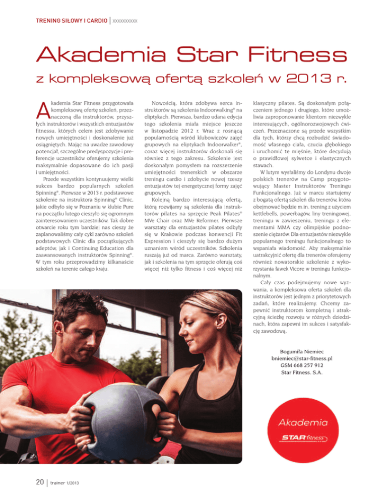 TRENING SIŁOWY I CARDIO | XXXXXXXXXX Akademia Star Fitness z kompleksowà ofertà szkoleƒ w 2013 r. kademia Star Fitness przygotowa∏a kompleksowà ofert´ szkoleƒ, przeznaczonà dla instruktorów, przysz∏ych instruktorów i wszystkich entuzjastów fitnessu, których celem jest zdobywanie nowych umiej´tnoÊci i doskonalenie ju˝ osiàgni´tych. Majàc na uwadze zawodowy potencja∏, szczególne predyspozycje i preferencje uczestników oferujemy szkolenia maksymalnie dopasowane do ich pasji i umiej´tnoÊci. Przede wszystkim kontynuujemy wielki sukces bardzo popularnych szkoleƒ Spinning®. Pierwsze w 2013 r. podstawowe szkolenie na instruktora Spinning® Clinic, jakie odby∏o si´ w Poznaniu w klubie Pure na poczàtku lutego cieszy∏o si´ ogromnym zainteresowaniem uczestników. Tak dobre otwarcie roku tym bardziej nas cieszy ˝e zaplanowaliÊmy ca∏y cykl zarówno szkoleƒ podstawowych Clinic dla poczàtkujàcych adeptów, jak i Continuing Education dla zaawansowanych instruktorów Spinning®. W tym roku przeprowadzimy kilkanaÊcie szkoleƒ na terenie ca∏ego kraju. A NowoÊcià, która zdobywa serca instruktorów sà szkolenia Indoorwalking® na eliptykach. Pierwsza, bardzo udana edycja tego szkolenia mia∏a miejsce jeszcze w listopadzie 2012 r. Wraz z rosnàcà popularnoÊcià wÊród klubowiczów zaj´ç grupowych na eliptykach Indoorwalker®, coraz wi´cej instruktorów doskonali si´ równie˝ z tego zakresu. Szkolenie jest doskona∏ym pomys∏em na rozszerzenie umiej´tnoÊci trenerskich w obszarze treningu cardio i zdobycie nowej rzeszy entuzjastów tej energetycznej formy zaj´ç grupowych. Kolejnà bardzo interesujàcà ofertà, którà rozwijamy sà szkolenia dla instruktorów pilates na sprz´cie Peak Pilates® MVe Chair oraz MVe Reformer. Pierwsze warsztaty dla entuzjastów pilates odby∏y si´ w Krakowie podczas konwencji Fit Expression i cieszy∏y si´ bardzo du˝ym uznaniem wÊród uczestników. Szkolenia ruszajà ju˝ od marca. Zarówno warsztaty, jak i szkolenia na tym sprz´cie oferujà coÊ wi´cej ni˝ tylko fitness i coÊ wi´cej ni˝ klasyczny pilates. Sà doskona∏ym po∏àczeniem jednego i drugiego, które umo˝liwia zaproponowanie klientom niezwykle interesujàcych, ogólnorozwojowych çwiczeƒ. Przeznaczone sà przede wszystkim dla tych, którzy chcà rozbudziç ÊwiadomoÊç w∏asnego cia∏a, czucia g∏´bokiego i uruchomiç te mi´Ênie, które decydujà o prawid∏owej sylwetce i elastycznych stawach. W lutym wys∏aliÊmy do Londynu dwoje polskich trenerów na Camp przygotowujàcy Master Instruktorów Treningu Funkcjonalnego. Ju˝ w marcu startujemy z bogatà ofertà szkoleƒ dla trenerów, która obejmowaç b´dzie m.in. trening z u˝yciem kettlebells, powerbagów, liny treningowej, treningu w zawieszeniu, treningu z elementami MMA czy olimpijskie podnoszenie ci´˝arów. Dla entuzjastów niezwykle popularnego treningu funkcjonalnego to wspania∏a wiadomoÊç. Aby maksymalnie uatrakcyjniç ofert´ dla trenerów oferujemy równie˝ nowatorskie szkolenie z wykorzystania ∏awek Vicore w treningu funkcjonalnym. Ca∏y czas podejmujemy nowe wyzwania, a kompleksowa oferta szkoleƒ dla instruktorów jest jednym z priorytetowych zadaƒ, które realizujemy. Chcemy zapewniç instruktorom kompletnà i atrakcyjnà Êcie˝k´ rozwoju w ró˝nych dziedzinach, która zapewni im sukces i satysfakcj´ zawodowà. Bogumi∏a Niemiec [email protected] GSM 668 257 912 Star Fitness. S.A. 20 | trainer 1/2013