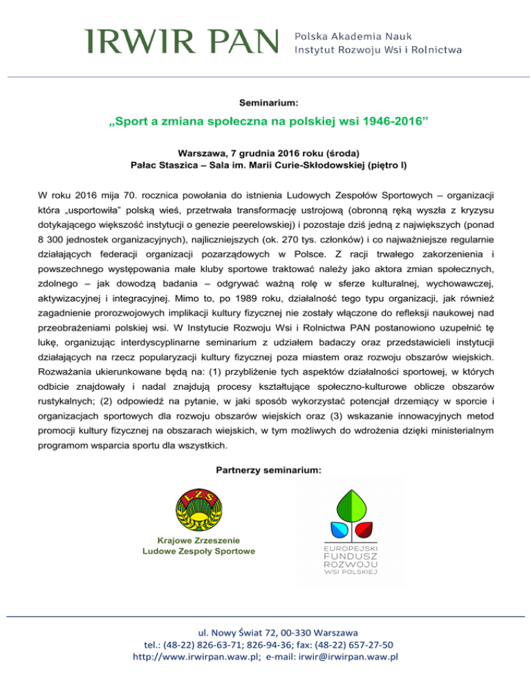 Seminarium: „Sport a zmiana społeczna na polskiej wsi 1946-2016” Warszawa, 7 grudnia 2016 roku (środa) Pałac Staszica – Sala im. Marii Curie-Skłodowskiej (piętro I) W roku 2016 mija 70. rocznica powołania do istnienia Ludowych Zespołów Sportowych – organizacji która „usportowiła” polską wieś, przetrwała transformację ustrojową (obronną ręką wyszła z kryzysu dotykającego większość instytucji o genezie peerelowskiej) i pozostaje dziś jedną z największych (ponad 8 300 jednostek organizacyjnych), najliczniejszych (ok. 270 tys. członków) i co najważniejsze regularnie działających federacji organizacji pozarządowych w Polsce. Z racji trwałego zakorzenienia i powszechnego występowania małe kluby sportowe traktować należy jako aktora zmian społecznych, zdolnego – jak dowodzą badania – odgrywać ważną rolę w sferze kulturalnej, wychowawczej, aktywizacyjnej i integracyjnej. Mimo to, po 1989 roku, działalność tego typu organizacji, jak również zagadnienie prorozwojowych implikacji kultury fizycznej nie zostały włączone do refleksji naukowej nad przeobrażeniami polskiej wsi. W Instytucie Rozwoju Wsi i Rolnictwa PAN postanowiono uzupełnić tę lukę, organizując interdyscyplinarne seminarium z udziałem badaczy oraz przedstawicieli instytucji działających na rzecz popularyzacji kultury fizycznej poza miastem oraz rozwoju obszarów wiejskich. Rozważania ukierunkowane będą na: (1) przybliżenie tych aspektów działalności sportowej, w których odbicie znajdowały i nadal znajdują procesy kształtujące społeczno-kulturowe oblicze obszarów rustykalnych; (2) odpowiedź na pytanie, w jaki sposób wykorzystać potencjał drzemiący w sporcie i organizacjach sportowych dla rozwoju obszarów wiejskich oraz (3) wskazanie innowacyjnych metod promocji kultury fizycznej na obszarach wiejskich, w tym możliwych do wdrożenia dzięki ministerialnym programom wsparcia sportu dla wszystkich. Partnerzy seminarium: Krajowe Zrzeszenie Ludowe Zespoły Sportowe ul. Nowy Świat 72, 00-330 Warszawa tel.: (48-22) 826-63-71; 826-94-36; fax: (48-22) 657-27-50 http://www.irwirpan.waw.pl; e-mail: [email protected] P R OGR AM 11:00 – 11:10 Otwarcie seminarium (dr hab. Monika Stanny – dyrektor IRWiR PAN, dr Władysław Kosiniak-Kamysz – przewodniczący KZ LZS, Krzysztof Podhajski – prezes EFRWP) 11:30 – 11:50 dr Rafał Szubert , Akademia Wychowania Fizycznego we Wrocławiu Determinanty trwałego zakorzenienia organizacji sportowych na polskiej wsi 11:10 – 11:30 dr hab. prof. AJD Eligiusz Małolepszy, Akademia im. Jana Długosza w Częstochowie LZS w czasach transformacji – jak przezwyciężono kryzys lat 90? 11:50 – 12:10 Marek Mazur, Krajowe Zrzeszenie Ludowe Zespoły Sportowe Ogólnopolskie inicjatywy, stan obecny i problemy w bieżącej działalności Zrzeszenia LZS 12:10 – 12:30 Agnieszka Żeglińska, Fundacja Europejski Fundusz Rozwoju Wsi Polskiej Program „Leśna Akademia Sportu” jako przykład innowacyjnej metody promocji kultury fizycznej z udziałem szkół wiejskich 12:30 – 12:50 dr Konrad Burdyka, Instytut Rozwoju Wsi i Rolnictwa PAN Prorozwojowe strategie działania wiejskich klubów sportowych a przeobrażenia polskiej wsi 12:50 – 13:20 13:30 Dyskusja i podsumowanie seminarium Lunch