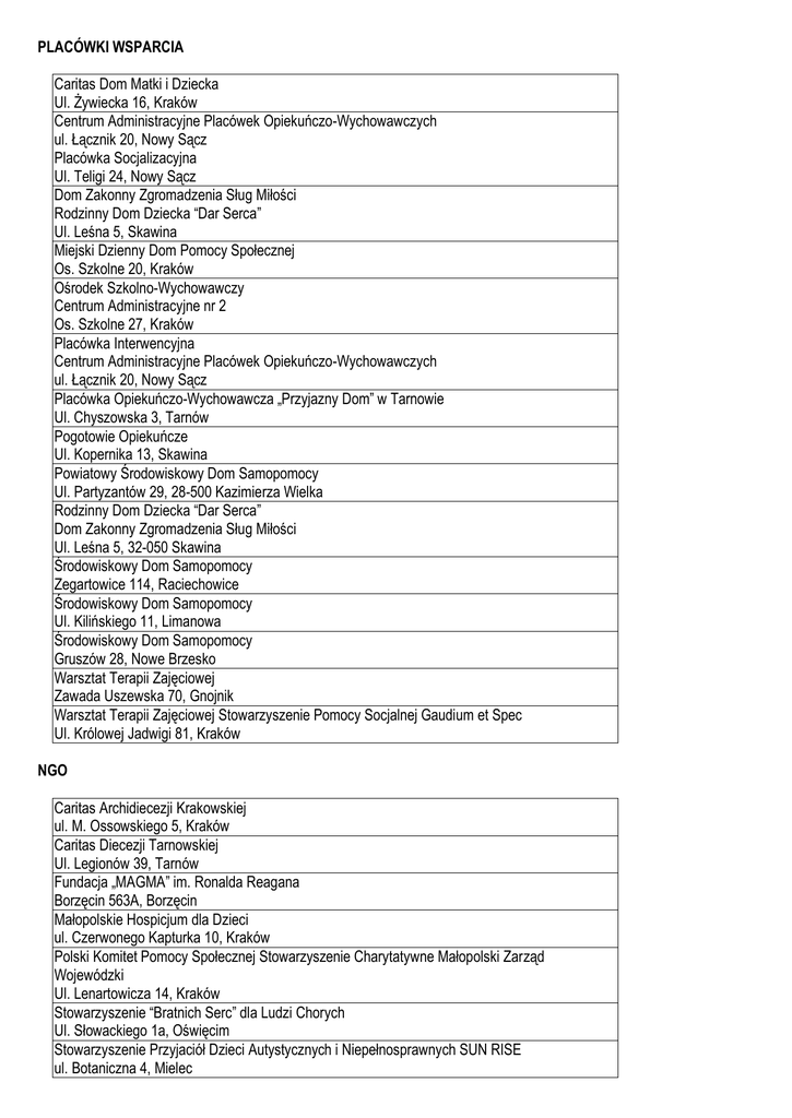 PLACÓWKI WSPARCIA Caritas Dom Matki i Dziecka Ul. Żywiecka 16, Kraków Centrum Administracyjne Placówek Opiekuńczo-Wychowawczych ul. Łącznik 20, Nowy Sącz Placówka Socjalizacyjna Ul. Teligi 24, Nowy Sącz Dom Zakonny Zgromadzenia Sług Miłości Rodzinny Dom Dziecka “Dar Serca” Ul. Leśna 5, Skawina Miejski Dzienny Dom Pomocy Społecznej Os. Szkolne 20, Kraków Ośrodek Szkolno-Wychowawczy Centrum Administracyjne nr 2 Os. Szkolne 27, Kraków Placówka Interwencyjna Centrum Administracyjne Placówek Opiekuńczo-Wychowawczych ul. Łącznik 20, Nowy Sącz Placówka Opiekuńczo-Wychowawcza „Przyjazny Dom” w Tarnowie Ul. Chyszowska 3, Tarnów Pogotowie Opiekuńcze Ul. Kopernika 13, Skawina Powiatowy Środowiskowy Dom Samopomocy Ul. Partyzantów 29, 28-500 Kazimierza Wielka Rodzinny Dom Dziecka “Dar Serca” Dom Zakonny Zgromadzenia Sług Miłości Ul. Leśna 5, 32-050 Skawina Środowiskowy Dom Samopomocy Zegartowice 114, Raciechowice Środowiskowy Dom Samopomocy Ul. Kilińskiego 11, Limanowa Środowiskowy Dom Samopomocy Gruszów 28, Nowe Brzesko Warsztat Terapii Zajęciowej Zawada Uszewska 70, Gnojnik Warsztat Terapii Zajęciowej Stowarzyszenie Pomocy Socjalnej Gaudium et Spec Ul. Królowej Jadwigi 81, Kraków NGO Caritas Archidiecezji Krakowskiej ul. M. Ossowskiego 5, Kraków Caritas Diecezji Tarnowskiej Ul. Legionów 39, Tarnów Fundacja „MAGMA” im. Ronalda Reagana Borzęcin 563A, Borzęcin Małopolskie Hospicjum dla Dzieci ul. Czerwonego Kapturka 10, Kraków Polski Komitet Pomocy Społecznej Stowarzyszenie Charytatywne Małopolski Zarząd Wojewódzki Ul. Lenartowicza 14, Kraków Stowarzyszenie “Bratnich Serc” dla Ludzi Chorych Ul. Słowackiego 1a, Oświęcim Stowarzyszenie Przyjaciół Dzieci Autystycznych i Niepełnosprawnych SUN RISE ul. Botaniczna 4, Mielec Towarzystwo Przyjaciół Chorych „Hospicjum im. św. Łazarza” Ul. Fatimska 17, Kraków Zespół Placówek Caritas Ul. 3-go Maja 2, 32-100 Proszowice OPSy, PCPRy, ROPSy Gminny Ośrodek Pomocy Społecznej Radziemice, 32-107 Radziemice Gminny Ośrodek Pomocy Społecznej Rzepiennik Strzyżewski, Rzepiennik Strzyżewski Gminny Ośrodek Pomocy Społecznej Ul. Cmentarna 2, Zabierzów Gminny Ośrodek Pomocy Społecznej Ul. Jakubowskiego 33, Grybów Gminny Ośrodek Pomocy Społecznej Raciechowice, Raciechowice Gminny Ośrodek Pomocy Społecznej Łużna Gminny Ośrodek Pomocy Społecznej Ul. Ogrodowa 4, Grybów Gminny Ośrodek Pomocy Społecznej Ul. Jacka Malczewskiego 15, Zakliczyn Gminny Ośrodek Pomocy Społecznej Os. Dłubacze 160, Ochotnica Dolna Gminny Ośrodek Pomocy Społecznej Ul. E. Łokietkówny 14, Koszyce Gminny Ośrodek Pomocy Społecznej Kłaj 652, Kłaj Gminny Ośrodek Pomocy Społecznej ul. ks. Blajera 20, Frysztak Gminny Ośrodek Pomocy Społecznej Ul. Zakopiańska 18, Szaflary Gminny Ośrodek Pomocy Społecznej Ul. Łukasiewicza 6, Gorlice Gminny Ośrodek Pomocy Społecznej Rynek 4, Wojnicz Gminny Ośrodek Pomocy Społecznej Siennica Różana 265A, Siennica Różana Gminny Ośrodek Pomocy Społecznej Ul. Zakopiańska 18, Szaflary Gminny Ośrodek Pomocy Społecznej Ul. Marcinkowica 6, Chełmiec Miejski Ośrodek Pomocy Społecznej Ul. Józefińska 14, Kraków Miejski Ośrodek Pomocy Społecznej ul. Sobieskiego 15B, Oświęcim Miejski Ośrodek Pomocy Społecznej ul. Żywiecka 13, Nowy Sącz Miejski Ośrodek Pomocy Społecznej Ul. Sobieskiego 15 B, Oświęcim Miejski Ośrodek Pomocy Społecznej Ul. J. Malczewskiego 15, Zakliczyn Miejski Ośrodek Pomocy Społecznej ul. Józefińska 14, Kraków Filia nr 6, os. Dietla 64, Kraków Miejski Ośrodek Pomocy Społecznej ul. Józefińska 14, Kraków Flia nr 4, os. Szkolne 34, Kraków Miejski Ośrodek Pomocy Społecznej Ul. Mickiewicza 21, Brzesko Miejski Ośrodek Pomocy Społecznej ul. Żywiecka 13, Nowy Sącz Miejski Ośrodek Pomocy Społecznej ul. Józefińska 14, Kraków Miejski Ośrodek Pomocy Społecznej Ul. Skalska 20, Wolbrom Miejski Ośrodek Pomocy Społecznej Ul. Sobieskiego 15 B, Oświęcim Miejsko-Gminny Ośrodek Pomocy Społecznej Ul. 3-go maja 72, Proszowice Miejsko-Gminny Ośrodek Pomocy Społecznej Ul. Przemysłowa 2, Szczekociny Miejsko-Gminny Ośrodek Pomocy Społecznej ul. Sienkiewicza 26, Wieliczka Miejsko-Gminny Ośrodek Pomocy Społecznej ul. Brzeska 9, 33-130 Radłów Miejsko-Gminny Ośrodek Pomocy Społecznej Rynek 26, Dobczyce Miejsko-Gminny Ośrodek Pomocy Społecznej Ul. M. N. Mysłowskiego 7, Brzostek Ośrodek Pomocy Społecznej Ul. Parkowa 2, Rabka-Zdrój Ośrodek Pomocy Społecznej Ul. Żermoskiego 50, Zawichost Ośrodek Pomocy Społecznej Ul. Piłsudskiego 119, Muszyna Ośrodek Pomocy Społecznej ul. S. Batorego 15, Stary Sącz Ośrodek Pomocy Społecznej Ul. Piłsudskiego 15, Poronin Powiatowe Centrum Pomocy Rodzinie ul. Żeromskiego 34, 39-300 Mielec Powiatowe Centrum Pomocy Rodzinie Ul. Berka Joselewicza 5, Dąbrowa Tarnowska Powiatowe Centrum Pomocy Rodzinie Ul. Piastowska 2B, Brzesko Powiatowe Centrum Pomocy Rodzinie Ul. Sienkiewicza 18, Miechów DPSy Dom Pogodnej Jesieni Ul. Grabina 11, Zakliczyn Dom Pomocy Społecznej ul. Łanowa 39, Kraków Dom Pomocy Społecznej Czerna 110, Krzeszowice Dom Pomocy Społecznej ul. W. Witosa 24/26, Nowy Sącz Dom Pomocy Społecznej ul. Parkowa 4, 34-700 Rabka Zdrój Dom Pomocy Społecznej Ul. Kluzeka 6, Kraków Dom Pomocy Społecznej Batowice 1, Węgrzce Dom Pomocy Społecznej Stróże 1, Zakliczyn Dom Pomocy Społecznej ul. Krakowska 55, Kraków Dom Pomocy Społecznej ul. Żeromskiego 17, Maków Podhalański Dom Pomocy Społecznej Batowice 1, Węgrzce Dom Pomocy Społecznej Staniątki 287, Niepołomice Dom Pomocy Społecznej Grabie 28, Węgrzce Wielkie Dom Pomocy Społecznej Czerna 110, Krzeszowice Dom Pomocy Społecznej ul. Grabowiecka 7, Ostrowiec Świętokrzyski Dom Pomocy Społecznej ul. Emilii Plater 20, Nowy Sącz Dom Pomocy Społecznej Radwanowie 1, Radwanowice Dom Pomocy Społecznej ul. Śliżowy Potok 8, Żywiec Dom Pomocy Społecznej ul. Żwirki i Wigury 4a, Krosno Dom Pomocy S