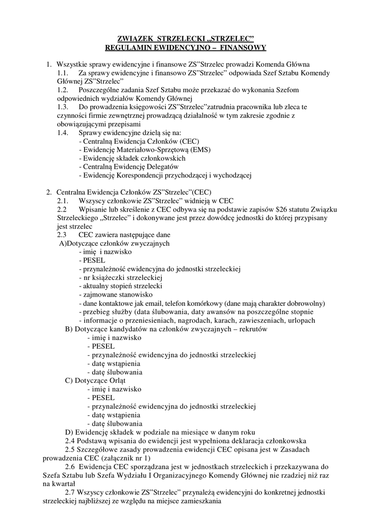 ZWIĄZEK STRZELECKI „STRZELEC” REGULAMIN EWIDENCYJNO – FINANSOWY 1. Wszystkie sprawy ewidencyjne i finansowe ZS”Strzelec prowadzi Komenda Główna 1.1. Za sprawy ewidencyjne i finansowo ZS”Strzelec” odpowiada Szef Sztabu Komendy Głównej ZS”Strzelec” 1.2. Poszczególne zadania Szef Sztabu może przekazać do wykonania Szefom odpowiednich wydziałów Komendy Głównej 1.3. Do prowadzenia księgowości ZS”Strzelec”zatrudnia pracownika lub zleca te czynności firmie zewnętrznej prowadzącą działalność w tym zakresie zgodnie z obowiązującymi przepisami 1.4. Sprawy ewidencyjne dzielą się na: - Centralną Ewidencja Członków (CEC) - Ewidencję Materiałowo-Sprzętową (EMS) - Ewidencję składek członkowskich - Centralną Ewidencję Delegatów - Ewidencję Korespondencji przychodzącej i wychodzącej 2. Centralna Ewidencja Członków ZS”Strzelec”(CEC) 2.1. Wszyscy członkowie ZS”Strzelec” widnieją w CEC 2.2 Wpisanie lub skreślenie z CEC odbywa się na podstawie zapisów $26 statutu Związku Strzeleckiego „Strzelec” i dokonywane jest przez dowódcę jednostki do której przypisany jest strzelec 2.3 CEC zawiera następujące dane A)Dotyczące członków zwyczajnych - imię i nazwisko - PESEL - przynależność ewidencyjna do jednostki strzeleckiej - nr książeczki strzeleckiej - aktualny stopień strzelecki - zajmowane stanowisko - dane kontaktowe jak email, telefon komórkowy (dane mają charakter dobrowolny) - przebieg służby (data ślubowania, daty awansów na poszczególne stopnie - informacje o przeniesieniach, nagrodach, karach, zawieszeniach, urlopach B) Dotyczące kandydatów na członków zwyczajnych – rekrutów - imię i nazwisko - PESEL - przynależność ewidencyjna do jednostki strzeleckiej - datę wstąpienia - datę ślubowania C) Dotyczące Orląt - imię i nazwisko - PESEL - przynależność ewidencyjna do jednostki strzeleckiej - datę wstąpienia - datę ślubowania D) Ewidencję składek w podziale na miesiące w danym roku 2.4 Podstawą wpisania do ewidencji jest wypełniona deklaracja członkowska 2.5 Szczegółowe zasady prowadzenia ewidencji CEC opisana jest w Zasadach prowadzenia CEC (załącznik nr 1) 2.6 Ewidencja CEC sporządzana jest w jednostkach strzeleckich i przekazywana do Szefa Sztabu lub Szefa Wydziału I Organizacyjnego Komendy Głównej nie rzadziej niż raz na kwartał 2.7 Wszyscy członkowie ZS”Strzelec” przynależą ewidencyjni do konkretnej jednostki strzeleckiej najbliższej ze względu na miejsce zamieszkania 3. Centralna Ewidencja Delegatów Walnego Zgromadzenia ZS”Strzelec” (CED) prowadzona jest na potrzeby Walnego Zebrania Delegatów 3.1. Wszyscy Delegaci ZS”Strzelec” wpisywani są do CED 3.2. Wpisanie od CED odbywa się na podstawie Karty Delegata 3.3. Ewidencja obowiązuje przez kadencję władz 3.4 Skreślenie z ewidencji następuje tylko w przypadku utraty członkostwa zgodnie z &26 Statutu lub rezygnacji z pełnionej funkcji złożonej Komendantowi Głównemu 3.4. CED zawiera następujące dane: - imię i nazwisko - stopień - PESEL - przynależność ewidencyjna do jednostki strzeleckiej 4. Komenda Główna odpowiada za zarządzanie mieniem strzeleckim 4.1. Komenda Główna prowadzi centralną ewidencję mienia strzeleckiego 4.2. Mienie strzeleckie stanowią wszystkie przedmioty materialne pozyskane na działalność Związku Strzeleckiego „Strzelec” przez jednostki strzeleckie i w nich jest ewidencjonowana w postaci Ewidencji Materiałowo Sprzętowej 4.3. Mienie strzeleckie jest własnością ZS”Strzelec” i podlega zarządzaniu i kontroli Komendy Głównej oraz Komend okręgowych i Obszarowych 4.4 Komenda Główna przekazuje mienie strzeleckie w użytkowanie jednostką strzeleckim, komendom obwodów, komendom okręgów. 4.5 Za stan techniczny i ilościowy odpowiada dowódca jednostki będący w użytkowaniu mienia, bądź osoba przez niego wyznaczona. 4.6 Komendanci jednostek strzeleckich, obwodów i okręgów prowadzą ewidencję oddanego w użytkowanie mienia strzeleckiego w formie Ewidencji Materiałowo Sprzętowej. 4.5 Nie rzadziej niż raz w roku przeprowadzana jest inwentaryzacja na zasadach ogólnych wynikających z przepisów Przed inwentaryzacją całe mienie strzeleckie powinno znajdować się w magazynie 4.6 Szczegółowe zasady prowadzenie Ewidencji Materiałowej opisane są w Zasadach Gospodarki Materiałowej (Załącznik nr 3) 5. O g ó l n e Z a s a d y p r o w a d z e n i a k s i ę g o w o ś c i 5..1 Wszyscy członkowie ZS”Strzelec” opłacają składki członkowskie 5.2 Składka członkowska składa się z dwóch składowych 1) zasadniczej odprowadzanej na potrzeby Komendy Głównej. Składka obowiązująca 2)dodatkowej na potrzeby jednostki Składka dobrowolna 5.3 Wysokość składki zasadniczej określa Naczelna Rada Strzelecka na rok kalendarzowy.. Wpływy ze składki ewidencyjnej przeznaczone są na podstawową obsługę Komendy Głównej, odpraw Naczelnej Rady Strzeleckiej i zebrań Walnego Zgromadzenia Delegatów/Członków. Składka ta może być przeznaczona na rozwój ZS ”Strzelec” a w szczególności organizację centralnych przedsięwzięć szkoleniowych i zabezpieczenie materiałowe do ich realizacji Zwolnienie z tej składki może nastąpić tylko i wyłącznie na podstawie decyzji Naczelnej Rady Strzeleckiej i jest rozpatrywana indywidualnie w zależności od sytuacji materialnej danego strzelca 5.4 Maksymalną wysokość składki dodatkowej określa Naczelna Rada Strzelecka, a jej rzeczywistą wysokość – dowódca jednostki strzeleckiej. Składka dodatkowa przeznaczona jest na zabezpieczenie potrzeb jednostki strzeleckiej 6. Wszystkie środki finansowe przechowywane są na rachunku bankowym. 7. Zdarzenia finansowe dotyczące obrotów gotówkowych rejestrowane są w postaci raportów kasowych 8. Szczegółowe zasady ewidencji księgowej opisane są w Zasadach Ewidencji Księgowej obowiązujących w Związku Strzeleckim „Strzelec
