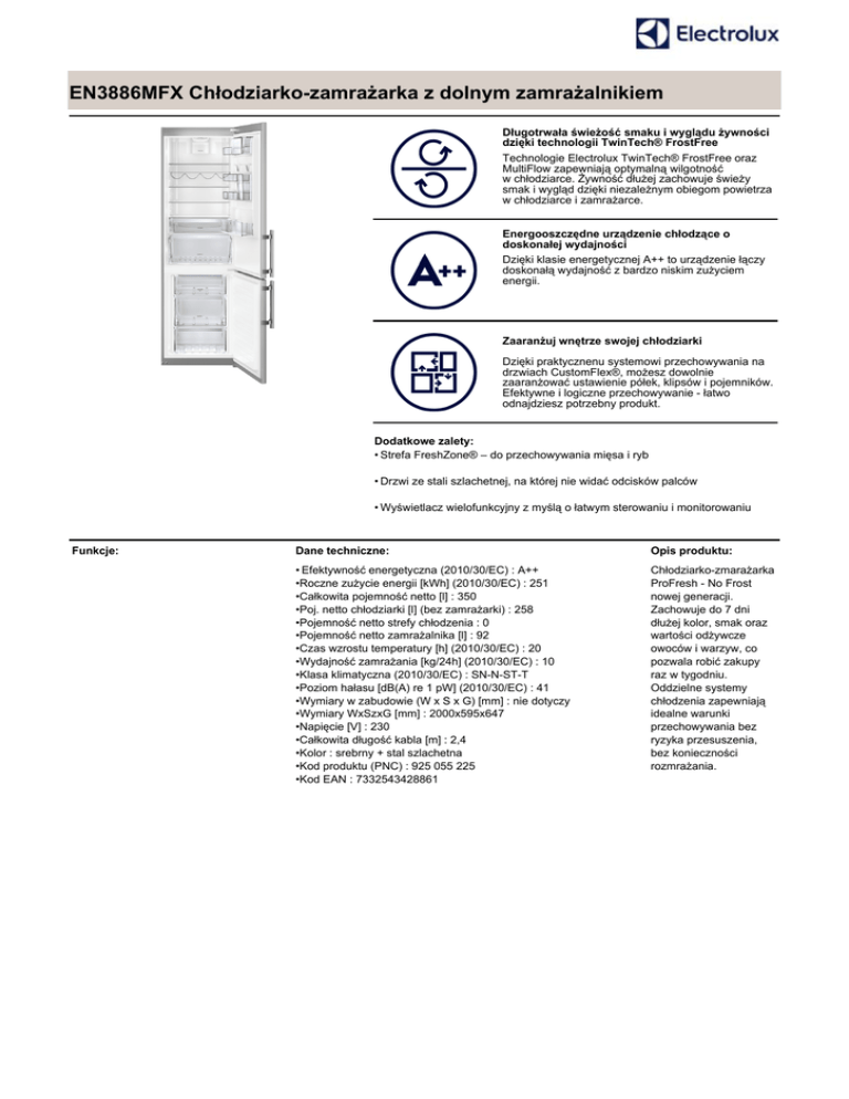 EN3886MFX Chłodziarko-zamrażarka z dolnym zamrażalnikiem Długotrwała świeżość smaku i wyglądu żywności dzięki technologii TwinTech® FrostFree Technologie Electrolux TwinTech® FrostFree oraz MultiFlow zapewniają optymalną wilgotność w chłodziarce. Żywność dłużej zachowuje świeży smak i wygląd dzięki niezależnym obiegom powietrza w chłodziarce i zamrażarce. Energooszczędne urządzenie chłodzące o doskonałej wydajności Dzięki klasie energetycznej A++ to urządzenie łączy doskonałą wydajność z bardzo niskim zużyciem energii. Zaaranżuj wnętrze swojej chłodziarki Dzięki praktycznenu systemowi przechowywania na drzwiach CustomFlex®, możesz dowolnie zaaranżować ustawienie półek, klipsów i pojemników. Efektywne i logiczne przechowywanie - łatwo odnajdziesz potrzebny produkt. Dodatkowe zalety: • Strefa FreshZone® – do przechowywania mięsa i ryb • Drzwi ze stali szlachetnej, na której nie widać odcisków palców • Wyświetlacz wielofunkcyjny z myślą o łatwym sterowaniu i monitorowaniu Funkcje: Dane techniczne: Opis produktu: • Efektywność energetyczna (2010/30/EC) : A++ •Roczne zużycie energii [kWh] (2010/30/EC) : 251 •Całkowita pojemność netto [l] : 350 •Poj. netto chłodziarki [l] (bez zamrażarki) : 258 •Pojemność netto strefy chłodzenia : 0 •Pojemność netto zamrażalnika [l] : 92 •Czas wzrostu temperatury [h] (2010/30/EC) : 20 •Wydajność zamrażania [kg/24h] (2010/30/EC) : 10 •Klasa klimatyczna (2010/30/EC) : SN-N-ST-T •Poziom hałasu [dB(A) re 1 pW] (2010/30/EC) : 41 •Wymiary w zabudowie (W x S x G) [mm] : nie dotyczy •Wymiary WxSzxG [mm] : 2000x595x647 •Napięcie [V] : 230 •Całkowita długość kabla [m] : 2,4 •Kolor : srebrny + stal szlachetna •Kod produktu (PNC) : 925 055 225 •Kod EAN : 7332543428861 Chłodziarko-zmarażarka ProFresh - No Frost nowej generacji. Zachowuje do 7 dni dłużej kolor, smak oraz wartości odżywcze owoców i warzyw, co pozwala robić zakupy raz w tygodniu. Oddzielne systemy chłodzenia zapewniają idealne warunki przechowywania bez ryzyka przesuszenia, bez konieczności rozmrażania. EN3886MFX Chłodziarko-zamrażarka z dolnym zamrażalnikiem