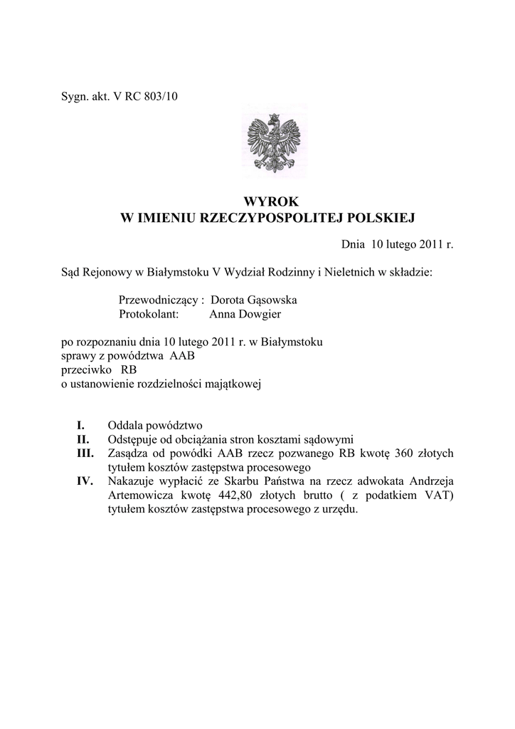 V RC 803/10 - Sąd Rejonowy w Białymstoku