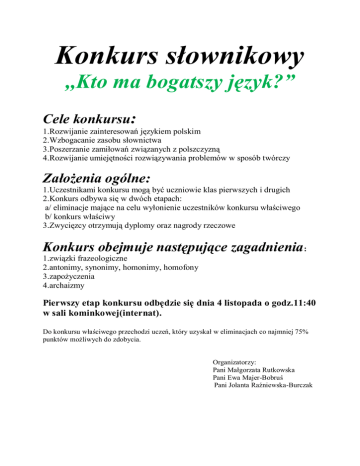 Konkurs słownikowy ,,Kto ma bogatszy język?” Cele konkursu: 1.Rozwijanie zainteresowań językiem polskim 2.Wzbogacanie zasobu słownictwa 3.Poszerzanie zamiłowań związanych z polszczyzną 4.Rozwijanie umiejętności rozwiązywania problemów w sposób twórczy Założenia ogólne: 1.Uczestnikami konkursu mogą być uczniowie klas pierwszych i drugich 2.Konkurs odbywa się w dwóch etapach: a/ eliminacje mające na celu wyłonienie uczestników konkursu właściwego b/ konkurs właściwy 3.Zwycięzcy otrzymują dyplomy oraz nagrody rzeczowe Konkurs obejmuje następujące zagadnienia : 1.związki frazeologiczne 2.antonimy, synonimy, homonimy, homofony 3.zapożyczenia 4.archaizmy Pierwszy etap konkursu odbędzie się dnia 4 listopada o godz.11:40 w sali kominkowej(internat). Do konkursu właściwego przechodzi uczeń, który uzyskał w eliminacjach co najmniej 75% punktów możliwych do zdobycia. Organizatorzy: Pani Małgorzata Rutkowska Pani Ewa Majer-Bobruś Pani Jolanta Raźniewska-Burczak