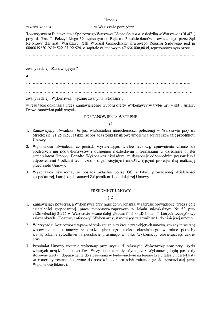 Umowa zawarta w dniu …………………………. w Warszawie pomiędzy: Towarzystwem Budownictwa Społecznego Warszawa Północ Sp. z o.o. z siedzibą w Warszawie (01-471) przy ul. Gen. T. Pełczyńskiego 30, wpisanym do Rejestru Przedsiębiorców prowadzonego przez Sąd Rejonowy dla m.st. Warszawy, XIII Wydział Gospodarczy Krajowego Rejestru Sądowego pod nr 0000019230, NIP: 522-25-92-920, o kapitale zakładowym 67 666 000,00 zl, reprezentowanym przez : …………………………………………………………………………………………………………….. zwanym dalej „Zamawiającym” a …………………………………………………………………………………………………………… …………………………………………………………………………………………………………… …………………………………………………………………………………..……………………….. zwanym dalej „Wykonawcą”, łącznie zwanymi „Stronami”, w rezultacie dokonania przez Zamawiającego wyboru oferty Wykonawcy w trybie art. 4 pkt 8 ustawy Prawo zamówień publicznych. POSTANOWIENIA WSTĘPNE §1 1. Zamawiający oświadcza, że jest właścicielem nieruchomości położonej w Warszawie przy ul. Strzeleckiej 21/25 m.53, a także, że posiada środki finansowe umożliwiające realizowanie przedmiotu Umowy. 2. Wykonawca oświadcza, że posiada wystarczającą wiedzę fachową, uprawnienia własne lub podległych mu podwykonawców i dysponuje niezbędnymi informacjami w dziedzinie objętej przedmiotem Umowy. Ponadto Wykonawca oświadcza, że dysponuje odpowiednim personelem i odpowiednimi środkami techniczno - organizacyjnymi umożliwiającymi profesjonalną realizację przedmiotu Umowy. 3. Wykonawca oświadcza, że posiada aktualną polisę OC z tytułu prowadzonej działalności gospodarczej, której kopia stanowi Załącznik nr 1 do niniejszej Umowy. PRZEDMIOT UMOWY §2 1. Zamawiający powierza, a Wykonawca przyjmuje do wykonania, w zakresie prowadzonej przez siebie działalności gospodarczej, prace remontowo-naprawcze w lokalu mieszkalnym Nr 53 przy ul.Strzeleckiej 21/25 w Warszawie zwane dalej „Pracami” albo „Robotami”, których szczegółowy zakres określa „Kosztorys ofertowy” Wykonawcy, stanowiący załącznik nr 1 do niniejszej umowy. 2. W przypadku konieczności wprowadzenia zmian w zakresie prac objętych umową, zmiany te zostaną wprowadzone do umowy w drodze pisemnego aneksu określającego w miarę potrzeby wynagrodzenie ryczałtowe na podstawie pisemnego wniosku Wykonawcy, zawierającego zakres prac. 3. Przedmiot Umowy zostanie wykonany przy użyciu sil własnych Wykonawcy oraz przy użyciu własnych urządzeń i materiałów. Wszystkie materiały użyte przez Wykonawcę będą posiadały stosowne atesty i dopuszczenia do stosowania w budownictwie na terenie kraju (atesty i certyfikaty za materiały zostaną dołączone do protokołu odbioru robót załączonego do wystawionej przez Wykonawcę faktury). TERMIN REALIZACJI UMOWY §3 1. Prace wskazane w § 2 ust.1 zostaną wykonane w ciągu 15 dni roboczych od dnia zawarcia umowy, a termin rozpoczęcia prac to .........., termin zakończenia to……………………. 2. Za termin zakończenia prac, o którym mowa w ust. 1, uznaje się zakończenie wszelkich robót oraz wykonanie wszelkich wynikających z nich poprawek i zaleceń, jak również całkowite uprzątniecie terenu, na którym wykonywane były roboty wraz z wywiezieniem resztek materiałów. 3. Zamawiający powinien być niezwłocznie pisemnie poinformowany o przeszkodach mogących mieć wpływ na opóźnienie terminu wykonania robót. Ustalenie nowego terminu wykonania robót wymaga sporządzenia stosownego aneksu do Umowy. 4. W przypadku rozszerzenia zakresu robót termin określony w ust. 1 może ulec odpowiedniemu wydłużeniu. Zmiana zakresu robót oraz związana z tym zmiana terminu ich zakończenia wymaga aneksu do Umowy. OBOWIĄZKI ZAMAWIAJĄCEGO §4 1. Zamawiający zobowiązuje się: a) wprowadzić Wykonawcę na miejsce wykonania Umowy; wprowadzenie nastąpi na podstawie protokołu; b) odebrać protokolarnie wykonane prace w terminie 3 dni od daty pisemnego zgłoszenia wykonania robót przez Wykonawcę. c) uczestniczyć w odbiorach częściowych przy wystąpieniu robót zanikowych w celu wyrażenia zgody na kontynuację prac. OBOWIĄZKI WYKONAWCY §5 1. Wykonawca zobowiązany jest do: a) protokolarnego przejęcia miejsca wykonania Umowy; b) wykonania Umowy z zachowaniem najwyższej staranności i zgodnie z obowiązującymi normami, sztuką budowlaną oraz zasadami bezpieczeństwa i higieny pracy oraz przepisami przeciwpożarowymi; c) bieżącej kontroli jakości wykonanych robót; d) przedstawienia na żądanie Zamawiającego niezbędnych informacji dotyczących realizacji robót i technologii wykonawstwa; e) natychmiastowego powiadomienia Zamawiającego zagrożeniach w miejscu wykonania Umowy; f) całkowitego nadzoru osoby z odpowiednimi uprawnieniami nad pracownikami Wykonawcy, na terenie realizacji przedmiotu Umowy; g) dbania o porządek na terenie prowadzenia robót i zapleczu socjalnym; h) zapewnienia pracownikom odpowiedniego sprzętu i narzędzi pozwalających zrealizować przedmiot Umowy; i) ochrony przed zniszczeniem, uszkodzeniem lub kradzieżą powierzonego mienia oraz prowadzonych przez robót aż do czasu odbioru robót przez Zamawiającego; j) usunięcia na swój koszt z terenu, na którym będą wykonywane prace, wszelkich materiałów zgromadzonych w związku z wykonaniem Umowy i prowadzeniem prac rozbiórkowych; k) protokolarnego przekazania przedmiotu umowy Zamawiającemu; o nieszczęśliwych wypadkach lub ODBIÓR PRZEDMIOTU UMOWY §6 1. Wykonawca pisemnie powiadomi Zamawiającego o gotowości odbioru wykonywanych prac, przynajmniej na 7 dni przed planowanym terminem odbioru. 2. Zamawiający dokona odbioru końcowego całośc