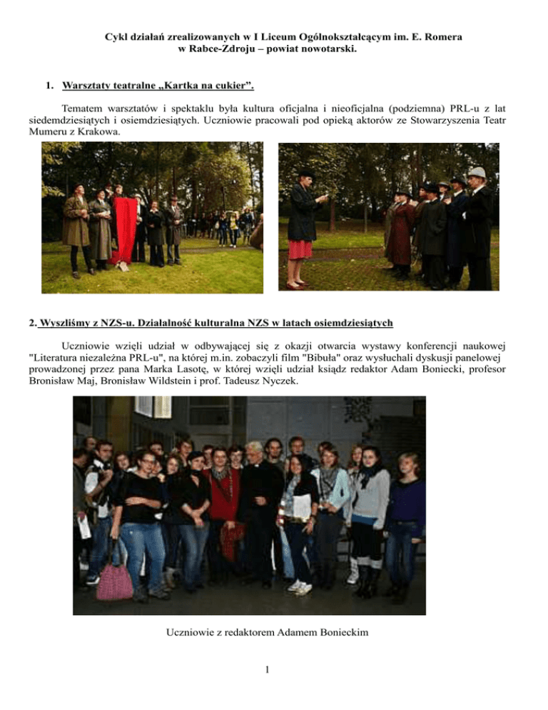 Cykl działań zrealizowanych w I Liceum Ogólnokształcącym im. E. Romera w Rabce-Zdroju – powiat nowotarski. 1. Warsztaty teatralne „Kartka na cukier”. Tematem warsztatów i spektaklu była kultura oficjalna i nieoficjalna (podziemna) PRL-u z lat siedemdziesiątych i osiemdziesiątych. Uczniowie pracowali pod opieką aktorów ze Stowarzyszenia Teatr Mumeru z Krakowa. 2. Wyszliśmy z NZS-u. Działalność kulturalna NZS w latach osiemdziesiątych Uczniowie wzięli udział w odbywającej się z okazji otwarcia wystawy konferencji naukowej "Literatura niezaleŜna PRL-u", na której m.in. zobaczyli film "Bibuła" oraz wysłuchali dyskusji panelowej prowadzonej przez pana Marka Lasotę, w której wzięli udział ksiądz redaktor Adam Boniecki, profesor Bronisław Maj, Bronisław Wildstein i prof. Tadeusz Nyczek. Uczniowie z redaktorem Adamem Bonieckim 1 3. Spotkanie z Prezesem IPN, dr hab. Januszem Kurtyką. Kolejnym, waŜnym działaniem podjętym przez nasze Liceum było spotkanie z Prezesem IPN, dr hab. Januszem Kurtyką oraz Panem Adamem Kalitą z krakowskiego oddziału IPN. Prezes IPN - Pan Janusz Kurtyka z młodzieŜą i Dyrektorem Liceum. 4. "Ulica zapomnianej kolędy" 22 grudnia w sali Teatru Rabcio młodzieŜ przedstawiła świąteczny spektakl przygotowany pod opieką naszej młodej polonistki Anny Grzybacz - "Ulica zapomnianej kolędy". Spektakl składał się z kilku scen wigilii polskich obchodzonych podczas hitlerowskich okupacji (z silnie wyeksponowanym motywem ukrywających się śydów), tuŜ powojennych, czasu festiwalu solidarności, stanu wojennego i odzyskanej wolność. Uczniowie podczas przedstawienia. 2 5. Okruchy pamięci, ziarenka prawdy... Pod tym tytułem kryje się wystawa oraz koncert zorganizowany przez naszą szkołę wraz z krakowskim oddziałem IPN i Stowarzyszenia NZS 80. Wystawa poświęcona była księdzu Władysławowi Gurgaczowi - jednemu z tysięcy Polaków zamordowanych po roku 1945. MłodzieŜ liceum podczas wystawy. Koncert Andrzeja Kołakowskiego – działacza opozycyjnego, barda. Poety, pedagoga 6. Reduta Wolności – Zlot Edukacyjno – patriotyczno – historyczny. Głównym celem zlotu była rekonstrukcja historyczna, w której pokazano burzliwe dzieje schroniska na Starych Wierchach podczas II Wojny Światowej. Odprawa konspirantów. 3 ZaprzysięŜenie pierwszych członków Konfederacji Tatrzańskiej Obrona schroniska Atak Niemców 4 Partyzancki oddział. Głównym organizatorem tego wydarzenia był Wojciech Stachoń – kierownik Schroniska PTTK na Starych Wierchach oraz ci wszyscy zapaleńcy z Grup Rekonstrukcyjnych a byli to GRH „17 Infanterie Divizion”, GRH „San”, SRH „Wrzesień 39”, GRH „BON śywiec”, KRH „Tomaszów 39”, GRH „Błyskawica”. 7. „Czym jest dla Was patriotyzm?” ...Cisza... Spotkanie uczniów z Panem Józefem Kmiecikiem ( to jeden z partyzantów działających podczas II Wojny Światowym na terenie Podhala, pod dowództwem legendarnego Lamparta) oraz. Panem Markiem Zapałą ( miłośnikiem historii). „W końcu, po dwóch i pół godzinie, wróciliśmy do współczesności, będąc jednocześnie jakby wyrwanymi z tamtej rzeczywistości. Zamilkliśmy. Wszyscy byliśmy pod wraŜeniem historii Pana Józefa – pod wraŜeniem jego postawy, chęci walki z wrogiem. Mógł przecieŜ stać z boku i przyglądać się, jak inni walczą za niego. Ale nie stał. Nie jest zwykłym człowiekiem. To raczej Ŝywa legenda. Dziś trudno nam zrozumieć, co kierowało młodymi ludźmi ponad sześćdziesiąt lat temu. Jak my byśmy się zachowywali? Czy bylibyśmy gotowi oddać Ŝycie? Dla Pana Józefa to oczywiste. Miał swoją szansę wtedy i w pełni ją wykorzystał. Opowiedział nam o ideałach, które kierowały jego Ŝyciem. Miejmy nadzieję, Ŝe jakaś cząstka z tego, co mówił, została w nas, zaszczepiona gdzieś w głębi naszej świadomości”. Organizatorzy i realizatorzy: Marek Świder – dyrektor I Liceum Ogólnokształcącego w Rabce Zdroju, uczniowie i nauczyciele wraz z osobami i instytucjami wspierającymi działania szkoły 5