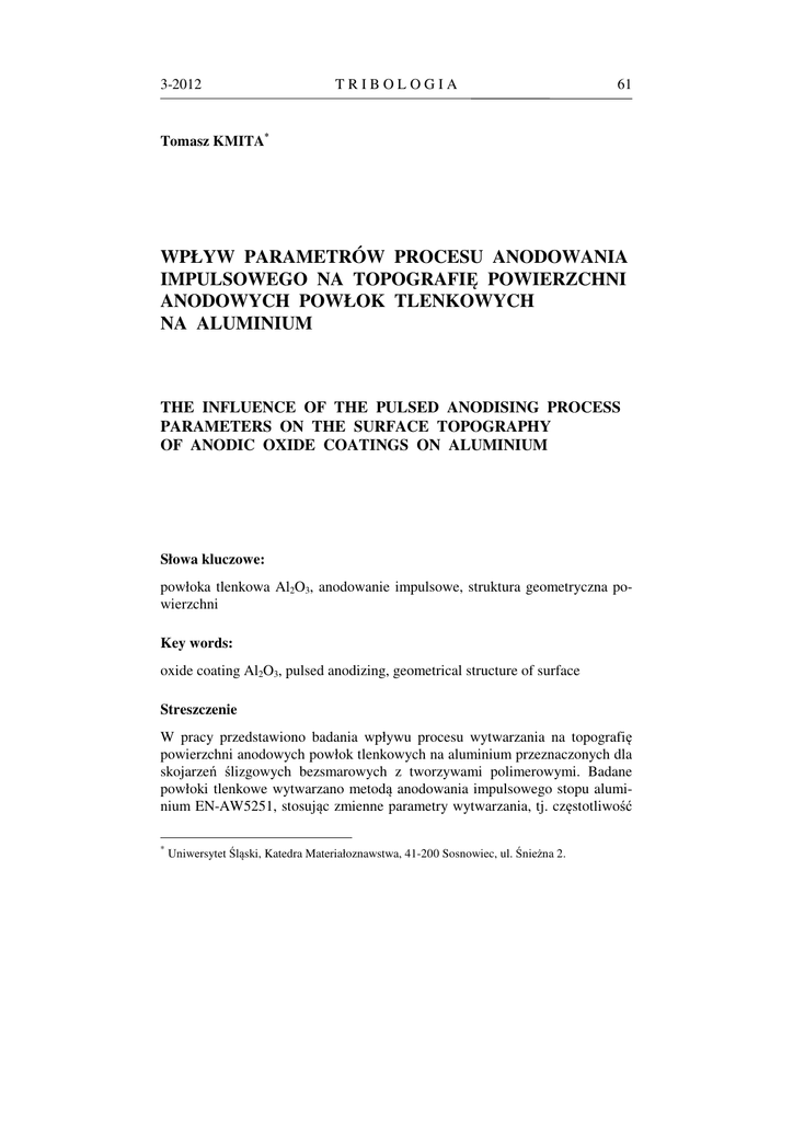 3-2012 TRIBOLOGIA 61 Tomasz KMITA* WPŁYW PARAMETRÓW PROCESU ANODOWANIA IMPULSOWEGO NA TOPOGRAFIĘ POWIERZCHNI ANODOWYCH POWŁOK TLENKOWYCH NA ALUMINIUM THE INFLUENCE OF THE PULSED ANODISING PROCESS PARAMETERS ON THE SURFACE TOPOGRAPHY OF ANODIC OXIDE COATINGS ON ALUMINIUM Słowa kluczowe: powłoka tlenkowa Al2O3, anodowanie impulsowe, struktura geometryczna powierzchni Key words: oxide coating Al2O3, pulsed anodizing, geometrical structure of surface Streszczenie W pracy przedstawiono badania wpływu procesu wytwarzania na topografię powierzchni anodowych powłok tlenkowych na aluminium przeznaczonych dla skojarzeń ślizgowych bezsmarowych z tworzywami polimerowymi. Badane powłoki tlenkowe wytwarzano metodą anodowania impulsowego stopu aluminium EN-AW5251, stosując zmienne parametry wytwarzania, tj. częstotliwość * Uniwersytet Śląski, Katedra Materiałoznawstwa, 41-200 Sosnowiec, ul. Śnieżna 2. 62 TRIBOLOGIA 3-2012 prądu anodowego (100÷0,2 Hz) oraz wypełnienie impulsu prostokątnego prądu (100÷40%). Badania topografii powierzchni prowadzono metodą profilografii stykowej (2D i 3D) na profilografometrze Form Talysur Series 2. Uzupełnieniem badań była ocena morfologii powierzchni ww. powłok tlenkowych na podstawie zdjęć SEM. Uzyskane wyniki badań dowodzą, iż modyfikacja parametrów prądowych procesu anodowania impulsowego pozwala na kształtowanie topografii i morfologii powierzchni anodowych powłok tlenkowych Al2O3 na stopie Al EN-AW5251. WPROWADZENIE Anodowe powłoki tlenkowe (APT) na stopach aluminium znajdują zastosowanie w niesmarowanych węzłach kinematycznych maszyn roboczych, m.in. jako gładzie cylindrów siłowników pneumatycznych i sprężarek, gdzie współpracują ślizgowo z polimerowymi uszczelnieniami [L. 1]. Głównym powodem stosowania APT jako modyfikatora warstwy wierzchniej aluminium jest możliwość uzyskania wysokiej mikrotwardości (300÷600 µHV) i niskiej ścieralności powierzchni. Ponadto anodowa powłoka Al2O3 charakteryzuje się bardzo dobrą adhezją do podłoża Al i dostateczną grubością (do 200 µm) [L. 1–2]. W niesmarowanych węzłach ślizgowych skojarzeń APT–tworzywo polimerowe istotną rolę pełni proces nanoszenia polimerowego filmu ślizgowego na powierzchnię powłoki tlenkowej. Szybkość nanoszenia filmu ślizgowego, jego stabilność i grubość mają wpływ na parametry procesu tarcia i zużycia, a w konsekwencji na trwałość i niezawodność węzła ślizgowego APT– –tworzywo polimerowe [L. 1, 3]. Proces nanoszenia polimerowego filmu ślizgowego na powierzchnie anodowej powłoki tlenkowej podczas współpracy ślizgowej z polimerami zależy w znacznym stopniu od struktury geometrycznej powierzchni (SGP) i morfologii powierzchni APT. Właściwości te można kształtować w pewnym zakresie m.in. poprzez warunki i metodę wytwarzania [L. 2, 4]. Jedną z metod wytwarzania powłok tlenkowych na aluminium jest metoda anodowania impulsowego [L. 5], która, jak wskazują wcześniejsze prace autora [L. 6, 7], pozwala na łatwą i stosunkowo tanią modyfikację właściwości tribologicznych APT (obniżenie współczynnika tarcia, zmniejszenie zużycia masowego współpracującego z APT tworzywa polimerowego). Prezentowana praca przedstawia badania nad wpływem parametrów procesu wytwarzania impulsowego (częstotliwości i stopnia wypełnienia impulsu prostokątnego prądu anodowego) na topografię powierzchni APT na aluminium. PRZEDMIOT I METODYKA BADAŃ Przedmiotem badań były anodowe powłoki tlenkowe Al2O3 uzyskiwane elektrochemicznie na stopie aluminium do przeróbki plastycznej EN-AW 5251. 3-2012 TRIBOLOGIA 63 Powłoki tlenkowe wytwarzano w elektrolicie wieloskładnikowym na bazie kwasu siarkowego i szczawiowego w temperaturze 303 K, w czasie 60 minut, przy zachowaniu stałych średnich gęstości ładunku elektrycznego 108 A·s/m2. Proces anodowania prowadzono przy użyciu stabilizowanego zasilacza metodą impulsową, stosując zmienne częstotliwości (100÷0,2 Hz) oraz wypełnienie impulsu prostokątnego prądu anodowania (100÷40%). Tabela 1 przedstawia spis zastosowanych modyfikacji przebiegów prądu anodowania impulsowego, natomiast Rys. 1 zawiera oznaczenia parametrów przebiegu prądu. Tabela 1. Zastosowane modyfikacje prądu impulsowego Table 1. Applied modifications of pulsed current Nr próbki 1 2 3 4 5 6 7 8 9 10 11 12 Częstotliwość prądu [Hz] Prąd stały (DC) 1 1 1 100 100 100 10 Prąd stały (DC) 0,2 2 0,2 Stopień wypełnienia impuslu [%] 100 80 60 40 80 60 40 80 100 80 60 40 Rys. 1. Oznaczenia parametrów zastosowanego przebiegu prądu impulsowego Fig. 1. Designations of the parameters of the pulsed current applied Wytworzone próbki poddano badaniom struktury geometrycznej powierzchni metodą profilografii stykowej przy użyciu profilografometru Talysurf Series 2. Badania SGP prowadzono metodą 3D (próbki 1÷8) na powierzchniach 4 mm2 oraz 2D (próbki 9÷12), zbierając po 10 profili chropowatości powierzchni. Analizę uzyskanych danych profilografometrycznych przeprowadzono przy wykorzystaniu programu TalyMap 3D. Uzupełnieniem ww. badań była ocena morfologii powierzchni powłok tlenkowych (próbki 1÷4) wykonana za pomocą programu Met-Ilo na podstawie zdjęć o powiększeniu 5000× uzyskanych z zastosowaniem mikroskopu skaningowego Philips Xl30/ESEM/EDAX. 64 TRIBOLOGIA 3-2012 WYNIKI BADAŃ Struktura geometryczna powierzchni anodowych powłok tlenkowych na stopach aluminium wytworzonych metodą impulsową charakteryzuje się: niskimi wartościami parametrów amplitudowych Sa, Sq, Sz; korzystnym stosunkiem parametrów krzywej nośności Spk, Svk, Sk oraz ujemną wartością współczynnika asymetrii rozkładu wysokości topografii powierzchni Ssk (Tabela 2). Tabela 2. Parametry stereometryczne powierzchni anodowych powłok tlenkowych Table. 2. The surface stereometric parameters of anodic oxide coatings Nr próbki 1 2 3 4 5 6 7 8 Parametry stereometryczne Sa [µm] 0,99 