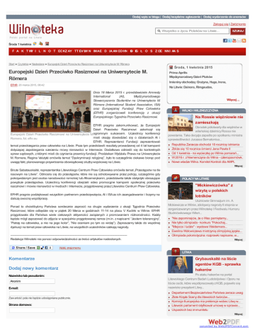 Dodaj wpis w blogu | Dodaj bezpłatne ogłoszenie | Dodaj wydarzenie do anonsów Zaloguj się | Załóż konto Wszystko o życiu Polaków na Litwie... SZUKAJ Środa 1 kwietnia F A K T WY I L N O T EC KZ AY TT EV LW N IM AE D IA AN CO HN S O EG Ł O S Z OE NN I AA S Start » Czytelnia » Nadesłane » Europejski Dzień Przeciwko Rasizmowi na Uniwersytecie M. Römera Środa, 1 kwietnia 2015 Europejski Dzień Przeciwko Rasizmowi na Uniwersytecie M. Römera EFHR, 20 marca 2015, 08:42 Prima Aprilis Międzynarodowy Dzień Ptaków Imieniny obchodzą: Grażyna, Hugo, Irena, Na Litwie: Dainora, Rimgaudas, Dnia 18 Marca 2015 r. przedstawiciele Amnesty International (AI), Międzynarodowego Stowarzyszenia Studentów na Uniwersytecie M. Römera (International Student Association, ISA) oraz Europejskiej Fundacji Praw Człowieka (EFHR) zorganizowali konferencję z okazji Europejskiego Tygodnia Przeciwko Rasizmowi. EFHR pragnie zakomunikować, że Europejski Dzień Przeciwko Rasizmowi zakończył się Europejski Dzień Przeciwko Rasizmowi na Uniwersytecie M.ogromnym sukcesem. Uczestnicy konferencji mieli okazję dowiedzieć się o działaniach AI i Romera, fot. efhr.eu EFHR. Reprezentanci Fundacji zaprezentowali temat przestrzegania praw człowieka na Litwie. Poza tym przedstawili rezultaty prowadzonej od 4 lat kampanii dotyczącej zapobiegania szerzeniu mowy nienawiści w Internecie. Dodatkowo odnieśli się do konkretnych spraw sądowych, z którymi mieli do czynienia prawnicy fundacji. Prodziekan Wydziału Prawa na Uniwersytecie M. Romera, Regina Valutytė omówiła temat “Dyskryminacji religijnej”, było to szczególnie ciekawe biorąc pod uwagę fakt, planowanego przywrócenia obowiązkowej służby wojskowej na Litwie. Więcej ... WILNO I WILEŃSZCZYZNA Na Rossie więźniowie nie zamieszkają Ośrodek półotwarty dla więźniów w wileńskiej dzielnicy Rossa nie powstanie. Taka decyzja zapadła po spotkaniu ministra sprawiedliwości Juozasa Bernatonisa... Republika Zarzecza obchodzi 18 rocznicę istnienia Zbliża się 10 rocznica śmierci Jana Pawła II Od 1 kwietnia - na wycieczkę po Wilnie pomarań... W 2016 r. z Niemenczyna do Wilna - czteropasmówk... Nowe władze Wilna. Komitet Kontroli dla AWPL Więcej Birute Sabatauskaitė, reprezentantka Litewskiego Centrum Praw Człowieka omówiła temat „Przestępstw na tle rasowym na Litwie”. Odniosła się do przestępstw, które nie są odnotowywane przez policję, szczególnie gdy pokrzywdzonym jest osoba narodowości romskiej lub Afroamerykanin, przedstawiła także statystyki obrazujące powyższe przestępstwa. Uczestnicy konferencji obejrzeli video promocyjne kampanii społecznej przeciwko rasizmowi i mowie nienawiści w mediach i Internecie, przygotowanej przez Litewskie Centrum Praw Człowieka. EFHR pragnie podziękować wszystkim partnerom przedsięwzięcia, AI i ISA za ich zaangażowanie i liczymy na dalszą owocną współpracę. Ponad to chcielibyśmy Państwa serdecznie zaprosić na drugie wydarzenie z okazji Tygodnia Przeciwko Rasizmowi, które odbędzie się w piątek 20 Marca w godzinach 11-14 na placu V. Kudirki w Wilnie. EFHR przygotowała dla Państwa wiele ciekawych aktywności związanych z promowaniem różnorodności. Każdy będzie mógł zapozować do zdjęcia w specjalnie przygotowanej ramce (m.in. z napisami “Jestem tolerancyjny”, “Patrzę na człowieka, a nie na jego kolor”, “Nie oceniam po tym co widzę”). Zapraszamy także do wspólnej dyskusji na temat praw człowieka na Litwie, na wszystkich uczestników czekają nagrody. ---------------------------------------------------------------------------------------------------------------------Redakcja Wilnoteki nie ponosi odpowiedzialności za treści artykułów nadesłanych. POLACY NA LITWIE "Mickiewiczówka" z wizytą u polskich lotników Uczniowie Gimnazjum im. A. Mickiewicza w Wilnie, zdobywcy nagrody II stopnia w zorganizowanym przez Wilnotekę I Festiwalu Humoru Studniówkowego Wileń... "Nie zapominajcie, że o Was pamiętamy... Nie tylko olimpiada - konkurs "Pokochaj... "Miejsca i ludzie" - wystawa Waldemara... Ewelina Wołowiczewa mistrzynią olimpijską języka... Olimpiada polonistyczna: rozprawki napisane, w... Więcej Wyślij znajomemu LITWA Komentarze Dodaj nowy komentarz Nazwisko lub pseudonim: Anonim E-mail: Zawartość pola nie będzie udostępniana publicznie. Strona domowa: Grybauskaitė na liście agentów KGB - sprawka hakerów Po ataku hakerów na portal Litewskiego Centrum Badań Ludobójstwa i Oporu na liście osób, które współpracowały z KGB, pojawiło się nazwisko prezydent Litwy... Departament Bezpieczeństwa Państwa zwraca uwagę... Złote Krzyże Sceny dla litewskich twórców... Komisja Europejska ma pretensje wobec Litwy w... Litewski parlament ratyfikował umowę w sprawie... Uspaskich bez immunitetu Więcej converted by W eb2PDFConvert.com Komentarz: * ZA MIEDZĄ Z Wileńszczyzny na studia do Suwałk Matury coraz bliżej, a co dalej? Najlepiej oczywiście zacząć studia. Mimo że uczelni na Litwie nie brakuje, a na wielu kierunkach zaczyna brakować student... Orędzie Warlikowskiego na Międzynarodowy Dzień... Obława Augustowska - po 70 latach nadal... "Bądźmy razem" - s. Michaela Rak... Nie żyje Bożena Rafalska "Rajd Dragonów" przez kraje bałtyckie,... Więcej Zachowaj Podgląd OGŁOSZENIA Poszukujemy pracownika szklarnia\produkcja\szkółka roślin SOWNO 73-110 Stargard Szczeciński okolice SZCZECINA - 30km Berlin 140 Biotrop Ogrodnictwo in vitro Europejska Fundacja Praw Człowieka poszukuje... darmowa telewizja online bez limitow Zatrudnię opiekunkę lub opiekuna seniorów - praca... Wynajmuje 9 osobowy bus Opel Vivaro Więcej OSTATNIO KOMENTOWANE Zadna "anexja" Krymu,... 01.04.2015 - 12:58 Mordy stalinowskie pewnie 01.04.2015 - 10:29 Oświadczenie szefowej 01.04.2015 - 09:47 Nielegalna aneksja Krymu 01.04.2015 - 09:43 Nielegalna aneksja Krymu 01.04.2015 - 09:43 Projekt jest współfinansowany ze śro