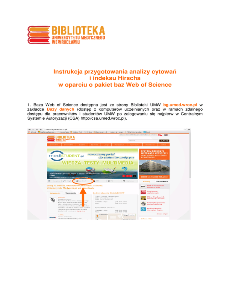 Instrukcja przygotowania analizy cytowań i indeksu Hirscha w oparciu o pakiet baz Web of Science 1. Baza Web of Science dostępna jest ze strony Biblioteki UMW bg.umed.wroc.pl w zakładce Bazy danych (dostęp z komputerów uczelnianych oraz w ramach zdalnego dostępu dla pracowników i studentów UMW po zalogowaniu się najpierw w Centralnym Systemie Autoryzacji (CSA) http://csa.umed.wroc.pl). 2. Z listy wszystkich baz należy wybrać Web of Science. Po kliknięciu pokaże się moduł bazy i jej nowy interfejs. 3. W polu rozwijalnym należy wybrać opcję Author a następnie wpisać swoje nazwisko i inicjał imienia z gwiazdką np. Nowak N*. Pomijane są znaki diakrytyczne. Wielkość liter nie ma znaczenia. Uwaga: Jeśli wyszukiwanie dotyczy osoby, która publikowała pod różnymi wersjami nazwiska lub imienia, należy je wszystkie w zapytaniu uwzględnić używając separatora or (np. nowak m* or kowalska-nowak m*). Następnie należykliknąć przycisk Search. 2 4. Na ekranie wyświetli się wynik w postaci listy prac autora Nowak M* zindeksowanych w bazie Web of Science. Następnie należy wybrać opcję Create Citation Reports. 5. Na otrzymanym ekranie po prawej stronie pojawi się zbiorcza informacja o liczbie cytowań z autocytowaniami i bez nich oraz h-index. Poniżej wyświetli się także lista prac zindeksowanych w bazie wraz z liczbą cytowań za poszczególne lata oraz wynik sumaryczny Total. 3 WAŻNE 6. Ze względu na możliwość współistnienia kilku autorów o tym samym nazwisku, koniecznym jest wyeliminowanie nie swoich prac ze zbioru. Należy zaznaczyć okienko znajdujące się po lewej stronie opisu a następnie kliknąć opcję Go. Dopiero po upewnieniu się, że wszystkie wykazane w tabelce prace są Twoimi, odczytaj dane o liczbie cytowań i h-index. WSKAZÓWKA Należy pamiętać, że eliminowanie najlepiej wykonywać w obrębie jednej strony, gdyż w przypadku odznaczenia dorobku na kilku stronach jednocześnie, system i tak zapamiętuje zaznaczanie tylko ostatniej z nich i w rezultacie wszystko trzeba zaczynać od początku. Kliknięcie przycisku Go eliminuje niechciane prace, a tym samym aktualizuje wyniki cytowań i h-index. WAŻNE Podając wyniki do arkusza oceny należy pamiętać aby wpisać: * liczbę cytowań z autocytowaniami * liczbę cytowań bez autocytowań * h-index * datę, kiedy cytowania były wyliczane (baza WoS aktualizowana jest raz w tygodniu, co może przełożyć się na różnicę w wynikach). 4