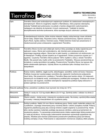 KARTA TECHNICZNA DATA: 03/12/2011 Strona 1/3 Opis Tierrafino Stone jest wodoodpornym wapiennym tynkiem do zastosowań wewnętrznych i zewnętrznych. Stone to oryginalny wapień z Marrakeszu, który poprzez starożytną metodę Tadelakt jest polerowany na połysk z bardzo eleganckim wykończeniem, nadającym się idealnie do łazienek i innych zastosowań. Tadelakt to bardzo skomplikowana technika tynkowania, która wymaga dużych zdolności i praktyki. Kolory 8 standardowych kolorów, które można mieszać między sobą tworząc nowe odcienie: Dover biały, Delphi biały, Rzymska ochra, Nassau pomarańczowy, Djenné czerwony, Ayers Rock, Iquitos zielony i Gomera szary. Paleta kolorów może być poszerzana w nieskończoność przez zmieszanie z pigmentami Tierrafino. Właściwości Tierrafino Stone ma ten sam skład jak marmur który powstaje ze skały wapiennej pod wpływem czasu. Stone jest wodoodporny, ale również paro przepuszczalny, co wspomaga regulację wilgoci. Stone jest w pełni twardy, w zależności od okoliczności, po 6 miesiącach. Podłóg używać dopiero po 4 tygodniach. Ściany prysznica używać po 1 tygodniu. Czyścimy Tierrafino Stone jedynie 100% mydłem z oliwy z oliwek Tierrafino Mydło. Nie pozwól aby mydło schło na powierzchni Tadelaktu. Wysusz powierzchnię po kontakcie z wodą ręcznikiem lub gąbką. Powierzchnia Tierrafino Stone ma typowe dla siebie włoskowate pęknięcia. Używaj Stone na podłodze tylko chodząc boso lub w skarpetkach. Podłoża Ściany nośne, stabilne, ciągle suche, absorbujące, szorstkie, wolne od kurzu i tłuszczu. Podłoża muszą być wystarczająco szorstkie aby zapewnić mechaniczne połączenie. Usuń farby. Dla powierzchni, podłożę z Tierrafino Base jest bardzo dobre. W miejscach narażonych na działanie wody, wodoodporny podkład jest wymagany. Podłoże nie może się kurczyć, lub wyginać, wszelkie wewnętrzne naprężenia podłoża będą widoczne w postaci pęknięć na powierzchni. Warunki aplikacji Temp. powietrza i podłoża musi wynosić nie mniej niż +5°C. Mieszanie Nakładanie Nakładanie Dodaj 5 l wody do 12,5 kg wiadra Stone (0,4 l/1 kg). Zamknij wieko i odstaw na okres 230 dni. Otwórz wiadro , dodaj wody i mieszaj do uzyskania pasty. Na ściany, opróżnij kilka wiader do kuwety i mieszaj mieszalnikiem do uzyskania pasty. Zwilżyć podłoże. Nałóż 5-6 mm Stone metalową pacą. Kiedy część materiału połączy się z podłożem, używając drewnianej pacy rozcieraj Stone i utwórz pożądany kształt. Poleruj regularnie plastikową pacą aby wcisnąć drobne cząstki wapienia w powierzchnię. Kiedy tylko cienka warstwa materiału poddaje się jeszcze obróbce, poleruj ją kamieniem do uzyskania połysku. To spowoduje przemieszczenie mleka wapiennego bliżej powierzchni co nada jej struktury. Kontynuując polerowanie kamieniem spowoduje pojawienie się połysku. Możliwe jest również polerowanie powierzchni plastikową pacą lub foliową torebką zwiniętą w kulę. Polerowanie w odpowiednim momencie zwiększy efekt połysku. Tierrafino BV - Archangelkade 23 1013 BE - Amsterdam - The Netherlands - www.tierrafino.nl KARTA TECHNICZNA DATA: 03/12/2011 Strona 2/3 Wykańczanie Kiedy powierzchnia jest stabilna; kiedy połysk nie znika gdy przeciągniemy powierzchnię palcem, nałóż zmieszane Mydło Tierrafino z wodą (1:50) za pomocą miękkiego pędzla. Powtórz czynność do momentu nasycenia. Nadwyżkę mieszanki mydła delikatnie przetrzyj foliową torebką zwinięta w kulę aż powierzchnia pozostanie sucha. Poczekaj 2 – 6 h i nałóż mieszankę mydła z wodą w proporcji 1 : 25 miękkim pędzlem, następnie poleruj kamieniem. Używaj mydła jak pasty polerskiej, kamień powinien ślizgać się po powierzchni. Powtarzaj polerowanie z przerwami aż do uzyskania wysokiego połysku. Porada: zacznij aplikację mieszanki mydła z wodą od dolnej części obiektu aby uniknąć strużek o ile nie będą one wycierane na bieżąco. Prysznice i wanny wymagają 7 krotnego namydlania podczas aplikacji oraz regularnego namydlania podczas późniejszego użytkowania. Tierrafino Stone posiada subtelny do wysokiego połysk. Dla wzmocnienia efektu połysku w narażonych na działanie czynników zewnętrznych lub wysoko wyeksponowanych miejscach stosuj Tierrafino Wosk. Niezabezpieczony Stone jest łatwy do zabrudzenia przez wino czy kawę. Zużycie 5 kg/m² przy grubości 5 - 6 mm. Czas schnięcia W temp. +20 ° C oraz wilgotności powietrza 60 % Stone schnie od 2 do 6 dni. Całkowicie utwardzony jest po 6 miesiącach. Nie przyspieszaj schnięcia. Czas schnięcia jest bardzo różny i zależy także od samego podłoża. Rozcieńczalnik Woda Przydatność do Kiedy zmieszany z wodą zużyć w ciągu 30 dni. użycia Skład Wapień, naturalne pigmenty,pigmenty żelazowe (tylko w Dover białym i Ayers Rock). W związku z użyciem naturalnych barwników możliwe są różnice w kolorze między różnymi dostawami tego samego koloru. Środki Stone jest wapnem, 'pali' oczy i wysusza skórę. Unikać kontaktu z błonami śluzowymi i bezpieczeństwa oczami. Stosować okulary ochronne podczas aplikacji na sufitach. Przechowuj z dala od dzieci. Przepłucz obficie oczy jeżeli doszło do kontaktu. Jeżeli irytacja skóry lub oczu przedłuża się skontaktuj się z lekarzem. Sposób Przechowywać w pomieszczeniach suchych i chłodnych. Chronić przed temp. poniżej 0°C przechowywania Opakowania 12,5 kg wiadra Tierrafino BV - Archangelkade 23 1013 BE - Amsterdam - The Netherlands - www.tierrafino.nl KARTA TECHNICZNA DATA: 03/12/2011 Strona 3/3 Tabela podłoży Podłoże Przygotowanie 1 Beton, gładka cegła Cement Przygotowanie 2 Odpowiednie dla łazienek x Płyta gipsowa Oczyść, załóż siatkę na połączenia i wypełnij połączenia. Nałóż pokład Contact Szorstko wykończony cement, 12 mm wapienno -cementowe zaprawy z silną siatką wzmacniającą Świeże tynk gipsowe, wapienny lub cementowo wapienny Usuń 