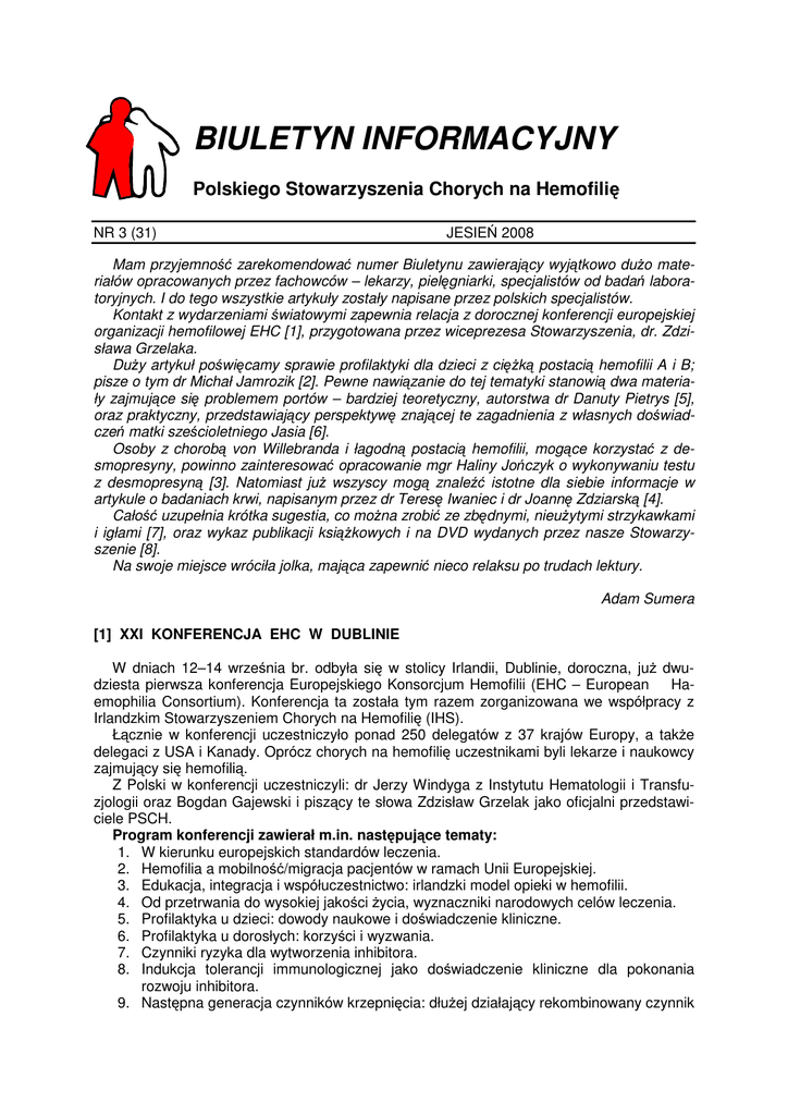 BIULETYN INFORMACYJNY Polskiego Stowarzyszenia Chorych na Hemofilię NR 3 (31) JESIEŃ 2008 Mam przyjemność zarekomendować numer Biuletynu zawierający wyjątkowo dużo materiałów opracowanych przez fachowców – lekarzy, pielęgniarki, specjalistów od badań laboratoryjnych. I do tego wszystkie artykuły zostały napisane przez polskich specjalistów. Kontakt z wydarzeniami światowymi zapewnia relacja z dorocznej konferencji europejskiej organizacji hemofilowej EHC [1], przygotowana przez wiceprezesa Stowarzyszenia, dr. Zdzisława Grzelaka. Duży artykuł poświęcamy sprawie profilaktyki dla dzieci z ciężką postacią hemofilii A i B; pisze o tym dr Michał Jamrozik [2]. Pewne nawiązanie do tej tematyki stanowią dwa materiały zajmujące się problemem portów – bardziej teoretyczny, autorstwa dr Danuty Pietrys [5], oraz praktyczny, przedstawiający perspektywę znającej te zagadnienia z własnych doświadczeń matki sześcioletniego Jasia [6]. Osoby z chorobą von Willebranda i łagodną postacią hemofilii, mogące korzystać z desmopresyny, powinno zainteresować opracowanie mgr Haliny Jończyk o wykonywaniu testu z desmopresyną [3]. Natomiast już wszyscy mogą znaleźć istotne dla siebie informacje w artykule o badaniach krwi, napisanym przez dr Teresę Iwaniec i dr Joannę Zdziarską [4]. Całość uzupełnia krótka sugestia, co można zrobić ze zbędnymi, nieużytymi strzykawkami i igłami [7], oraz wykaz publikacji książkowych i na DVD wydanych przez nasze Stowarzyszenie [8]. Na swoje miejsce wróciła jolka, mająca zapewnić nieco relaksu po trudach lektury. Adam Sumera [1] XXI KONFERENCJA EHC W DUBLINIE W dniach 12–14 września br. odbyła się w stolicy Irlandii, Dublinie, doroczna, już dwudziesta pierwsza konferencja Europejskiego Konsorcjum Hemofilii (EHC – European Haemophilia Consortium). Konferencja ta została tym razem zorganizowana we współpracy z Irlandzkim Stowarzyszeniem Chorych na Hemofilię (IHS). Łącznie w konferencji uczestniczyło ponad 250 delegatów z 37 krajów Europy, a także delegaci z USA i Kanady. Oprócz chorych na hemofilię uczestnikami byli lekarze i naukowcy zajmujący się hemofilią. Z Polski w konferencji uczestniczyli: dr Jerzy Windyga z Instytutu Hematologii i Transfuzjologii oraz Bogdan Gajewski i piszący te słowa Zdzisław Grzelak jako oficjalni przedstawiciele PSCH. Program konferencji zawierał m.in. następujące tematy: 1. W kierunku europejskich standardów leczenia. 2. Hemofilia a mobilność/migracja pacjentów w ramach Unii Europejskiej. 3. Edukacja, integracja i współuczestnictwo: irlandzki model opieki w hemofilii. 4. Od przetrwania do wysokiej jakości życia, wyznaczniki narodowych celów leczenia. 5. Profilaktyka u dzieci: dowody naukowe i doświadczenie kliniczne. 6. Profilaktyka u dorosłych: korzyści i wyzwania. 7. Czynniki ryzyka dla wytworzenia inhibitora. 8. Indukcja tolerancji immunologicznej jako doświadczenie kliniczne dla pokonania rozwoju inhibitora. 9. Następna generacja czynników krzepnięcia: dłużej działający rekombinowany czynnik VIII. Jednym z ważniejszych zagadnień, nad którymi zastanawiali się uczestnicy tegorocznej konferencji w Dublinie, był problem standardów opieki i leczenia w hemofilii. Część opowiadała się za ustaleniem i wprowadzeniem w życie takich standardów, które obowiązywałyby na terenie całej Unii Europejskiej, część zaś była temu przeciwna, twierdząc, że takie standardy nie będą funkcjonowały. Według tych ostatnich właściwie wystarczy wysoki poziom zaopatrzenia w czynniki krzepnięcia. Ciekawy wykład na ten temat przedstawił profesor Christopher Ludlam – dyrektor Centrum Hemofilii w Edynburgu (Szkocja). Innym bardzo ważnym problemem w obecnej dobie staje się migracja pacjentów w ramach Unii Europejskiej. Poseł do Parlamentu Europejskiego z ramienia Partii Pracy Irlandii, Proinsias De Rossa przedstawił swoje spostrzeżenia w tym temacie. Fakt stale rosnącej mobilności i migracji całych grup narodowych, społecznych, a także pacjenckich będzie zmuszał rządy poszczególnych krajów do ujednolicenia zaopatrzenia, opieki i leczenia chorych na hemofilię w całej Unii Europejskiej. Nam Polakom jest to szczególnie bliskie, ponieważ wielu naszych kolegów z hemofilią wyjechało „za chlebem” a przy okazji „za zdrowiem” do innych krajów UE, a w szczególności do Irlandii i Wielkiej Brytanii. Irlandzki model leczenia i opieki w hemofilii zaprezentował dr Barry White – dyrektor Narodowego Centrum Dziedzicznych Zaburzeń Krzepnięcia w Dublinie – w swoim wykładzie „Edukacja, integracja i współuczestnictwo: irlandzki model opieki w hemofilii”. W Irlandii liczącej 4,4 miliona ludności jest zarejestrowanych 577 chorych na hemofilię A i B oraz 616 chorych z chorobą von Willebranda. Powszechnie są tam stosowane wyłącznie leki rekombinowane, jako najbezpieczniejsze w intensywnym leczeniu domowym oraz profilaktycznym. Profilaktyka dla wszystkich dzieci, nastolatków, a także dla części dorosłych jest w pełni dostępna już od lat i to z bardzo dobrym skutkiem. Obecnie dzieci, a także młodzi ludzie z hemofilią są w Irlandii nie do odróżnienia, pod względem sprawności fizycznej, od swoich zdrowych rówieśników. System leczenia w Irlandii opiera się na kilku podstawowych filarach; są nimi: ▪ rejestr krajowy ▪ Narodowe Programy Leczenia ▪ kompleksowe ośrodki w Cork i w Dublinie (2) ▪ ośrodki leczenia w 5 innych miastach ▪ sieć ośrodków hepatologicznych wyspecjalizowanych w leczeniu WZW typu C. W procesie zakupu koncentratów czynnika stosowany jest krajowy przetarg, a w komisji przetargowej zasiadają obok lekarzy specjalistów również przedstawiciele Irlandzkiego Stowarzyszenia Chorych na Hemofilię z prawem do głosu decydującego. Rezultatem takiej organizacji i struktury zaopatrzenia w koncentraty, a przede wszystkim ich ilości i dostępności, jest lepsza jak