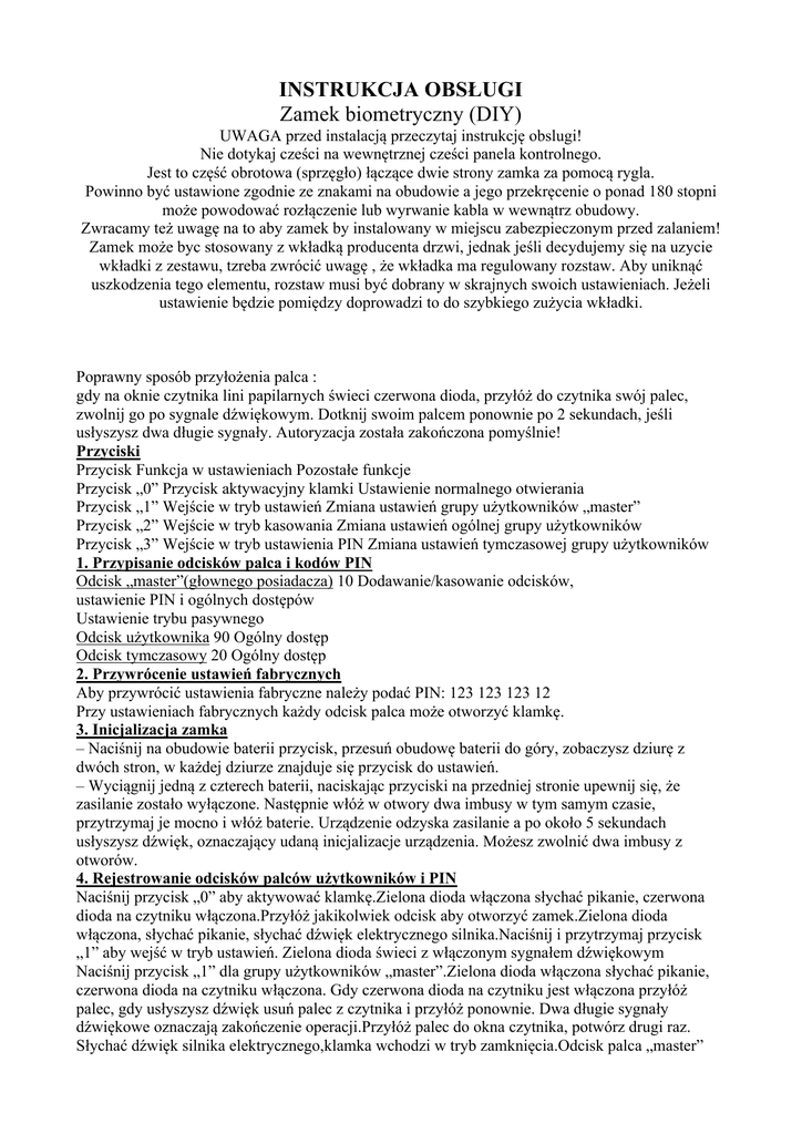 INSTRUKCJA OBSŁUGI Zamek biometryczny (DIY) UWAGA przed instalacją przeczytaj instrukcję obslugi! Nie dotykaj cześci na wewnętrznej cześci panela kontrolnego. Jest to część obrotowa (sprzęgło) łączące dwie strony zamka za pomocą rygla. Powinno być ustawione zgodnie ze znakami na obudowie a jego przekręcenie o ponad 180 stopni może powodować rozłączenie lub wyrwanie kabla w wewnątrz obudowy. Zwracamy też uwagę na to aby zamek by instalowany w miejscu zabezpieczonym przed zalaniem! Zamek może byc stosowany z wkładką producenta drzwi, jednak jeśli decydujemy się na uzycie wkładki z zestawu, tzreba zwrócić uwagę , że wkładka ma regulowany rozstaw. Aby uniknąć uszkodzenia tego elementu, rozstaw musi być dobrany w skrajnych swoich ustawieniach. Jeżeli ustawienie będzie pomiędzy doprowadzi to do szybkiego zużycia wkładki. Poprawny sposób przyłożenia palca : gdy na oknie czytnika lini papilarnych świeci czerwona dioda, przyłóż do czytnika swój palec, zwolnij go po sygnale dźwiękowym. Dotknij swoim palcem ponownie po 2 sekundach, jeśli usłyszysz dwa długie sygnały. Autoryzacja została zakończona pomyślnie! Przyciski Przycisk Funkcja w ustawieniach Pozostałe funkcje Przycisk „0” Przycisk aktywacyjny klamki Ustawienie normalnego otwierania Przycisk „1” Wejście w tryb ustawień Zmiana ustawień grupy użytkowników „master” Przycisk „2” Wejście w tryb kasowania Zmiana ustawień ogólnej grupy użytkowników Przycisk „3” Wejście w tryb ustawienia PIN Zmiana ustawień tymczasowej grupy użytkowników 1. Przypisanie odcisków palca i kodów PIN Odcisk „master”(głownego posiadacza) 10 Dodawanie/kasowanie odcisków, ustawienie PIN i ogólnych dostępów Ustawienie trybu pasywnego Odcisk użytkownika 90 Ogólny dostęp Odcisk tymczasowy 20 Ogólny dostęp 2. Przywrócenie ustawień fabrycznych Aby przywrócić ustawienia fabryczne należy podać PIN: 123 123 123 12 Przy ustawieniach fabrycznych każdy odcisk palca może otworzyć klamkę. 3. Inicjalizacja zamka – Naciśnij na obudowie baterii przycisk, przesuń obudowę baterii do góry, zobaczysz dziurę z dwóch stron, w każdej dziurze znajduje się przycisk do ustawień. – Wyciągnij jedną z czterech baterii, naciskając przyciski na przedniej stronie upewnij się, że zasilanie zostało wyłączone. Następnie włóż w otwory dwa imbusy w tym samym czasie, przytrzymaj je mocno i włóż baterie. Urządzenie odzyska zasilanie a po około 5 sekundach usłyszysz dźwięk, oznaczający udaną inicjalizacje urządzenia. Możesz zwolnić dwa imbusy z otworów. 4. Rejestrowanie odcisków palców użytkowników i PIN Naciśnij przycisk „0” aby aktywować klamkę.Zielona dioda włączona słychać pikanie, czerwona dioda na czytniku włączona.Przyłóż jakikolwiek odcisk aby otworzyć zamek.Zielona dioda włączona, słychać pikanie, słychać dźwięk elektrycznego silnika.Naciśnij i przytrzymaj przycisk „1” aby wejść w tryb ustawień. Zielona dioda świeci z włączonym sygnałem dźwiękowym Naciśnij przycisk „1” dla grupy użytkowników „master”.Zielona dioda włączona słychać pikanie, czerwona dioda na czytniku włączona. Gdy czerwona dioda na czytniku jest włączona przyłóż palec, gdy usłyszysz dźwięk usuń palec z czytnika i przyłóż ponownie. Dwa długie sygnały dźwiękowe oznaczają zakończenie operacji.Przyłóż palec do okna czytnika, potwórz drugi raz. Słychać dźwięk silnika elektrycznego,klamka wchodzi w tryb zamknięcia.Odcisk palca „master” został ustawiony. Dodawanie użytkowników tymczasowych aby aktywować klamkę,Zielona dioda włączona słychać pikanie,czerwona dioda na czytniku włączona.Przyłóż jakikolwiek odcisk palca„master” aby otworzyć zamek.Zielona dioda włączona, słychać pikanie,słychać dźwięk elektrycznego silnika.Naciśnij i przytrzymaj przycisk „1” aby wejść w tryb ustawień.Zielona dioda świeci z włączonym sygnałem dźwiękowym Naciśnij przycisk „2” dla grupy użytkowników ogólnych.Gdy czerwona dioda na czytniku jest włączona przyłóż palec, gdy usłyszysz dźwięk usuń palec z czytnika i przyłóż ponownie Dwa długie sygnały dźwiękowe oznaczają zakończenie operacji. Zielona dioda włączona słychać pikanie, czerwona dioda na czytniku włączona Przyłóż palec do okna czytnika, potwórz drugi raz Słychać dźwięk silnika elektrycznego, klamka wchodzi w tryb zamknięcia Odcisk palca użytkownika ogólnego został ustawiony Naciśnij przycisk „0” aby aktywować klamkę, Zielona dioda włączona słychać pikanie, czerwona dioda na czytniku włączona. Przyłóż jakikolwiek odcisk „master” aby otworzyć zamek. Zielona dioda włączona, słychać pikanie,słychać dźwięk elektrycznego silnika.Naciśnij i przytrzymaj przycisk „1” aby wejść w tryb ustawień. Zielona dioda świeci z włączonym. sygnałem dźwiękowym. Naciśnij przycisk „3” dla grupy,użytkowników tymczasowych. Gdy czerwona dioda na czytniku jest włączona przyłóż, palec, gdy usłyszysz dźwięk usuń palec z czytnika i przyłóż ponownie Dwa długie sygnały dźwiękowe oznaczają zakończenie operacji.Zielona dioda włączona słychać pikanie,czerwona dioda na czytniku włączona. Przyłóż palec do okna czytnika, potwórz drugi raz. Słychać dźwięk silnika elektrycznego,klamka wchodzi w tryb zamknięcia. Odcisk palca użytkownika tymczasowego został dodany. Ustawienia PINu: PIN musi mieć 11 cyfr i nie może zaczynać się cyfrą „0”. Gdy PIN będzie ustawiony z „0” na początku, klamka nie otworzy się po jego wpisaniu 6.Kasowanie od cisków palca użytkowników Kasowanie grupy master Nota: Gdy zostanie wykasowana grupa „master” klamka powróci do ustawień fabrycznych, zostaną usunięci wszyscy użytkownicy, PIN zostanie ustawiony na fabryczny. Naciśnij przycisk „0” aby aktywować klamkę Zielona dioda włączona s