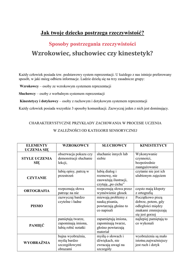 Jak twoje dziecko postrzega rzeczywistość? Sposoby postrzegania rzeczywistości Wzrokowiec, słuchowiec czy kinestetyk? Każdy człowiek posiada tzw. podstawowy system reprezentacji. U każdego z nas istnieje preferowany sposób, w jaki mózg odbiera informacje. Ludzie dzielą się na trzy zasadnicze grupy: Wzrokowcy – osoby ze wzrokowym systemem reprezentacji Słuchowcy – osoby z werbalnym systemem reprezentacji Kinestetycy i dotykowcy – osoby z ruchowym i dotykowym systemem reprezentacji Każdy człowiek posiada wszystkie 3 sposoby komunikacji. Zazwyczaj jeden z nich jest dominujący. CHARAKTERYSTYCZNE PRZYKŁADY ZACHOWANIA W PROCESIE UCZENIA W ZALEŻNOŚCI OD KATEGORII SENSORYCZNEJ ELEMENTY UCZENIA SIĘ STYLE UCZENIA SIĘ CZYTANIE ORTOGRAFIA WZROKOWCY obserwacja pokazu czy demonstracji słuchanie lekcji, słuchanie innych lub siebie lubią opisy, patrzą w przestrzeń lubią dialog i rozmowę, nie zauważają ilustracji, czytają „po cichu” rozpoznają słowa przez wymówienie głosek miewają problemy z nauką pisania, powtarzają głośno to co napisali rozpoznają słowa patrząc na nie zazwyczaj bardzo czytelne i ładne PISMO PAMIĘĆ WYOBRAŹNIA SŁUCHOWCY pamiętają twarze, zapominają imiona, lubią robić notatki bujna wyobraźnia, myślą bardzo szczegółowymi obrazami zapamiętują imiona, zapominają twarze, głośno powtarzają materiał myślą o słowach i dźwiękach, nie zwracają uwagi na szczegóły KINESTETYCY Wykonywanie czynności, bezpośrednie zaangażowanie czytanie nie jest ich ulubionym zajęciem często mają kłopoty z ortografią Początkowo piszą dobrze, potem, gdy odległości między znakami zmniejszają się jest gorzej najlepiej pamiętają to co wykonali wyobrażenia są mało istotne,najważniejszy jest ruch i dotyk KONCENTRACJA ROZWIĄZYWANIE PROBLEMÓW STOSUNEK DO OKRESÓW MAŁO AKTYWNYCH REAKCJA I STOSUNEK DO NOWYCH SYTUACJI STAN EMOCJONALNY nie są świadomi odgłosów, koncentrację burzy im nieporządek lub ruch przemyślane i z góry zaplanowane rysują, patrzą w dal tracą koncentrację w hałasie Poruszają się i zmieniają pozycję głośno myślą, rozmawiają nucą, rozmawiają impulsywni, szukają rozwiązań w ruchu wiercą się, znajdują coś do trzymania przeglądają się i badają sytuację rozmawiają o sytuacji, rozważają na głos za i przeciw manipulują, przestawiają, wyczuwają zamknięci w sobie, łatwo płaczą, ekspresywna twarz cisi, mówią: patrz, zobacz, widzisz schludni emocje wyrażają tonem i tembrem głosu przytulają się, dotykają, tupią, podskakują słuchają i dużo Gestykulują, stoją KOMUNIKOWANIE kwieciście mówią, blisko rozmówcy SIĘ dobrane ubranie nie szybko bywają WYGLĄD jest priorytetem wymiętoszeni ZEWNĘTRZNY wolą plastykę skupiają , wolą muzykę, wolą nie mówią o sztuce, REAKCJA NA się na szczegółach mówić niż patrzeć dotykają rzeźb SZTUKĘ Na podstawie: Katarzyna Gozdek-Michaelis, „Rozwiń swój genialny umysł, J&BF, Warszawa 1997 Reprezentacja wzrokowa Są schludni, zadbani, zwykle siedzą lub stoją lekko pochylone do przodu z podniesioną głową, wyprostowanymi plecami, lekko wzniesionymi oczami, Oddychają płytko, wykorzystując górną część płuc Postrzegają i uczą się patrząc, obserwując pokaz, sytuacje, demonstrację, korzystają z pomocy wizualnych, Lubią czytać opisy, koncentrują się intensywnie, przerywając czytanie, żeby zapatrzeć się w przestrzeń Uczą się pisać ortograficznie patrząc na słowa i ich układy, Ważny jest wygląd pisma, jest zwykle czyste, czytelne w młodym wieku, o prawidłowych kształtach liter i odstępach Zapamiętują robiąc notatki, rysując , patrząc na informacje, elementy otoczenia; pamiętają twarze, ubranie, wygląd, zapominają imiona Mają niezwykle bujną wyobraźnię, myśli ich to obrazy wyposażone w najdrobniejsze szczegóły W koncentracji nie przeszkadzają im odgłosy, a raczej ruch lub zaburzony porządek (wizualna dezorganizacja), również długie słuchanie osłabia ich koncentrację i cierpliwość, mogą myślami błądzić daleko Rozwiązują problemy w sposób przemyślany i planują z góry przewidzianą sytuację, często zapisują myśli, lubią robić listy W czasie wolnym często coś oglądają, rysują, piszą, zmniejszają swoją aktywność (wyciszają się) wpatrując się w dal Dokładnie przyglądają się nowym sytuacjom, starają się je obserwować, zbadać Emocjonalnie są często zamknięci w sobie, kiedy są źli „zabiliby wzrokiem”, łatwo płaczą , w dobrym humorze są uśmiechnięci, mają ekspresywną twarz W komunikacji z otoczeniem są dość cisi, nie lubią dużo mówić, wyrażają swoją opinię mówiąc na ogół szybko i dość wysokim tonem głosu, wykazując przy tym szybkie myślenie, mogą niefortunnie dobierać słowa, bez upiększania Potrzebują kontaktu wzrokowego z rozmówcą, zarówno kiedy mówią, jak i podczas słuchania Używają wizualnych słów: patrz, zobacz, widzisz, wyobrażam sobie, że…, oko w oko, jak z obrazka, naświetlić, wyjaśnić, niejasny pogląd, w świetle… itp. Lubią porządek, są zorganizowani i poukładani, lubią przebywać w ładnym otoczeniu, są wrażliwi na elementy wizualne Reagują najsilniej na sztukę wizualną – obrazy, grafika, rzeźba, mniej na muzykę; dzieła sztuki robią na nich duże wrażenie, często patrzą na nie wzruszeni, mniej dyskutują i omawiają je słowami; koncentrują się często na szczegółach, ciekawych detalach, intrygujących elementach, mniej na całości dzieła Reprezentacja słuchowa Nie przywiązują priorytetowej uwagi do ubioru i wyglądu otoczenia , podczas rozmowy często przechylają głowę na bok, jakby nasłuchiwały albo rozmawiały przez telefon, najczęściej podczas rozmowy poruszają oczami w linii poziomej. Oddychają wykorzystując środkową część płuc Postrzegają i uczą się przez aktywne przysłuchiwanie się – czytając