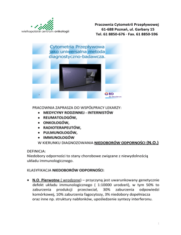 Pracownia Cytometrii Przepływowej 61-688 Poznań, ul. Garbary 15 Tel. 61 8850-676 · Fax. 61 8850-596 Cytometria Przepływowa jako uniwersalna metoda diagnostyczno-badawcza. 2 PRACOWNIA ZAPRASZA DO WSPÓŁPRACY LEKARZY: MEDYCYNY RODZINNEJ - INTERNISTÓW REUMATOLOGÓW, ONKOLOGÓW, RADIOTERAPEUTÓW, PULMUNOLOGÓW, IMMUNOLOGÓW W KIERUNKU DIAGNOZOWANIA NIEDOBORÓW ODPORNOŚCI (N.O.) DEFINICJA: Niedobory odporności to stany chorobowe związane z niewydolnością układu immunologicznego. KLASYFIKACJA NIEDOBORÓW ODPORNOŚCI: N.O. Pierwotne ( wrodzone) – przyczyną jest uwarunkowany genetycznie defekt układu immunologicznego ( 1:10000 urodzeń), w tym 50% to zaburzenia produkcji przeciwciał, 30% zaburzenia odpowiedzi komórkowej, 10% zaburzenia fagocytozy, 3% niedobory dopełniacza oraz inne np. struktury nabłonków, upośledzenie syntezy interferonu. 1 N.O. Wtórne (nabyte) - stanowią większość badanych przypadków. Spowodowane są działaniem czynników zewnętrznych lub chorobami towarzyszącymi. Występują w niedożywieniu, w zakażeniach ( Odra, HIV, CMV, gruźlica, malaria itd.), w leczeniu immunosupresyjnym i cytotoksycznym, w przebiegu niewydolności nerek, wątroby, przewlekłych infekcji, po przeszczepach narządów, w nowotworach, chorobach autoimmunologicznych (takich jak: cukrzyca, zapalenie tarczycy, RZS , sarkoidoza itd.),w okresie ciąży, w wieku podeszłym, po urazach ( np. oparzeniach), w alkoholizmie, zespole nerczycowym, w używaniu narkotyków, w chorobach nowotworowych, po splenektomii i po narażeniu na promieniowanie jonizujące. OBRAZ KLINICZNY Zmniejszona odporność objawia się klinicznie pod postacią częstych, przewlekłych i nawracających zakażeń lub rzadziej autoimmunizacji. Charakterystyczne cechy tych zakażeń to: długotrwałe, trudno poddające się leczeniu, nawracające infekcje głównie układu oddechowego, moczowego i skóry. Objawy sugerujące zaburzenia odporności Nawracające zakażenia dróg oddechowych w ciągu roku Dwa lub więcej zakażenia zatok w ciągu roku Powikłania pooperacyjne np. niegojące się rany Ponad 2-miesięczna antybiotykoterapia bez wyraźnej poprawy Dwa lub więcej zapaleń płuc w ciągu roku Nawracające ropnie skórne lub narządowe Przewlekająca się grzybica Dwa lub więcej ciężkich zakażenia tkanek i narządów Nawracające zakażenia układu moczowego po wykluczeniu innych przyczyn 2 Diagnostyka niedoborów odporności 1. Badanie podmiotowe ( wywiad rodzinny) 2. Wykonanie podstawowych badań laboratoryjnych ( morfologia) 3. Analiza poszczególnych elementów układu immunologicznego - zarówno swoistych, nieswoistych, komórkowych oraz humoralnych. W codziennej rutynowej diagnostyce klinicznej w Pracowni Cytometrii wykonuje się badania z zakresu monitorowania chorób rozrostowych układu krwiotwórczego, autoimmunologicznych, nabytych niedoborów odpornościowych (w tym monitorowanie efektów leczenia w AIDS), wykrywanie niekorzystnych czynników rokowniczych np. ekspresji a/g CD38, CD69 – których obecność na powierzchni komórek białaczkowych może przemawiać za szybkim postępem choroby. ANALIZA WTÓRNYCH NIEDOBORÓW ODPORNOŚCI METODĄ CYTOMETRII PRZEPŁYWOWEJ: Ocena swoistej odporności humoralnej - polega na ocenie odsetka i wartości bezwzględniej krążących limfocytów B ( CD19+, CD20+, CD19+CD5+) Ocena swoistej odporności komórkowej - polega na ocenie odsetka i wartości bezwzględnej krążących limfocytów T ( CD3+, Th CD4+, Tc CD8+) i ocenie jakościowej markerów aktywacji: ekspresji powierzchniowej MHC II (HLA DR+), CD25+ (receptor interleukiny 2 IL-2R), CD69, CD71 ( receptor dla transferyny). Ocena nieswoistej odporności komórkowej - polega na ocenie odsetka i wartości bezwzględnych krążących komórek żernych – komórek NK ( CD3-/CD16+CD56+). 3 Dotyczy wtórnych niedoborów odporności w leczeniu: AIDS – polega na ocenie bezwzględnej liczby limfocytów T (CD4+, CD8+) i stosunku limf. CD4+/CD8+ w celu oceny odpowiedzi układu immunologicznego na leczenie przeciwwirusowe (wartość normalna u zdrowego >1). SARKOIDOZY – polega na ocenie popłuczyn pęcherzykowo oskrzelikowych (zmiana zawartości z makrofagów – ok. 80% na limfocyty z przewagą limf. CD4) REUMATOIDALNEGO ZAPALENIA STAWÓW, ZAPALENIA TĘCZÓWKI, CUKRZYCY TYPU I- polega na ocenie wzrostu ekspresji markerów aktywacji (CD25, CD69, CD71) CHORÓB NOWOTWOROWYCH – polega na analizie wzrostu odsetka komórek NK aktywowanych limfocytów T, oraz spadku ilości komórek CD4 wraz z odwróceniem stosunku CD4/CD8 może korelować z gorszym rokowaniem i naciekającym charakterem zmian. IMMUNOSUPRESJI - po przeszczepach gdy niedobór odporności polega na utrzymującym się (powyżej 1 m-ca od wykonanego zabiegu) niskim poziomie podstawowych populacji komórek T - CD3, CD4, CD8 ( poniżej 50%). Dotyczy wtórnych niedoborów odporności w okresie ciąży: OKRES CIĄŻY niedobór odporności może manifestować się zwiększonym odsetkiem komórek NK i koekspresją a/g CD5+CD19+ (do 10%). CENNIK BADAŃ 1. Stosunek CD4/CD8 – 80 PLN ( w przebiegu zakażenia wirusem HIV) 2. Panel podstawowy – 100 PLN ( w zaburzeniach odporności i niepłodności) 3. Panel poszerzony – 150 PLN ( w choróbkach nowotworowych, w tym chłoniakach i białaczkach) Uwaga: do oceny odsetka limfocytów konieczne jest wykonanie badania morfologii krwi w cenie: 8,- PLN 4