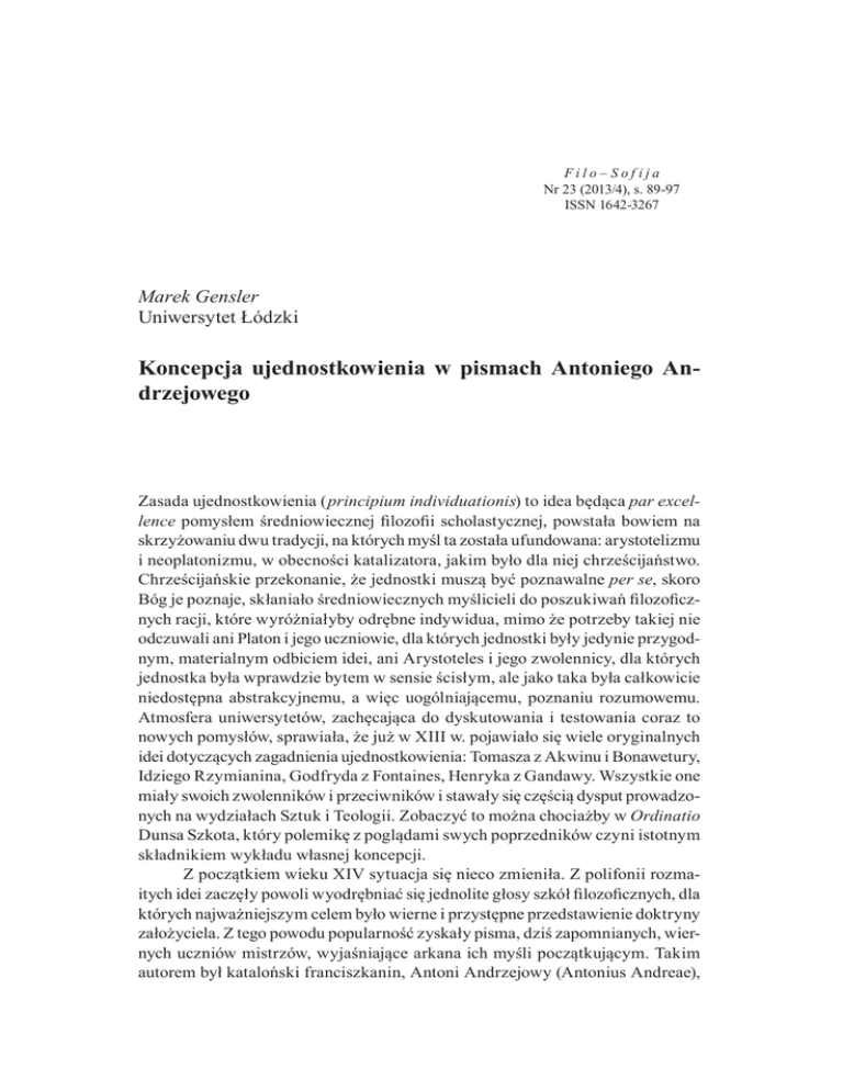 Filo–Sofija Nr 23 (2013/4), s. 89-97 ISSN 1642-3267 Marek Gensler Uniwersytet Łódzki Koncepcja ujednostkowienia w pismach Antoniego Andrzejowego Zasada ujednostkowienia (principium individuationis) to idea będąca par excellence pomysłem średniowiecznej filozofii scholastycznej, powstała bowiem na skrzyżowaniu dwu tradycji, na których myśl ta została ufundowana: arystotelizmu i neoplatonizmu, w obecności katalizatora, jakim było dla niej chrześcijaństwo. Chrześcijańskie przekonanie, że jednostki muszą być poznawalne per se, skoro Bóg je poznaje, skłaniało średniowiecznych myślicieli do poszukiwań filozoficznych racji, które wyróżniałyby odrębne indywidua, mimo że potrzeby takiej nie odczuwali ani Platon i jego uczniowie, dla których jednostki były jedynie przygodnym, materialnym odbiciem idei, ani Arystoteles i jego zwolennicy, dla których jednostka była wprawdzie bytem w sensie ścisłym, ale jako taka była całkowicie niedostępna abstrakcyjnemu, a więc uogólniającemu, poznaniu rozumowemu. Atmosfera uniwersytetów, zachęcająca do dyskutowania i testowania coraz to nowych pomysłów, sprawiała, że już w XIII w. pojawiało się wiele oryginalnych idei dotyczących zagadnienia ujednostkowienia: Tomasza z Akwinu i Bonawetury, Idziego Rzymianina, Godfryda z Fontaines, Henryka z Gandawy. Wszystkie one miały swoich zwolenników i przeciwników i stawały się częścią dysput prowadzonych na wydziałach Sztuk i Teologii. Zobaczyć to można chociażby w Ordinatio Dunsa Szkota, który polemikę z poglądami swych poprzedników czyni istotnym składnikiem wykładu własnej koncepcji. Z początkiem wieku XIV sytuacja się nieco zmieniła. Z polifonii rozmaitych idei zaczęły powoli wyodrębniać się jednolite głosy szkół filozoficznych, dla których najważniejszym celem było wierne i przystępne przedstawienie doktryny założyciela. Z tego powodu popularność zyskały pisma, dziś zapomnianych, wiernych uczniów mistrzów, wyjaśniające arkana ich myśli początkującym. Takim autorem był kataloński franciszkanin, Antoni Andrzejowy (Antonius Andreae), 90 MAREK GENSLER jeden z bezpośrednich uczniów Dunsa Szkota z czasu jego paryskiej regencji. Dwa jego teksty przez ponad dwieście lat cieszyły się wielkim uznaniem jako swego rodzaju podręczniki szkotyzmu dla początkujących, stanowiły bowiem wykład podstaw metafizyki i filozofii przyrody w duchu Doktora Subtelnego, zwracając szczególną uwagę na charakterystyczne rysy jego doktryny, w tym jego koncepcję indywiduacji. Problem zasady ujednostkowienia w filozofii Antoniego Andrzejowego nie był dotychczas szerzej omawiany przez historyków filozofii, choć sama postać Antoniego została w ostatnich dekadach wydobyta na światło dzienne, w dużej mierze za sprawą jego krajan i konfratrów1. Krótkie jej omówienie, na podstawie materiału z traktatu De tribus principiis naturae zamieścili w swojej historii filozofii hiszpańskiej bracia Carreras y Artau2. W niniejszym studium chciałbym rozszerzyć podstawę źródłową o drugie z najważniejszych dzieł Antoniego, jego komentarz do Metafizyki Arystotelesa, a właściwie o zawarte w nim kwestie, które okazały się na tyle popularniejsze od samego komentarza ad litteram, że wydzielono je z niego jeszcze w XIV w. Autentyczność obydwu dzieł jest bezsporna, bardziej problematyczne jest datowanie. Wiadomo jednak, że De tribus principiis jest wcześniejsze, może zatem zawierać więcej treści pochodzących z zapamiętanych przez autora wykładów Dunsa Szkota. Komentarz do Metafizyki bardziej wzoruje się na kwestiach Szkota do tego dzieła i … komentarzu Tomasza z Akwinu3. Problem ujednostkowienia w De tribus principiis naturae W De tribus principiis naturae problem ujednostkowienia poruszany jest w kilku kwestiach, w żadnej nie stanowi jednak naczelnego zagadnienia. Tezy, na podstawie których go omawiam, pochodzą z kwestii należących do artykułów poświęconych kolejno materii, formie i złożeniu: Utrum in rebus compositis ex materia et forma materia sit aliquid pertinens essentialiter ad rationem quidditatis specificae (I. 5), Utrum formalis distinctio organicarum partium animalis sit propter formas substantiales specifice ac realiter distinctas (II. 4), Utrum in quidditate formae accidentalis sit dare veros gradus intrinsecos essentiales secundum quos ipsa possit suscipere divisionem secundum magis et minus (II. 5), Utrum in rebus naturalibus generabilibus et corruptibilibus ipsum compositum ex materia et 1 Renesans zainteresowania Antonim Andrzejowym datuje się od artykułu P. Marti de Barcelona, Fra Antoni Andreu, O.M., doctor dulcifluus, „Criterion”, 1929, V, s. 321-346, natomiast autorem pierwszego obszerniejszego studium doktrynalnego poświęconego Antoniemu był C. Bérubé, Antoine André, témoin et interprete de Scot, „Antonianum” LIV (1979), s. 387-414. 2 T. i J. Carreras y Artau, Historia de la filosofia espanola, Madrid 1943, t. 2, s. 470-471. Cf. G. Pini, Scotistic Aristotelianism: Antonius Andreas’ “Expositio” and “Quaestiones” on the Metaphysics, [w:] Atti del Congresso Scotistico Internazionale, Roma 1993, Roma 1995, s. 380. 3 KONCEPCJA UJEDNOSTKOWIENIA W PISMACH ANTONIEGO ANDRZEJOWEGO 91 forma per se primo terminet generationis actum. W komentarzu do Metafizyki, który jest dziełem bardzo obszernym, znajduje się nawet jedna, bardzo krótka kwestia poświęcona specjalnie zasadzie ujednostkowienia: Utrum materia quae est altera pars compositi sit causa individuationis (V. 5), a pobocznie omawiane jest ono w siedmiu innych kwestiach: Utrum omnes actus et generationes sunt circa singularia (I. 7), Utrum singularitas sit ratio obiectiva sensus (I. 8), Utrum ens et unum significent eandem naturam (IV. 3), Utrum secunda divisio unius quae dicitur logica sit conveniens (V. 6), Utrum materia sit ens (VII. 6), Utrum in rebus naturalibus materia sit pars quidditatis rei specifica