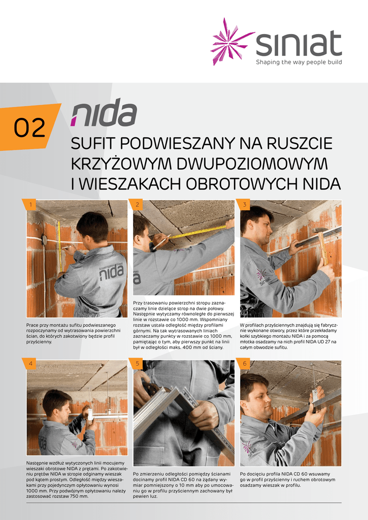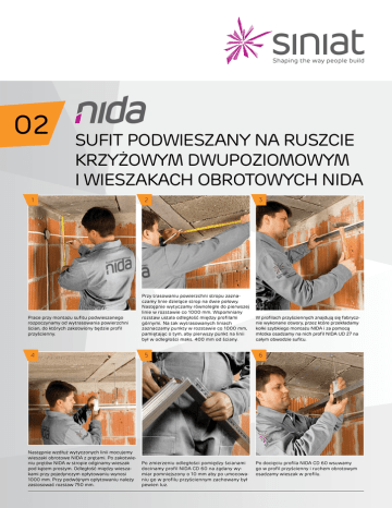 02 Sufit podwieszany na ruszcie krzyżowym dwupoziomowym i wieszakach obrotowych NIDA 1 Prace przy montażu sufitu podwieszanego rozpoczynamy od wytrasowania powierzchni ścian, do których zakotwiony będzie profil przyścienny. 4 Następnie wzdłuż wytyczonych linii mocujemy wieszaki obrotowe NIDA z prętami. Po zakotwieniu prętów NIDA w stropie odginamy wieszak pod kątem prostym. Odległość między wieszakami przy pojedynczym opłytowaniu wynosi 1000 mm. Przy podwójnym opłytowaniu należy zastosować rozstaw 750 mm. 2 Przy trasowaniu powierzchni stropu zaznaczamy linie dzielące strop na dwie połowy. Następnie wytyczamy równoległe do pierwszej linie w rozstawie co 1000 mm. Wspomniany rozstaw ustala odległość między profilami górnymi. Na tak wytrasowanych liniach zaznaczamy punkty w rozstawie co 1000 mm, pamiętając o tym, aby pierwszy punkt na linii był w odległości maks. 400 mm od ściany. 5 Po zmierzeniu odległości pomiędzy ścianami docinamy profil NIDA CD 60 na żądany wymiar pomniejszony o 10 mm aby po umocowaniu go w profilu przyściennym zachowany był pewien luz. 3 W profilach przyściennych znajdują się fabrycznie wykonane otwory, przez które przekładamy kołki szybkiego montażu NIDA i za pomocą młotka osadzamy na nich profil NIDA UD 27 na całym obwodzie sufitu. 6 Po docięciu profila NIDA CD 60 wsuwamy go w profil przyścienny i ruchem obrotowym osadzamy wieszak w profilu. 7 Rozstaw pomiędzy profilami warstwy dolnej wynosi 400 mm. Pamiętajmy, aby profile warstwy dolnej równoległe do ściany były od niej oddalone na maks. odległość 200 mm. Odległość środka drugiego profila od ściany wynosi 400 mm. 10 Przy rozstawie 400 mm pomiędzy profilami płytę przykręcamy krawędzią wzdłużną, pokrytą kartonem, w kierunku prostopadłym do rusztu. Przy montażu płyty do rusztu sufitowego należy pamiętać o pozostawieniu szczeliny ok. 5 mm pomiędzy krawędziami płyty i ścianą. Rozstawy pomiędzy blachowkrętami NIDA wynoszą 200 mm. Wszystkie krótsze krawędzie płyty o dł. 1200 mm z logotypem SYNIATM powinny łączyć się na profilu NIDA CD 60. Płytę przykręcamy tylko do profili NIDA CD 60. Płyty mocujemy z wzajemnym przesunięciem styków poprzecznych o min. 400 mm. 8 9 Po zamocowaniu profili NIDA CD 60 poziomujemy ruszt za pomocą poziomnicy. Wysokość podwieszenia regulujemy za pomocą sprężynki wieszaka mocowanego obrotowo NIDA CD 60. 11 Do wykonania powierzchni sufitu s tosujemy płyty gipsowe SYNIATM (poproś w punkcie sprzedaży o broszurkę dot. płyt gipsowych SYNIATM) o grubości 12,5 mm. Pierwszą płytę gipsową przycinamy na długość np. 800 mm (lub wielokrotność 400 mm) i przygotowujemy do montażu na ruszcie sufitowym. 12 Po przykręceniu wszystkich płyt do rusztu sufitowego możemy przystąpić do wykonywania spoin pomiędzy płytami (więcej w ulotce o spoinowaniu płyt gipsowych). Po zaspoinowaniu połączeń pomiędzy płytami gipsowymi powierzchnia sufitu jest przygotowana do ostatecznego wykończenia: malowania, tapetowania, nakładania tynków dekoracyjnych, itp. Gwarantujemy uzyskanie wysokiej jakości wykończenia przy zastosowaniu elementów systemu NIDA. Zużycie materiałów na 1 m2 sufitu podwieszanego na ruszcie krzyżowym dwupoziomowym: Materiał * płyta gipsowa NIDA lub SYNIATM Ilość j.m. 1 m2 profil główny NIDA CD 60 3,8 m profil przyścienny NIDA UD 27 0,6 m wieszak mocowany obrotowo NIDA WO 60 2,2 szt. pręt mocujący NIDA 2,2 szt. łącznik krzyżowy NIDA LK 60 2,1 szt. łącznik wzdłużny NIDA LW 60 0,5 szt. blachowkręty NIDA 3,5 x 25 19 szt. kołki rozporowe NIDA 0,6 szt. kołek rozporowy metalowy NIDA 2,2 szt. taśma zbrojąca NIDA 1,2 m gips szpachlowy NIDA Start 0,2 kg gips szpachlowy NIDA Finisz 0,1 kg Cena u Twojego Dystrybutora SINIAT SP. Z O.O. ul. Przecławska 8 03-879 Warszawa Info NIDA 801 11 44 77 www.siniat.pl * normy zużycia nie uwzględniają strat materiałowych Przedstawione informacje i rozwiązania zostały opracowane w oparciu o aktualną wiedzę techniczną, badania w Centrum Rozwoju Technicznego Siniat i zewnętrznych jednostkach badawczych oraz wieloletnie doświadczenie i praktykę w montażu systemów suchej zabudowy. Siniat Sp. z o.o. nie ma bezpośredniego wpływu na projektowanie, warunki placu budowy, a także na sposób wykonywania prac. W związku z powyższym zastrzegamy, że są to wskazówki o charakterze ogólnym, których zastosowanie w praktyce nie może stanowić podstawy do jakichkolwiek roszczeń. Siniat Sp. z o.o. nie odpowiada za błędy powstałe w druku.