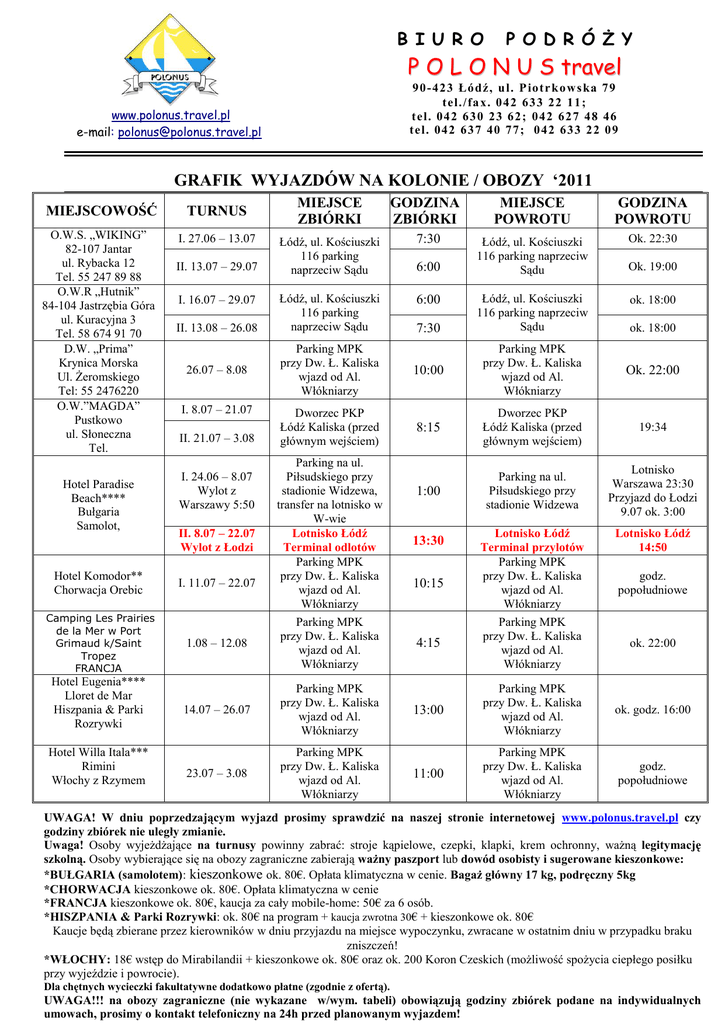 B I U R O P O D R Ó Ż Y P O L O N U S travel 9 0 - 4 2 3 Łó dź, u l. P io tr k o w s ka 7 9 tel. /fa x. 0 4 2 6 3 3 2 2 1 1 ; tel. 0 4 2 6 3 0 2 3 6 2 ; 0 4 2 6 2 7 4 8 4 6 tel. 0 4 2 6 3 7 4 0 7 7 ; 0 4 2 6 3 3 2 2 0 9 www.polonus.travel.pl e-mail: [email protected] GRAFIK WYJAZDÓW NA KOLONIE / OBOZY ‘2011 MIEJSCOWOŚĆ TURNUS O.W.S. „WIKING” 82-107 Jantar ul. Rybacka 12 Tel. 55 247 89 88 O.W.R „Hutnik” 84-104 Jastrzębia Góra ul. Kuracyjna 3 Tel. 58 674 91 70 D.W. „Prima” Krynica Morska Ul. Żeromskiego Tel: 55 2476220 O.W.”MAGDA” Pustkowo ul. Słoneczna Tel. I. 27.06 – 13.07 Hotel Paradise Beach**** Bułgaria Samolot, II. 13.07 – 29.07 I. 16.07 – 29.07 II. 13.08 – 26.08 26.07 – 8.08 I. 8.07 – 21.07 II. 21.07 – 3.08 I. 24.06 – 8.07 Wylot z Warszawy 5:50 II. 8.07 – 22.07 Wylot z Łodzi Hotel Komodor** Chorwacja Orebic I. 11.07 – 22.07 Camping Les Prairies de la Mer w Port Grimaud k/Saint Tropez FRANCJA 1.08 – 12.08 Hotel Eugenia**** Lloret de Mar Hiszpania & Parki Rozrywki Hotel Willa Itala*** Rimini Włochy z Rzymem MIEJSCE ZBIÓRKI GODZINA ZBIÓRKI MIEJSCE POWROTU GODZINA POWROTU Łódź, ul. Kościuszki 116 parking naprzeciw Sądu 7:30 Łódź, ul. Kościuszki 116 parking naprzeciw Sądu Ok. 22:30 Łódź, ul. Kościuszki 116 parking naprzeciw Sądu 6:00 Łódź, ul. Kościuszki 116 parking naprzeciw Sądu ok. 18:00 Parking MPK przy Dw. Ł. Kaliska wjazd od Al. Włókniarzy Dworzec PKP Łódź Kaliska (przed głównym wejściem) Parking na ul. Piłsudskiego przy stadionie Widzewa, transfer na lotnisko w W-wie Lotnisko Łódź Terminal odlotów Parking MPK przy Dw. Ł. Kaliska wjazd od Al. Włókniarzy Parking MPK przy Dw. Ł. Kaliska wjazd od Al. Włókniarzy 14.07 – 26.07 Parking MPK przy Dw. Ł. Kaliska wjazd od Al. Włókniarzy 23.07 – 3.08 Parking MPK przy Dw. Ł. Kaliska wjazd od Al. Włókniarzy 6:00 7:30 Ok. 19:00 ok. 18:00 10:00 Parking MPK przy Dw. Ł. Kaliska wjazd od Al. Włókniarzy Ok. 22:00 8:15 Dworzec PKP Łódź Kaliska (przed głównym wejściem) 19:34 1:00 Parking na ul. Piłsudskiego przy stadionie Widzewa Lotnisko Warszawa 23:30 Przyjazd do Łodzi 9.07 ok. 3:00 13:30 10:15 4:15 Lotnisko Łódź Terminal przylotów Parking MPK przy Dw. Ł. Kaliska wjazd od Al. Włókniarzy Parking MPK przy Dw. Ł. Kaliska wjazd od Al. Włókniarzy Lotnisko Łódź 14:50 godz. popołudniowe ok. 22:00 13:00 Parking MPK przy Dw. Ł. Kaliska wjazd od Al. Włókniarzy ok. godz. 16:00 11:00 Parking MPK przy Dw. Ł. Kaliska wjazd od Al. Włókniarzy godz. popołudniowe UWAGA! W dniu poprzedzającym wyjazd prosimy sprawdzić na naszej stronie internetowej www.polonus.travel.pl czy godziny zbiórek nie uległy zmianie. Uwaga! Osoby wyjeżdżające na turnusy powinny zabrać: stroje kąpielowe, czepki, klapki, krem ochronny, ważną legitymację szkolną. Osoby wybierające się na obozy zagraniczne zabierają ważny paszport lub dowód osobisty i sugerowane kieszonkowe: *BUŁGARIA (samolotem): kieszonkowe ok. 80€. Opłata klimatyczna w cenie. Bagaż główny 17 kg, podręczny 5kg *CHORWACJA kieszonkowe ok. 80€. Opłata klimatyczna w cenie *FRANCJA kieszonkowe ok. 80€, kaucja za cały mobile-home: 50€ za 6 osób. *HISZPANIA & Parki Rozrywki: ok. 80€ na program + kaucja zwrotna 30€ + kieszonkowe ok. 80€ Kaucje będą zbierane przez kierowników w dniu przyjazdu na miejsce wypoczynku, zwracane w ostatnim dniu w przypadku braku zniszczeń! *WŁOCHY: 18€ wstęp do Mirabilandii + kieszonkowe ok. 80€ oraz ok. 200 Koron Czeskich (możliwość spożycia ciepłego posiłku przy wyjeździe i powrocie). Dla chętnych wycieczki fakultatywne dodatkowo płatne (zgodnie z ofertą). UWAGA!!! na obozy zagraniczne (nie wykazane w/wym. tabeli) obowiązują godziny zbiórek podane na indywidualnych umowach, prosimy o kontakt telefoniczny na 24h przed planowanym wyjazdem!