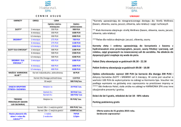 CENNIK USŁUG KARNETY ZŁOTY* SREBRNY* ZŁOTY DLA DWOJGA* SREBRNY DLA DWOJGA * WEJŚCIE HARMONIA KLUB** ZAJĘCIA GRUPOWE FITNESS+ SIŁOWNIA TRENING PERSONALNY (BASEN LUB SIŁOWNIA) Nauka pływania dla dzieci + relax dla rodzica*** OKRES UWAGA! CENA 3 miesiące Opłata ratalnamiesięczna 350 PLN Opłata jednorazowa 900 PLN 6 miesięcy 350 PLN 1600 PLN 12 miesięcy 350 PLN 3000 PLN 3 miesiące 275 PLN 700 PLN 6 miesięcy 275 PLN 1100 PLN 12 miesięcy 275 PLN 2000 PLN 3 miesiące 500 PLN 1300 PLN 6 miesięcy 500 PLN 2300 PLN 12 miesięcy 500 PLN 4200 PLN 3 miesiące 400 PLN 1000 PLN 6 miesięcy 400 PLN 1800 PLN 12 miesięcy 400 PLN 3200 PLN Karnet indywidualny jednodniowy 60 PLN Karnet Dla Dwojga jednodniowy 110 PLN 10 wejść 500 PLN/1os. Wejście 1x 25 PLN/ 1os. Karnet 4 x Karnet 8 x 90 PLN/ 1os. 160 PLN/ 1os Wejście 1x 95 PLN/ 1os. *Karnety upoważniają do nieograniczonego dostępu do: Strefy Wellness (basen, siłownia, sauna, jacuzzi, siłownia, sala relaksu) i zajęć ruchowych ** Klub Harmonia obejmuje: strefę Wellness (basen, siłownia, sauna, jacuzzi, siłownia, sala relaksu) ***Relax dla rodzica obejmuje: jacuzzi, siłownię, sauny. Karnety złoty i srebrny upoważniają do korzystania z basenu z hydromasażem oraz przeciwprądem, jacuzzi, sauny fińskiej i parowej, sali relaksu, zajęć grupowych na nowoczesnej sali do aerobiku. Na obiekcie do dyspozycji gości znajduje się woda do picia. Pakiet Złoty obowiązuje w godzinach 06.30 - 22.30 Pakiet Srebrny obowiązuję w godzinach 09.00 - 18.00 Opłata członkowska wynosi 100 PLN (w karnecie dla dwojga 200 PLN) i dotyczy Karnetów ZŁOTY i SREBRNY od 3 miesięcy. W cenie jest voucher o wartości 100 PLN do wykorzystania na zabiegi w Harmonia Spa. Voucher nie podlega wymianie na gotówkę oraz zaproszenia na prestiżowe imprezy w **** Ibb Andersia Hotel, stała zniżka na zabiegi w HARMONIA SPA oraz inne okazjonalne prezenty i gratisy. Dzieci do lat 5 gratis, młodzież do lat 18 - 50% rabatu Parking podziemny gratis Karnet 10x + 1 wejście gratis! 850 PLN/ 1os. Karnet 20x + 2 wejścia gratis! 1500PLN/1os. 1 rodzic 2 rodziców 75PLN 115pln Oferta ważna do 31 grudnia 2015 roku. Serdecznie zapraszamy!