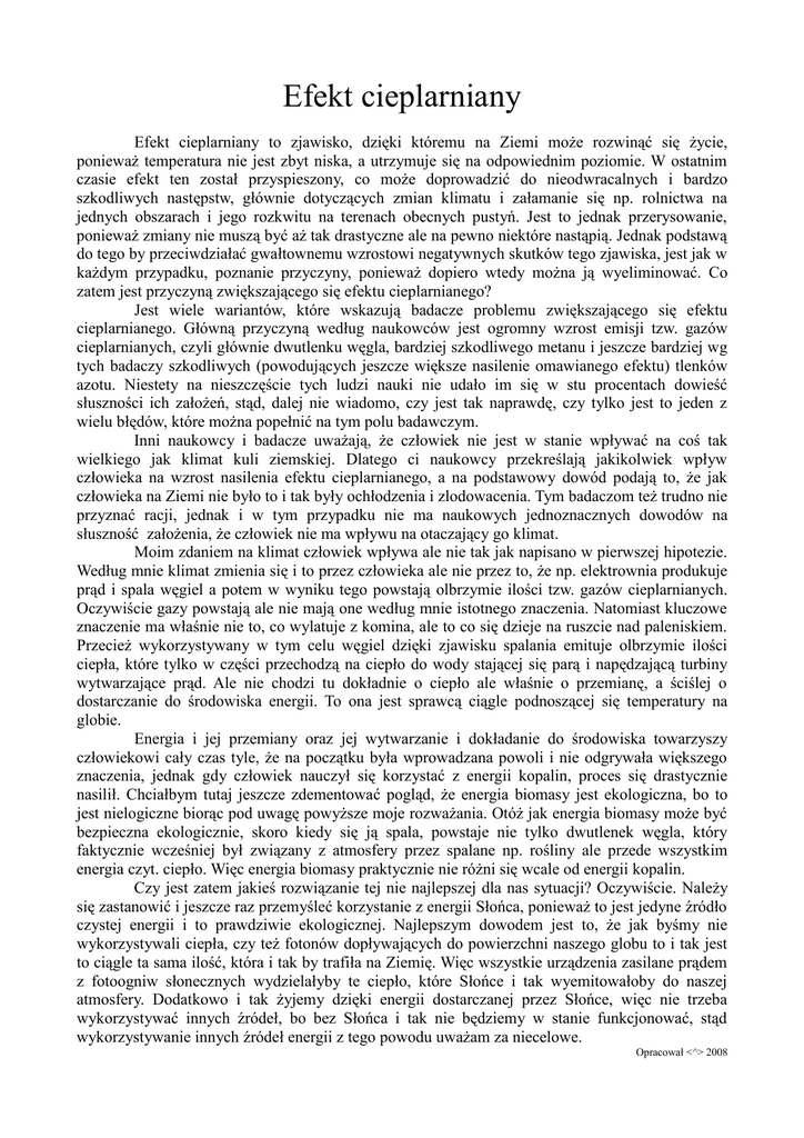 Efekt cieplarniany Efekt cieplarniany to zjawisko, dzięki któremu na Ziemi moŜe rozwinąć się Ŝycie, poniewaŜ temperatura nie jest zbyt niska, a utrzymuje się na odpowiednim poziomie. W ostatnim czasie efekt ten został przyspieszony, co moŜe doprowadzić do nieodwracalnych i bardzo szkodliwych następstw, głównie dotyczących zmian klimatu i załamanie się np. rolnictwa na jednych obszarach i jego rozkwitu na terenach obecnych pustyń. Jest to jednak przerysowanie, poniewaŜ zmiany nie muszą być aŜ tak drastyczne ale na pewno niektóre nastąpią. Jednak podstawą do tego by przeciwdziałać gwałtownemu wzrostowi negatywnych skutków tego zjawiska, jest jak w kaŜdym przypadku, poznanie przyczyny, poniewaŜ dopiero wtedy moŜna ją wyeliminować. Co zatem jest przyczyną zwiększającego się efektu cieplarnianego? Jest wiele wariantów, które wskazują badacze problemu zwiększającego się efektu cieplarnianego. Główną przyczyną według naukowców jest ogromny wzrost emisji tzw. gazów cieplarnianych, czyli głównie dwutlenku węgla, bardziej szkodliwego metanu i jeszcze bardziej wg tych badaczy szkodliwych (powodujących jeszcze większe nasilenie omawianego efektu) tlenków azotu. Niestety na nieszczęście tych ludzi nauki nie udało im się w stu procentach dowieść słuszności ich załoŜeń, stąd, dalej nie wiadomo, czy jest tak naprawdę, czy tylko jest to jeden z wielu błędów, które moŜna popełnić na tym polu badawczym. Inni naukowcy i badacze uwaŜają, Ŝe człowiek nie jest w stanie wpływać na coś tak wielkiego jak klimat kuli ziemskiej. Dlatego ci naukowcy przekreślają jakikolwiek wpływ człowieka na wzrost nasilenia efektu cieplarnianego, a na podstawowy dowód podają to, Ŝe jak człowieka na Ziemi nie było to i tak były ochłodzenia i zlodowacenia. Tym badaczom teŜ trudno nie przyznać racji, jednak i w tym przypadku nie ma naukowych jednoznacznych dowodów na słuszność załoŜenia, Ŝe człowiek nie ma wpływu na otaczający go klimat. Moim zdaniem na klimat człowiek wpływa ale nie tak jak napisano w pierwszej hipotezie. Według mnie klimat zmienia się i to przez człowieka ale nie przez to, Ŝe np. elektrownia produkuje prąd i spala węgiel a potem w wyniku tego powstają olbrzymie ilości tzw. gazów cieplarnianych. Oczywiście gazy powstają ale nie mają one według mnie istotnego znaczenia. Natomiast kluczowe znaczenie ma właśnie nie to, co wylatuje z komina, ale to co się dzieje na ruszcie nad paleniskiem. PrzecieŜ wykorzystywany w tym celu węgiel dzięki zjawisku spalania emituje olbrzymie ilości ciepła, które tylko w części przechodzą na ciepło do wody stającej się parą i napędzającą turbiny wytwarzające prąd. Ale nie chodzi tu dokładnie o ciepło ale właśnie o przemianę, a ściślej o dostarczanie do środowiska energii. To ona jest sprawcą ciągle podnoszącej się temperatury na globie. Energia i jej przemiany oraz jej wytwarzanie i dokładanie do środowiska towarzyszy człowiekowi cały czas tyle, Ŝe na początku była wprowadzana powoli i nie odgrywała większego znaczenia, jednak gdy człowiek nauczył się korzystać z energii kopalin, proces się drastycznie nasilił. Chciałbym tutaj jeszcze zdementować pogląd, Ŝe energia biomasy jest ekologiczna, bo to jest nielogiczne biorąc pod uwagę powyŜsze moje rozwaŜania. OtóŜ jak energia biomasy moŜe być bezpieczna ekologicznie, skoro kiedy się ją spala, powstaje nie tylko dwutlenek węgla, który faktycznie wcześniej był związany z atmosfery przez spalane np. rośliny ale przede wszystkim energia czyt. ciepło. Więc energia biomasy praktycznie nie róŜni się wcale od energii kopalin. Czy jest zatem jakieś rozwiązanie tej nie najlepszej dla nas sytuacji? Oczywiście. NaleŜy się zastanowić i jeszcze raz przemyśleć korzystanie z energii Słońca, poniewaŜ to jest jedyne źródło czystej energii i to prawdziwie ekologicznej. Najlepszym dowodem jest to, Ŝe jak byśmy nie wykorzystywali ciepła, czy teŜ fotonów dopływających do powierzchni naszego globu to i tak jest to ciągle ta sama ilość, która i tak by trafiła na Ziemię. Więc wszystkie urządzenia zasilane prądem z fotoogniw słonecznych wydzielałyby te ciepło, które Słońce i tak wyemitowałoby do naszej atmosfery. Dodatkowo i tak Ŝyjemy dzięki energii dostarczanej przez Słońce, więc nie trzeba wykorzystywać innych źródeł, bo bez Słońca i tak nie będziemy w stanie funkcjonować, stąd wykorzystywanie innych źródeł energii z tego powodu uwaŜam za niecelowe. Opracował <^> 2008