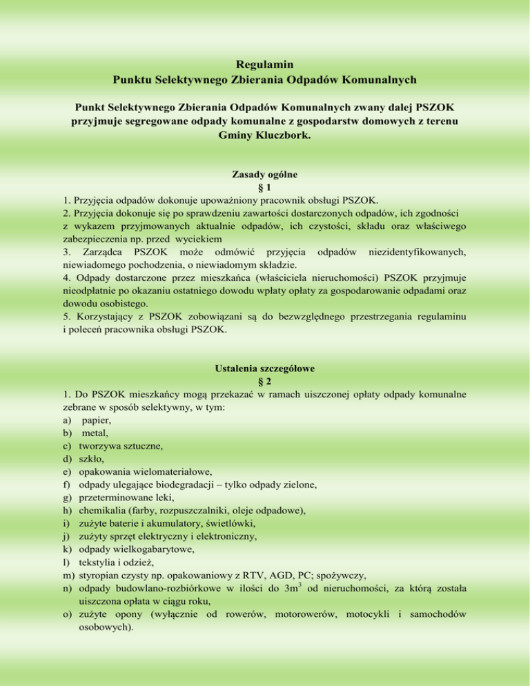 Regulamin Punktu Selektywnego Zbierania Odpadów Komunalnych Punkt Selektywnego Zbierania Odpadów Komunalnych zwany dalej PSZOK przyjmuje segregowane odpady komunalne z gospodarstw domowych z terenu Gminy Kluczbork. Zasady ogólne §1 1. Przyjęcia odpadów dokonuje upoważniony pracownik obsługi PSZOK. 2. Przyjęcia dokonuje się po sprawdzeniu zawartości dostarczonych odpadów, ich zgodności z wykazem przyjmowanych aktualnie odpadów, ich czystości, składu oraz właściwego zabezpieczenia np. przed wyciekiem 3. Zarządca PSZOK może odmówić przyjęcia odpadów niezidentyfikowanych, niewiadomego pochodzenia, o niewiadomym składzie. 4. Odpady dostarczone przez mieszkańca (właściciela nieruchomości) PSZOK przyjmuje nieodpłatnie po okazaniu ostatniego dowodu wpłaty opłaty za gospodarowanie odpadami oraz dowodu osobistego. 5. Korzystający z PSZOK zobowiązani są do bezwzględnego przestrzegania regulaminu i poleceń pracownika obsługi PSZOK. Ustalenia szczegółowe §2 1. Do PSZOK mieszkańcy mogą przekazać w ramach uiszczonej opłaty odpady komunalne zebrane w sposób selektywny, w tym: a) papier, b) metal, c) tworzywa sztuczne, d) szkło, e) opakowania wielomateriałowe, f) odpady ulegające biodegradacji – tylko odpady zielone, g) przeterminowane leki, h) chemikalia (farby, rozpuszczalniki, oleje odpadowe), i) zużyte baterie i akumulatory, świetlówki, j) zużyty sprzęt elektryczny i elektroniczny, k) odpady wielkogabarytowe, l) tekstylia i odzież, m) styropian czysty np. opakowaniowy z RTV, AGD, PC; spożywczy, n) odpady budowlano-rozbiórkowe w ilości do 3m3 od nieruchomości, za którą została uiszczona opłata w ciągu roku, o) zużyte opony (wyłącznie od rowerów, motorowerów, motocykli i samochodów osobowych). 2. PSZOK przyjmuje odpady od poniedziałku do piątku w godzinach od 800 do 1800 oraz w pierwszą sobotę miesiąca w godzinach od 800 do 1300. 3. PSZOK przyjmuje odpady tylko od właścicieli nieruchomości z terenu gminy Kluczbork po okazaniu dowodu wniesienia ostatniej opłaty za gospodarowanie odpadami komunalnymi oraz dowodu osobistego. 4.Transport odpadów do PSZOK mieszkańcy zapewniają we własnym zakresie i na własny koszt. 5. Odpady dostarczone do PSZOK muszą być posegregowane. 6. Dostarczone odpady nie mogą być zmieszane i zanieczyszczone innymi odpadami. 7. Odpady dostarczane do PSZOK należy umieszczać w pojemnikach, kontenerach lub innych urządzeniach przystosowanych do gromadzenia poszczególnych rodzajów odpadów odpowiednio oznakowanych ze wskazaniem rodzaju odpadów, które należy w nich umieszczać. 8. W przypadku dostarczenia odpadów wymienionych w ust. 1 w formie nieposegregowanej, dostarczający odpady jest zobowiązany do ich posortowania w PSZOK, jeżeli odmówi ich posortowania obsługa Punktu, może odmówić przyjęcia odpadów. 9. Osoba dostarczająca odpady do PSZOK zobowiązana jest umieścić je w odpowiednich kontenerach pod nadzorem pracownika. 10. Odpady niebezpieczne płynne (np. chemikalia, farby, rozpuszczalniki, oleje odpadowe) powinny znajdować się w oryginalnych opakowaniach producenta. Opakowania powinny posiadać etykiety i nie powinny być uszkodzone. 11. Do PSZOK przyjmowane są wyłącznie odpady wymienione w ust.1. 12. Do PSZOK nie są przyjmowane następujące rodzaje odpadów: a) odpady zawierające azbest, b) szyby i inne części samochodowe, c) szkło zbrojone i hartowane, d) materiały izolacyjne: wełna mineralna, papa, e) zmieszane odpady komunalne. 13. Dostarczający odpady zobowiązany jest do natychmiastowego zabrania odpadów w przypadku: a) stwierdzenia przez pracownika PSZOK, iż odpady dostarczone nie znajdują się na wykazie odpadów aktualnie przyjmowanych, b) stwierdzenia zanieczyszczeń i zabrudzeń w dostarczonych odpadach, c) stwierdzenia braku możliwości identyfikacji odpadów niebezpiecznych. Postanowienia końcowe §3 1. Wszelkie informacje o pracy PSZOK można uzyskać na miejscu od pracownika PSZOK lub pod numerem telefonu Urzędu Miejskiego w Kluczborku: 77/418-14-81 wew. 223 lub 228. 2. Skargi i wnioski przyjmowane są w Referacie Ochrony Środowiska i Leśnictwa Urzędu Miejskiego w Kluczborku. 3. Regulamin korzystania z PSZOK jest dostępny na stronie internetowej gminy www.kluczbork.eu w zakładce „Nowy system gospodarki odpadami.”