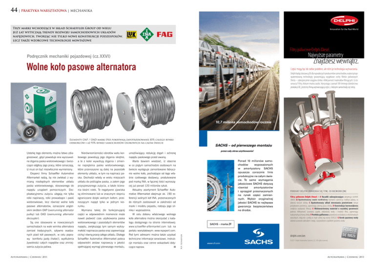 44 | PRAKTYKA WARSZTATOWA | MECHANIKA Trzy marki wchodzące w skład Schaeffler Group od wielu już lat wytyczają trendy rozwoju samochodowych układów napędowych, tworząc nie tylko nowe konstrukcje podzespołów, lecz także wzorcowe technologie montażowe Filtry paliwowe Delphi Diesel. Najwyższe parametry Podręcznik mechaniki pojazdowej (cz.XXVI) Znajdziesz wewnątrz. Wolne koło pasowe alternatora Części mogą być do siebie podobne, ale różni je technologia wytwarzania. Delphi będąc dostawcą OE dla największych producentów samochodów, wykorzystuje opatentowaną technologię gwarantującą wyjątkowe cechy filtrów paliwowych Diesla – zabezpieczenie osiągów silnika i efektywność materiałów filtrujących. Co to oznacza? Filtry, którym można zaufać. Korzystając z ponad 100-letniego dziedzictwa produkcji OE, jesteśmy firmą wytwarzającą części, z którymi samochody się rodzą rodzą. A 10,7 miliona samochodów rocznie B C Elementy OAP / OAD marki INA pokrywają zapotrzebowanie 85% całego rynku odbiorców i aż 95% rynku samochodów osobowych na całym świecie Usterkę tego elementu można łatwo zdia Nierównomierności obrotów wału kor gnozować, gdyż powoduje ona wyczuwal bowego powodują jego drgania skrętne, ne drgania paska wielorowkowego i świsz a te z kolei wywołują drgania i zmien Warto bowiem wiedzieć, iż obecnie czące odgłosy jego pracy, które oznaczają, ne naprężenia paska wielorowkowego, w co piątym samochodzie osobowym na iż musi on być niezwłocznie wymieniony. które przenoszone są dalej na pozostałe świecie występuje zamontowane fabrycz Eksperci firmy Schaeffler Automotive elementy układu, w tym na napinacz pa nie wolne koło, pochodzące od tego wła Aftermarket radzą, by nie zwlekać z wy ska. Dochodzi wtedy w wielu miejscach śnie czołowego dostawcy, produkowane mianą niezbędnych elementów układu układu do poślizgów paska, a zatem jego pod marką INA, w łącznej ilości wynoszą paska wielorowkowego, stosowanego do przyspieszonego zużycia, a także ściera cej już ponad 120 milionów sztuk. napędu urządzeń pomocniczych. Eks nia bieżni rolek. Te negatywne zjawiska Aktualny asortyment Schaeffler Auto ploatacyjnemu zużyciu ulegają nie tylko są eliminowane lub w znacznym stopniu motive Aftermarket obejmuje ok. 190 re rolki napinaczy, rolki prowadzące i paski ograniczane dzięki wolnym kołom, prze ferencji wolnych kół INA, przeznaczonych wielorowkowe, lecz również wolne koła noszącym napęd tylko w jednym kie do różnych zastosowań w zależności od pasowe alternatorów, oznaczane angiel runku. marki i modelu pojazdu, rodzaju jego sil przez cały okres użytkowania! umożliwiający redukcję drgań i ochronę E napędu paskowego przed awarią. skim skrótem OAP (overrunning alternator Wymiana takiej źle funkcjonującej pulley) lub OAD (overrunning alternator części w odpowiednim momencie może W celu doboru właściwego wolnego decoupler). Ponad 10 milionów samochodów wyposażonych w amortyzatory SACHS opuszcza corocznie linie produkcyjne na całym świecie. Te same wymagania jakościowe SACHS dotyczą również amortyzatorów i sprzęgieł przeznaczonych na rynek części zamiennych. Wybór oryginalnej jakości SACHS to najlepsza gwarancja bezpieczeństwa na drodze. nawet podwoić czas użytkowania paska koła alternatora można skorzystać z kata wielorowkowego i pozostałych elementów logu dostępnego na stronie internetowej: samochodach na wale wirnika alternatora napędu, zwiększając tym samym wytrzy www.schaeffler-aftermarket.com lub na zamiast tradycyjnych, sztywno osadza małość napinacza paska oraz zapewniając portalu warsztatowym: www.repxpert.com. nych piast kół pasowych, w celu popra cichą i równą pracę całego układu. Dlatego Pod tymi adresami można także uzyskać wy komfortu jazdy (hałas!), wydłużenia Schaeffler Automotive Aftermarket poleca techniczne informacje serwisowe, instruk żywotności całych napędów oraz zmniej odpowiedni zestaw naprawczy o jakości cje montażu oraz cenne wskazówki doty szenia zużycia paliwa. spełniającej wymogi pierwszego montażu, czące napraw. n Fot. Schaeffler nika i wyposażenia. Są one stosowane w nowoczesnych Autonaprawa | Czerwiec 2011 D SACHS – od pierwszego montażu G F PRODUKT DELPHI ODRÓŻNIA SIĘ T YM, CO NIEWIDOCZNE Filtry paliwowe Delphi Diesel // A A Nasadki zabezpieczające utrzymują czystość układu; B B Opatentowany zawór rozdzielczy zapewnia cyrkulację ciepłego paliwa, co ułatwia rozruch silnika; C Opatentowany układ sterowania powietrzem steruje przepływem powietrza, zapewniając płynną pracę silnika; D Konstrukcja harmonijkowa zwiększa wydajność filtracji; E Wielowarstwowy materiał o wysokiej sprawności podnosi efektywność usuwania cząstek, oddzielania wody i trwałość filtra, zapewniając maksymalną ochronę silnika; F Powłoka galfanowa sprawdzona w działaniu w ekstremalnych warunkach, włącznie z próbą w mgle solnej wg normy ISO9227; G Korek spustowy wody ułatwia usuwanie zabrudzeń i wody, z opcjonalnym czujnikiem poziomu wody. delphi.com/am ©2011 Delphi Automotive Systems, LLC. All rights reserved. www.zf.com DEL277 FuelFilter ad_90x266_AUTO NAPRAWA_PL.indd 1 Autonaprawa | Czerwiec 2011 19/04/2011 12:42