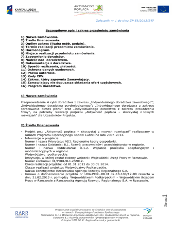 Załącznik nr 1 do siwz ZP 58/2013/BTP Szczegółowy opis i zakres przedmiotu zamówienia 1) Nazwa zamówienia. 2) Źródło finansowania. 3) Ogólny zakres (liczba osób, godzin). 4) Termin realizacji przedmiotu zamówienia. 5) Harmonogram. 6) Miejsce realizacji przedmiotu zamówienia. 7) Zapewnienie doradców. 8) Nadzór nad doradztwem. 9) Dokumentacja z doradztwa. 10) Sposób rozliczenia, płatności. 11) Ochrona danych osobowych. 12) Prawa autorskie. 13) Kody CPV. 14) Zakres, który zapewnia Zamawiający. 15) Zamawiający nie dopuszcza składania ofert częściowych. 16) Program doradztwa. 1) Nazwa zamówienia Przeprowadzenie 4 cykli doradztwa z zakresu „Indywidualnego doradztwa zawodowego”; „Indywidualnego doradztwa psychologicznego”; „Indywidualnego doradztwa z zakresu opracowania biznes planu” oraz „Indywidualnego doradztwa z zakresu prowadzenia firmy”, na potrzeby realizacji projektu „Aktywność popłaca – skorzystaj z nowych rozwiązań” dla Uczestników Projektu. 2) Źródło finansowania Strona 1 - Projekt pn.: „Aktywność popłaca – skorzystaj z nowych rozwiązań” realizowany w ramach Programu Operacyjnego Kapitał Ludzki na lata 2007-2013. - Informacje o projekcie: Numer i nazwa Priorytetu: VIII. Regionalne kadry gospodarki. Numer i nazwa Działania: 8.1. Rozwój pracowników i przedsiębiorstw w regionie. Numer i nazwa Poddziałania: 8.1.2. Wsparcie procesów adaptacyjnych i modernizacyjnych w regionie. Województwo: podkarpackie. Instytucja, w której został złożony wniosek: Wojewódzki Urząd Pracy w Rzeszowie. Numer konkursu: 31/POKL/8.1.2/2012. Okres realizacji projektu: od 01.01.2013 do 30.09.2014. Obszar realizacji projektu: Województwo Podkarpackie. Nazwa Beneficjenta: Rzeszowska Agencja Rozwoju Regionalnego S.A. - Umowa o dofinansowanie projektu nr UDA-POKL.08.01.02-18-180/12-00 zawarta w dniu 21.02.2013 r. pomiędzy Województwem Podkarpackim – Wojewódzkim Urzędem Pracy w Rzeszowie a Rzeszowską Agencją Rozwoju Regionalnego S.A. w Rzeszowie. Projekt jest współfinansowany ze środków Unii Europejskiej w ramach Europejskiego Funduszu Społecznego Podziałanie 8.1.2 Wsparcie procesów adaptacyjnych i modernizacyjnych w regionie, Działanie 8.1 Rozwój pracowników i przedsiębiorstw w regionie, Priorytet VIII PO KL Regionalne kadry gospodarki 3) Ogólny zakres (liczba osób, godzin) Przedmiot zamówienia składa się z 4 cykli indywidualnego doradztwa dla: 1. „Indywidualne doradztwo zawodowe” z zakresu określenia predyspozycji, zainteresowań, uzdolnień, zakończone opracowaniem własnej ścieżki wsparcia IPD – prowadzone przez doradcę zawodowego, maksymalnie dla 70 Uczestników Projektu (3 h/ 1 os. x 70 osób = 210 godzin). 2. „Indywidualne doradztwo psychologiczne”- indywidualne spotkania Uczestników Projektu z psychologiem w celu określenia barier i pomocy w ich przełamywaniu; z zakresu przystosowania się do nowej sytuacji związanej z utratą pracy i radzenia sobie z nią, maksymalnie dla 70 Uczestników Projektu (3 h/ 1 os. x 70 osób = 210 godzin). 3. „Indywidualne doradztwo z zakresu opracowania biznes planu” – w celu przygotowania wniosku i biznes planu w zależności od zakresu planowanej działalności, maksymalnie dla 50 Uczestników Projektu (3 h/ 1 os. x 50 osób = 150 godzin). 4. „Indywidualne doradztwo z zakresu prowadzenia firmy” – zagadnienia księgowe, prawne, prawidłowe rozliczenie dotacji, maksymalnie dla 40 Uczestników Projektu (3 h/ 1 os. x 40 osób = 120 godzin). Łączna liczba godzin doradztwa: 210 + 210 + 150 + 120 = 690 godzin Miejsce świadczenia doradztwa: w Rzeszowie, zgodnie z wcześniej ustalonym harmonogramem doradztwa. Dojazdy i koszty dojazdu doradców do miejsca świadczenia usługi zapewnia Wykonawca. Uczestnikami projektu jest 70 dorosłych osób bezrobotnych lub nieaktywnych zawodowo z terenu województwa podkarpackiego, którzy utracili prace z przyczyn dotyczących zakładu pracy. Zamawiający przewiduje realizację: a) „Indywidualnego doradztwa zawodowego” oraz „Indywidualnego doradztwa psychologicznego” prowadzonego równolegle w tym samym czasie dla maksymalnie 70 Uczestników Projektu. b) „Indywidualne doradztwo z zakresu opracowania biznes planu” prowadzonego równolegle w tym samym czasie dla maksymalnie 50 Uczestników Projektu. c) „Indywidualne doradztwo z zakresu prowadzenia firmy” prowadzonego równolegle w tym samym czasie dla maksymalnie 40 Uczestników Projektu W związku z tym Wykonawca będzie zobowiązany zapewnić kilku doradców do realizacji usługi doradczej, w zależności od rodzaju doradztwa, ilości Uczestników Projektu oraz terminu w którym usługa doradcza musi zostać zrealizowana. Szczegóły odnośnie ww. zależności opisane zostały w pkt. 4 „Termin realizacji przedmiotu zamówienia”. Strona 2 Uwagi ogólne: Godzina doradztwa: 60 min. Przedmiot zamówienia obejmuje w szczególności: organizację, obsługę techniczną, zapewnienie doradców, nadzór nad osobami prowadzącymi doradztwo, doradztwo merytoryczne z ww. zagadnień, zapewnienie miejsca w którym świadczone będzie doradztwo, przygotowanie i wydanie Karty Doradztwa oraz Indywidualnego Planu Działania dla każdego Uczestnika Projektu. Projekt jest współfinansowany ze środków Unii Europejskiej w ramach Europejskiego Funduszu Społecznego Podziałanie 8.1.2 Wsparcie procesów adaptacyjnych i modernizacyjnych w regionie, Działanie 8.1 Rozwój pracowników i przedsiębiorstw w regionie, Priorytet VIII PO KL Regionalne kadry gospodarki 4) Termin realizacji przedmiotu zamówienia Każdy z 4 cykli doradztwa musi zostać zakończony, aby możliwe było rozpoczęcie kolejnego. Projekt jest współfinansowany ze środków Unii Europejskiej w ramach Europejskiego Funduszu Społecznego Podziałanie 8.1.2 Wsparcie procesów adaptacyjnych i modernizacyjnych w regionie, Działanie 8.1 Rozwój pracowników i przedsiębiorstw w regionie, Priorytet VIII