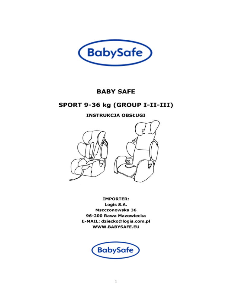 BABY SAFE SPORT 9-36 kg (GROUP I-II-III) INSTRUKCJA OBSŁUGI IMPORTER: Logis S.A. Mszczonowska 36 96-200 Rawa Mazowiecka E-MAIL: [email protected] WWW.BABYSAFE.EU 1 Ważne uwagi !!! Dla bezpieczeństwa waszego dziecka prosimy uważnie przeczytać instrukcję obsługi i zachować ją w bocznej kieszonce fotelika. ▲Proszę zamocować fotelik zgodnie z instrukcją obsługi, każdy inny montaż będzie niebezpieczny dla Państwa dziecka. ▲Dzieci o wadze 9-18 kg (Grupa I) muszą być przypięte 5-puntkowymi pasami fotelika. ▲Dzieci o wadze 15-36 kg (Grupa II III) mogą być przypięte 3-punktowym pasem samochodu. ▲Bagaż oraz inne przedmioty mogące zaszkodzić dziecku podczas kolizji powinny być zabezpieczone. ▲Fotelik powinien być zamocowany przodem do kierunku jazdy , 3-puntkowym pasem. Upewnij się , że pas biodrowy umieszczony jest nisko, a miednica dobrze zabezpieczona. ▲Fotelik samochodowy powinien być używany tylko w samochodzie , zgodnie z przeznaczeniem. ▲Fotelik powinien być zabezpieczony 3-punktowym pasem nawet jeżeli jest nie używany. Niezabezpieczony fotelik może zranić pasażerów podczas nagłego hamowania. ▲Nie pozostawiać dzieci w fotelikach bez opieki ! ▲Klamra pasów nie stanowi zabawki i dziecko nie powinno się nią bawić! ▲Fotelik pasuje tylko do samochodów z 3-puntkowym pasem bezpieczeństwa, zatwierdzonych zgodnie z normą ECE Nr 16 . ▲Fotelik powinien zostać wymieniony na nowy jeżeli uległ uszkodzeniu podczas wypadku ▲Jeżeli fotelik, ma zdjętą tapicerkę, nie powinien być wystawiany na działanie promieni słonecznych, w innym wypadku fotelik może być za gorący dla skóry dziecka. ▲Fotelika nie wolno używać bez tapicerki. Proszę używać oryginalnych tapicerek, ponieważ stanowią one integralną część fotelika niezbędną do zapewnienia właściwego bezpieczeństwa. ▲Wszystkie pasy mocujące fotelik powinny być naciągnięte mocno, pasy którymi przypięte jest dziecko powinny być odpowiednio dopasowane. Pasy nie mogą być skręcone. ▲Wprowadzanie zmian w konstrukcji fotelika oraz używanie go niezgodnie z instrukcją obsługi może być niebezpieczne. ▲Nie przypinaj fotelika za pomącą innych miejsc niż oznaczone w instrukcji i na foteliku. ▲Instukcja dotycząca zapinania dziecka w foteliku powinna być zawsze przestrzegana. ▲Warunki prania tapicerki: nie suszyć w suszarce nie prasować prać w 30° 2 nie używać wybielaczy UWAGA To jest fotelik “uniwersalny” . Jest dopuszczony normą ECE R44/04 , do użytku w samochodach. Będzie pasował do większości samochodów, ale nie do wszystkich. Fotelik będzie można poprawnie zamontować w samochodzie , jeżeli jego producent w instrukcji obsługi napisał , że samochód jest przystosowany do fotelików z oznaczeniem “Universal” dla danej grupy wagowej. Fotelik dostał kategorię “Universal” na podstawie testów bardziej restrykcyjnych niż te zawarte w obowiązującej normie. W razie jakichkolwiek wątpliwości prosimy o kontakt z producentem lub dystrybutorem. UWAGA: Fotelik pasuje tylko do samochodów posiadających 3-puntkowe pasy, zatwierdzone przez normę ECE Nr 16 lub inny równoważny standard. 1.1 Mocowanie fotelika 3 – puntkowym pasem (Grupa I) Otwórz klamrę fotelika. 1.2 Przymocuj fotelik do samochodu za pomocą 3-punktowego pasa bezpieczństwa tak jak to pokazano na schemacie. Uwaga: 1.Odblokuj klamrę. 2.Pas barkowy powinien przechodzić pod zagłówkiem, ale nie przez uchwyt w kształcie haka. 1.3 Zapnij klamrę pasa ze słyszalnym kliknięciem. 3 1.4 Skasuj luz na basie biodrowym i barkowym. 1.5 Umieść pas barkowy w klamrze i zablokuj ją. 2.1 -2.6 Używanie pasów 5-punktowych fotelika. 2.1 W celu wydłużenia pasów naciśnij i przytrzymaj klamrę na środku siedziska (1) i pociągnij pasy barkowe (2) na dół. 2.2 Rozepęci pasów następuje poprzez naciśnięcie czerwonego przycisku na klamrze. 2.3 Rozsuń pasy barkowe na boki. 2.4 Umieść dziecko w foteliku i przełóż jego ramiona pod pasy barkowe. . 4 2.5 Zapnij pasy składając dwie połówki klamry razem (1) następnie umieszczając je w zamku z wyraźnym kliknięciem. 2.6 Zlikwiduj luzy pasów pociągając środkowy pas na dole siedziska. Pasy powinny być zapięte ciasno. 2.7-2.8 Regulacja wysokości pasów. 2.7 Naciśnij czerwony przycisk blokady i ustaw zagłówek w następnej pozycji. 2.8 Pasy barkowe powinny przebiegać tak jak na schemacie. 3.1 Zdejmowanie tapicerki. 5 Wkładka pomniejszająca może być zdemontowana w zależności od wielkości dziecka, ale nie póżniej niż po demontażu pasów 5-puntkowych. 3.2-3.6 Zdejmowanie pasów 5-punktowych: 3.2 Zdejmij końcówkę pasów (1): Naciśnij przycisk regulacji pasów (2) , następnie wyciągnij pasy z tyłu. 3.3 Pociągnij pasy barkowe z przodu. 3.4 Zdejmij ochranicze z pasów barkowych. Następnie zdemontuj zdemontuj pasy. 3.5 Zdejmij częściowo tapicerkę i wyciągnij pasy biodrowe od spodu fotelika. 3.6 Odczep metalową płytkę zabezpieczającą klamrę po spodniej stronie fotelika i 6 wyciągnij klamrę. 4.1-4.3 Mocowanie fotelika i za pinanie dziecka 3-punktowym pasem (Grupa II III – z oparciem) 4.1 Wyciągnij pas samochodowy, przeciągnij pas barkowy pod zagłówkiem po jednej stronie. Następnie przeprowadź pas biodrowy przez otwory pod podłokietnikami po obu stronach .Następnie wepnij klamrę pasa z wyraźnym kliknięciem. 4.2 Umieść pas barkowy pod zagłówkiem. Uwaga: 1.Nie używać czerwonej klamry do blokowania pasa. 2.Pas powinien przechodzić pod zagłówkiem, przez hak. 4.3 Dostosuj wysokość zagłówka do wzrostu dziecka. Tak jak to pokazano na rysunku 2.7. Ważne, żeby ramiona nie były wyżej niż pasy , jak na rysunku 2.8 Pas biodrowy powinien przechodzić pod obydwoma podłokietnikami (Rysunek 4.3) inny przebieg pasa nie będzie bezpieczny. 7