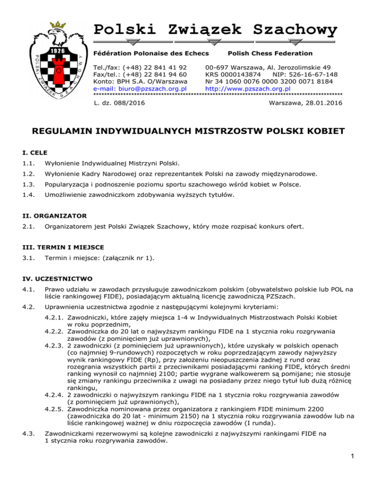 Polski Zwi¹zek Szachowy Fédération Polonaise des Echecs Tel./fax: (+48) 22 841 41 92 Fax/tel.: (+48) 22 841 94 60 Konto: BPH S.A. O/Warszawa e-mail: [email protected] Polish Chess Federation 00-697 Warszawa, Al. Jerozolimskie 49 KRS 0000143874 NIP: 526-16-67-148 Nr 34 1060 0076 0000 3200 0071 8184 http://www.pzszach.org.pl ******************************************************************************************** L. dz. 088/2016 Warszawa, 28.01.2016 REGULAMIN INDYWIDUALNYCH MISTRZOSTW POLSKI KOBIET I. CELE 1.1. Wyùonienie Indywidualnej Mistrzyni Polski. 1.2. Wyùonienie Kadry Narodowej oraz reprezentantek Polski na zawody miêdzynarodowe. 1.3. Popularyzacja i podnoszenie poziomu sportu szachowego wœród kobiet w Polsce. 1.4. Umo¿liwienie zawodniczkom zdobywania wy¿szych tytuùów. II. ORGANIZATOR 2.1. Organizatorem jest Polski Zwi¹zek Szachowy, który mo¿e rozpisaã konkurs ofert. III. TERMIN I MIEJSCE 3.1. Termin i miejsce: (zaù¹cznik nr 1). IV. UCZESTNICTWO 4.1. Prawo udziaùu w zawodach przysùuguje zawodniczkom polskim (obywatelstwo polskie lub POL na liœcie rankingowej FIDE), posiadaj¹cym aktualn¹ licencjê zawodnicz¹ PZSzach. 4.2. Uprawnienia uczestnictwa zgodnie z nastêpuj¹cymi kolejnymi kryteriami: 4.2.1. Zawodniczki, które zajêùy miejsca 1-4 w Indywidualnych Mistrzostwach Polski Kobiet w roku poprzednim, 4.2.2. Zawodniczka do 20 lat o najwy¿szym rankingu FIDE na 1 stycznia roku rozgrywania zawodów (z pominiêciem ju¿ uprawnionych), 4.2.3. 2 zawodniczki (z pominiêciem ju¿ uprawnionych), które uzyskaùy w polskich openach (co najmniej 9-rundowych) rozpoczêtych w roku poprzedzaj¹cym zawody najwy¿szy wynik rankingowy FIDE (Rp), przy zaùo¿eniu nieopuszczenia ¿adnej z rund oraz rozegrania wszystkich partii z przeciwnikami posiadaj¹cymi ranking FIDE, których œredni ranking wynosiù co najmniej 2100; partie wygrane walkowerem s¹ pomijane; nie stosuje siê zmiany rankingu przeciwnika z uwagi na posiadany przez niego tytuù lub du¿¹ ró¿nicê rankingu, 4.2.4. 2 zawodniczki o najwy¿szym rankingu FIDE na 1 stycznia roku rozgrywania zawodów (z pominiêciem ju¿ uprawnionych), 4.2.5. Zawodniczka nominowana przez organizatora z rankingiem FIDE minimum 2200 (zawodniczka do 20 lat - minimum 2150) na 1 stycznia roku rozgrywania zawodów lub na liœcie rankingowej wa¿nej w dniu rozpoczêcia zawodów (I runda). 4.3. Zawodniczkami rezerwowymi s¹ kolejne zawodniczki z najwy¿szymi rankingami FIDE na 1 stycznia roku rozgrywania zawodów. 1 4.4. Kryteria rankingowe, o jakich mowa w punktach: 4.2. i 4.3., dotycz¹ tak¿e zawodniczek nieaktywnych. 4.5. W przypadku równoœci rankingów, pierwszeñstwo ma zawodniczka o wy¿szym tytule FIDE (GM, IM, WGM, WIM, FM, CM, WFM, WCM), a w przypadku dalszego braku rozstrzygniêcia, zawodniczka o wy¿szym rankingu na poprzedniej liœcie rankingowej (operacja powtarzana a¿ do skutku). 4.6. Lista zawodniczek uprawnionych do startu oraz rezerwowych zostanie opublikowana na stronie internetowej PZSzach i stanowi zaù¹cznik nr 2 niniejszego Regulaminu. V. ZG£OSZENIA 5.1. Zawodniczki uprawnione dokonuj¹ zgùoszenia udziaùu, a zawodniczki rezerwowe potwierdzaj¹ gotowoœã udziaùu na adres elektroniczny: organizatora, wiceprezesa ds. sportowych PZSzach i biura PZSzach, w nieprzekraczalnym terminie do 22 dni przed dniem pierwszej rundy (zaù¹cznik nr 1). 5.2. Wraz ze zgùoszeniem nale¿y dokonaã opùat: startowej, organizacyjnej i rankingowej (zaù¹cznik nr 1). 5.3. Zawodniczki rezerwowe, które potwierdziùy gotowoœã udziaùu i nabyùy uprawnienia na skutek rezygnacji zawodniczek uprawnionych, dokonuj¹ opùat wymienionych w punkcie 5.2. w nieprzekraczalnym terminie do 15 dni przed dniem pierwszej rundy. 5.4. W przypadku rozgrywania zawodów w styczniu, terminy zgùoszeñ podane w punktach: 5.1. i 5.3. zostan¹ skorygowane i zamieszczone w zaù¹czniku nr 1. 5.5. W przypadku wycofania siê z zawodów po uprzednim potwierdzeniu udziaùu, poniesione ju¿ opùaty, wymienione w punkcie 5.2., przepadaj¹. 5.6. Ostateczna weryfikacja listy startowej nastêpuje na Odprawie Technicznej. 5.7. Zawodniczki nieobecne na Odprawie Technicznej bez uprzedniej zgody sêdziego gùównego nie zostan¹ dopuszczone do zawodów. VI. SYSTEM ROZGRYWEK, TEMPO GRY 6.1. Zawody rozgrywane s¹ systemem koùowym. 6.2. Tempo gry: 90 minut na 40 posuniêã plus 30 minut na dokoñczenie partii, z dodawaniem 30 sekund na ka¿de posuniêcie od pocz¹tku partii. 6.3. Obowi¹zuj¹ aktualne przepisy FIDE i Kodeks Szachowy PZSzach. 6.4. Zawodniczki, które bez pozwolenia sêdziego zgodz¹ siê na remis przed wykonaniem 40 posuniêã, przegrywaj¹ partiê. VII. OCENA WYNIKÓW 7.1. Kolejnoœã miejsc po 9 rundach ustala siê wedùug nastêpuj¹cych kryteriów: 7.1.1. 7.1.2. 7.1.3. 7.1.4. 7.1.5. 7.1.6. 7.1.7. Suma zdobytych punktów, System Sonneborna-Bergera, Rozszerzony system Koyi (stosowany do ostatniej grupy punktowej), Wyniki bezpoœrednich partii, Liczba zwyciêstw, Wiêksza liczba partii rozegranych czarnymi, Losowanie. VIII. NAGRODY I WYRÓÝNIENIA 8.1. Zwyciê¿czyni otrzymuje tytuù Indywidualnej Mistrzyni Polski. 8.2. Trzy najlepsze zawodniczki otrzymuj¹ medale Indywidualnych Mistrzostw Polski Kobiet. 8.3. Najlepsze zawodniczki uzyskuj¹ uprawnienia opisane w „Regulaminie Kadry Narodowej”. 2 8.4. Informacjê o nagrodach zamieszcza organizator w Komunikacie Organizacyjnym. IX. FINANSOWANIE 9.1. Koszty organizacji ponosi organizator. 9.2. Uczestniczki bior¹ udziaù w zawodach na koszt deleguj¹cych klubów, sponsorów lub wùasny. 9.3. Opùaty: 9.3.1. startow¹, 9.3.2. organizacyjn¹, 9.3.2. rankingow¹, w kwotach ustalonych w Komunikacie Organizacyjno-Finansowym PZSzach i w terminie okreœlonym w punkcie 5.1. lub 5.3., nale¿y wpùaciã na konto PZSzach (zaù¹cznik nr 1). X. SÆDZIOWANIE 10.1. Zawody prowadzi sêdzia gùówny, posiadaj¹cy klasê IA, z pomoc¹ sêdziów asystentów, posiadaj¹cych co najmniej klasê FA. Zawody mog¹ prowadzi