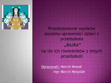 Przedstawienie wyników poziomu sprawności dzieci z przedszkola „BAJKA” na tle ich rówieśników z innych przedszkoli Opracowali: Marcin Nowak mgr Marcin Matysiak Głównym celem testu była ocena poziomu sprawności fizycznej dzieci w naszym przedszkolu. Następnie zestawienie tych wyników z ich rówieśnikami z innych przedszkoli. Do wykonania oceny posłużyliśmy się Wrocławskim Testem Sprawności Fizycznej, który w opracowaniu B. Sekity został odpowiednio zmodyfikowany dla dzieci w wieku przedszkolnym. Narzędzie to pozwoliło na ocenę czterech podstawowych cech motorycznych (zwinność, moc, siła, szybkość) Badaniem zostały objęte dzieci w wieku 3, 4 ,5 i 6 lat z przedszkoli z terenu województwa kujawsko – pomorskiego (Bydgoszcz) oraz dzieci 4 i 5 letnie z województwa zachodnio pomorskiego (Szczecin). Dzieci zostały podzielone na grupy badawcze ze względu na wiek i płeć. Grupa dzieci uczestniczących w zajęciach pływania (z Bydgoszczy) była bazą porównawczą dla dzieci nie uczestniczących w takich zajęciach (ze Szczecina). Każde z dzieci biorące udział w badaniu wykonywało cztery różne próby sprawnościowe określające poziom ich cech motorycznych. Próba polegała na wykonaniu biegu wahadłowego 4x5 m. Próba wykonywana była na płaskim odcinku liczącym 5 m. Długość 5 m., została wyznaczona dwoma liniami, które tworzyły szarfy położone na parkiecie. Na jednej szarfie ustawione były dwa klocki w odległości ok. 20 cm od siebie. Przed drugą z linii ustawione było badane dziecko, któremu podano następującą instrukcję: „Na sygnał dźwiękowy wykonany gwizdkiem pobiegniesz jak najszybciej potrafisz i przyniesiesz klocek. Postawisz go na linii, przed którą teraz stoisz i, nie zatrzymując się, pobiegniesz po drugi klocek. Drugi klocek również postawisz na linii przed którą teraz stoisz. Pamiętaj, że klocków nie wolno rzucać”. Każde z dzieci wykonuje próbę dwukrotnie. Czas wykonania mierzy się z dokładnością do 0,1 s. Natomiast za miarę zwinności przyjmuje się czas próby szybciej wykonanej. Aby wykonać próbę mocy należało zsunąć ze sobą dwa materace gimnastyczne wzdłuż ich krótszych krawędzi. W odległości 30cm od materaca narysowałem kredą białą linię, w odległości 50cm drugą linię i w odległości 100cm – trzecią, Badane dzieci stawały kolejno na początku materaca w taki sposób, aby palce stóp stykały się z jego krawędzią. Następnie dostawały następującą instrukcje: „Ugnij lekko nogi i postaraj się skoczyć jak potrafisz najdalej. Pamiętaj, aby odbić się jednocześnie z dwóch nóg i skoczyć tak, aby stopy po wylądowaniu znajdowały się jak najbliżej siebie”. Każde z dzieci wykonywało 4 skoki, z czego jeden był próbny, a trzy mierzone. Długość wykonywanych skoków mierzone były z dokładnością do 1 centymetra. Za miarę mocy przyjęto długość najdalej wykonanego skoku. Trzecia z prób czyli próba siły polegała na wykonaniu rzutu piłką lekarską o masie 1kg znad głowy. Badane dzieci stawały kolejno w lekkim rozkroku przy linii początkowej, tak aby paluchy stóp dotykały linii początkowej. Następnie otrzymywały instrukcję wykonania próby: „Twoim zadaniem jest rzucenie piłki znad głowy, jak umiesz najdalej, ponad zawieszoną taśmę”. Każde z dzieci wykonywało w sumie po 5 rzutów, na które składały się dwa rzuty próbne i trzy mierzone. Odległości wykonywanych rzutów mierzone były z dokładnością do 10 cm. Za miarę siły przyjęto największą odległość, na jaką dziecko wykonało rzut, w jednej z trzech prób. Próba szybkości polegała na wykonaniu biegu na odległość 20 m ze startu wysokiego. Na wyznaczonej powierzchni o długości ok. 40 m i szerokości 20 m na krótko ściętej trawie bez górek i wzniesień. Na wyżej opisanej powierzchni wyznaczony został odcinek o długości 25 m. Na początku linii, za pomocą dwóch żółtych pachołków ustawionych w odległości 60 cm od siebie, wyznaczone zostało miejsce startu. Następnie w odległości 20 m od linii startu wyznaczona została linia pomiaru czasu, a 5 m dalej ustawione zostały dwa czerwone pachołki, takie same jak te przy linii wyznaczającej start, które sygnalizowały dzieciom biorącym udział w próbie linię mety. Badane dzieci stawały na linii i otrzymywały następującą instrukcję: „Na sygnał START pobiegniesz najszybciej jak potrafisz do czerwonych pachołków”. Każde z dzieci wykonywało próbę dwukrotnie, biegnąc indywidualnie. Czas próby mierzony był z dokładnością do 0,1 s. Natomiast za miarę szybkości biegowej dziecka uważa się czas próby lepszej, wykonanej szybciej. Każda z wykonywanych prób była poprzedzona pokazem aby zobrazować i ułatwić jej wykonanie. Po każdej wykonanej próbie dzieci otrzymywały pochwały, które sprawiały u dzieci poczucie zadowolenia i satysfakcji z prawidłowo wykonanego zadania. Według wytycznych ustalonych przez twórców testu żeby ocenić sprawność fizyczną dziecka należało: Obliczyć wiek metrykalny dziecka (z dokładnością do 1 miesiąca) w dniu badań. Ustalić kategorię wiekową dziecka. Do grupy 4 – latków zaliczało się dzieci, które w dniu badania miały ukończone 3 lata i 6 miesięcy, ale nie przekroczyły 4 lat i 5 miesięcy. To samo tyczy się grupy 5 – latków do których należały dzieci w przedziale wiekowym od 4 lat i 6 miesięcy do 5 lat i 5 miesięcy. Przeprowadzić próby sprawnościowe podane w teście. Odczytać w tabelach punktacji liczbę punktów przypisaną danej wielkości pomiaru testowego. Przy odczytywaniu należało zwrócić uwagę na wiek i płeć dziecka. Zsumować liczbę punktów, jaką uzyskało dziecko za wykonanie wszystkich czterech prób. Punktacja proponowana dla pojedynczych prób: Do 39 pkt. – niski, niedostateczny poziom cechy, 40 – 49 pkt. – dostateczny poziom cechy, 50 – 59 pkt. – dobry p