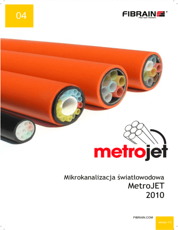 04 Mikrokanalizacja światłowodowa MetroJET 2010 FIBRAIN.COM wersja 1.0 04 Rozwiązania i systemy światłowodowe Mikrokanalizacja MetroJET Spis treści 3 3 5 6 7 8 10 11 12 12 13 14 15 16 17 18 19 20 21 22 23 24 26 27 28 29 31 32 33 35 36 Spis treści Mikrokanalizacja światłowodowa MetroJET 002 Wstęp do mikrokanalizacji światłowodowej Opis systemu: Elementy systemu mikrokanalizacji Obszary możliwych zastosowań Analiza porównawcza do technologii tradycyjnej Systemy szkoleniowe Tabele kompatybilności Wsparcie techniczne, projektowe i koncepcje Mikrowiązki światłowodowe Mikrokable światłowodowe MK-CX2 MK-DX2 MK-CX3 MK-LX4 MK-LX6 MK-LX7 MK-LX8 Mikrorurki, wiązki mikrorur i rury prefabrykowane Mikrorurki Wiązki foliowane Rury prefabrykowane wturne Rury prefabrykowane uniwersalne Rury doziemne, dwupłaszczowe Osprzęt połączeniowy mikrorurek i rur prefabrykowanych Obudowy liniowe do łączenia rur mikrokanalizacji Złączki mikrorur i mikrorurek Zatyczki do mikrorurek Uszczelnienia i przepusty Uszczelnienia rur i mikrowiązek Przepusty mikrokanalizacji Szafy dystrybucyjne FDH i SCUB Szafki FDH Rura FlexiJET Szafy uliczne Narzędzia instalatorskie Wdmuchiwarki i sprzęt instalacyjny FIBRAIN.COM Rozwiązania i systemy światłowodowe Mikrokanalizacja MetroJET Opis systemu - wstęp 04 Wstęp do mikrokanalizacji światłowodowej Mikrokanalizacja swiatlowodowa MetroJET jest odpowiedzia na stale rosnace zapotrzebowanie na pojemne systemy kanalizacji teletechnicznej. System ten jest funkcjonalnym odpowiednikiem wielootworowej kanalizacji teletechnicznej o zmniejszonych srednicach wszystkich elementów i przeznaczonej do instalowania mikrokabli swiatlowodowych przy pomocy metody strumieniowej. Podstawowym elementem systemu jest mikrorurka (zwana czasem mikrotuba) wykonana z HDPE i o srednicach zawierajacych sie w zakresie od 3 mm do 16 mm. Mikrorurka jest odpowiednikiem funkcjonalnym rur wtórnych typu RHDPE w kanalizacji standardowej. Do mikrorurki wdmuchiwane sa specjalne mikrokable swiatlowodowe o materiale powloki i srednicach dobranych do srednicy mikrorurki. Mikrorurki moga byc formowane w wiazki mikrorurek (swobodne, foliowane oraz jako rury prefabrykowane) i jako takie sa najczesciej dostarczane na plac budowy. Wiazki mikrorurek moga byc równiez instalowane w istniejacej kanalizacji teletechnicznej przy uzyciu metod mechanicznych (zaciaganie) lub pneumatycznych. Mikrokanalizacja umożliwia budowę sieci światłowodowej o dużej ilości włókien oraz jej etapową i elastyczną rozbudowę, przez wdmuchiwanie kolejnych wiązek lub mikrokabli światłowodowych dla projektów wchodzących do realizacji w następnych etapach. System mikrokanalizacji umożliwia projektowanie sieci światłowodowej bez koniecznej nadmiarowości. Pozwala lepiej optymalizować zakresy rzeczowe budowy, koszty poszczególnych etapów inwestycji, ale przede wszystkim zapewni wymaganą pojemność budowanej sieci teletechnicznej na lata przyszłe. Kompletny system powinien oferować kompatybilne rozwiązania w zakresie pojedynczych produktów (mikrokabli światłowodowych, osprzętu i akcesoriów połączeniowych) oraz usług doradczych i wdrożeniowych. Dzięki temu inwestor otrzymuje gotowe rozwiązanie dla nawet najbardziej rozbudowanych systemów wraz z gwarancją rozwoju sieci w przyszłości. Elementy systemu mikrokanalizacji dobrano pod kątem ich maksymalnej kompatybilności, po to aby zapewnić odpowiednie parametry eksploatacyjne takie jak: - zasięg wdmuchiwania mikrokabla światłowodowego, szybkość wdmuchiwania mikrokabla światłowodowego, wytrzymałość mechaniczną oraz pneumatyczną elementów mikrokanalizacji. Wykorzystano w tym celu produkty o wysokich walorach użytkowych nie zapominając o ich atrakcyjnej cenie. FIBRAIN.COM Kompletny system to także rzesza wykształconych projektantów i instalatorów, którzy przeszli system szkoleń i uzyskali odpowiednie certyfikaty. Nad jakością wdrażanych projektów czuwa program gwarancyjny oparty o autorskie normy zakładowe dla mikrokanalizacji, system certyfikacji oraz gwarancje materiałowe dla poszczególnych produktów. Dobra jakość produktów, wysoki stopień wiedzy technicznej instalatorów i projektantów pozwala na udostępnienie Inwestorom wydłużonej gwarancji systemowej (warunki na życzenie). Szeroka gama produktów umożliwia zastosowanie nowej technologii w praktycznie każdych warunkach: od istniejących już sieci teletechnicznych do nowobudowanych sieci miejskich typu MAN przez małe sieci FTTx (osiedla, małe lokalizacje). Opis systemu - wstęp Rozwiązania systemowe 003 Mikrokanalizacja światłowodowa MetroJET Mikrokanalizacja jest polecana do budowy operatorskich sieci swiatlowodowych, miejskich sieci samorządowych, w projektach FTTH, a także sieci następnej generacji (NGN). Rozwiązania i systemy światłowodowe Mikrokanalizacja MetroJET Elementy systemu 04 Elementy systemu MetroJET Podstawowym elementem systemu są mikrorurki o średnicach zewnętrznych od 3 do 16 mm otwierające nowe możliwości w zakresie projektowania i budowy kanalizacji telekomunikacyjnej. Mikrorurki są wykorzystywane do zwielokrotnienia liczby otworów rurociągu w ramach istniejącej kanalizacji wtórnej poprzez wdmuchiwanie lub zaciąganie mechaniczne nawet do kilkudziesięciu mikrorurek o różnych średnicach. Szeroka gama średnic pozwala na łatwe dostosowanie do wymaganej pojemności i przyszłych zastosowań budowanej kanalizacji. Występują w wersji standardowej,doziemnej oraz w wersji uniepalnionej. Mikrorurki mogą być łączone w prefabrykowane wiązki foliowane (typu MT-WFx) i jako takie instalowane w istniejącej kanalizacji pierwotnej, w rurach wtórnych lub bezpośrednio w ziemi. Istnieje również możliwość wykonania wiązki z kablem (zasilającym, światłowodowym, koncentrycznym). Do łączenia mikrorurek, wykonywania uszczelnień pomiędzy mikrorurkami a rura RHDPE lub kablem i mikrorurką potrzebne są n